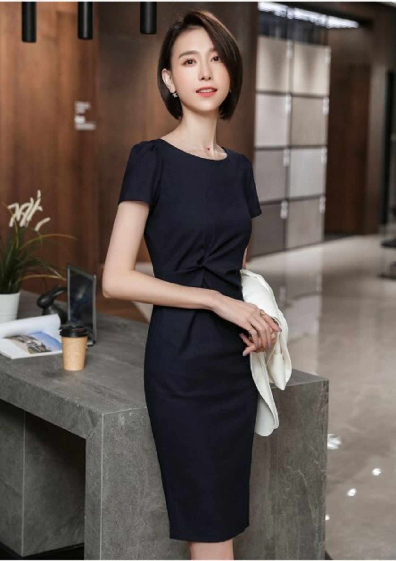 全3色 ひざ丈ワンピース ミドルウェスト ポリエステル シフォン 無地 ラウンドネック 半袖 バックシャン 上品 OL 通勤