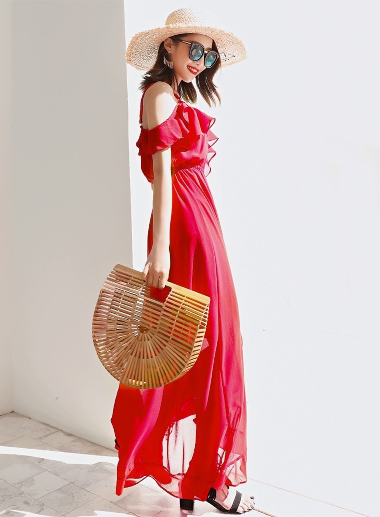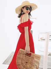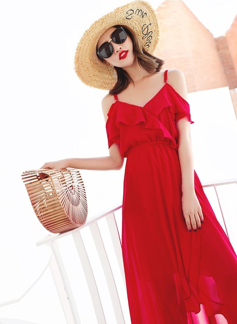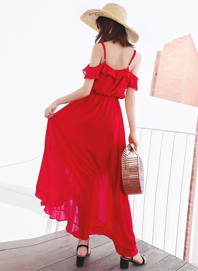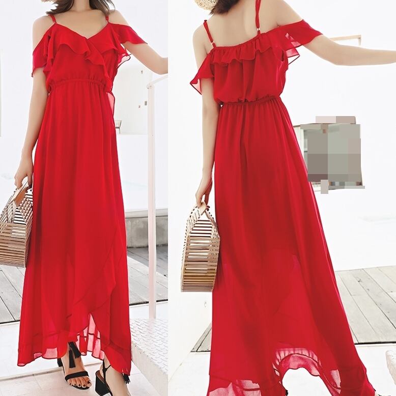 キャミワンピース ドレス ロング丈 マキシ丈 ストラップショルダー レッド シフォン タキシードドレス 海 ビーチ セクシー レース ハイウエスト ボヘミアン ガーリー Vネック
