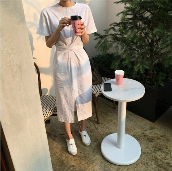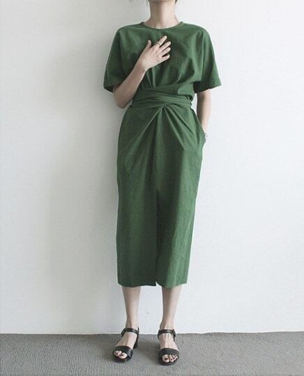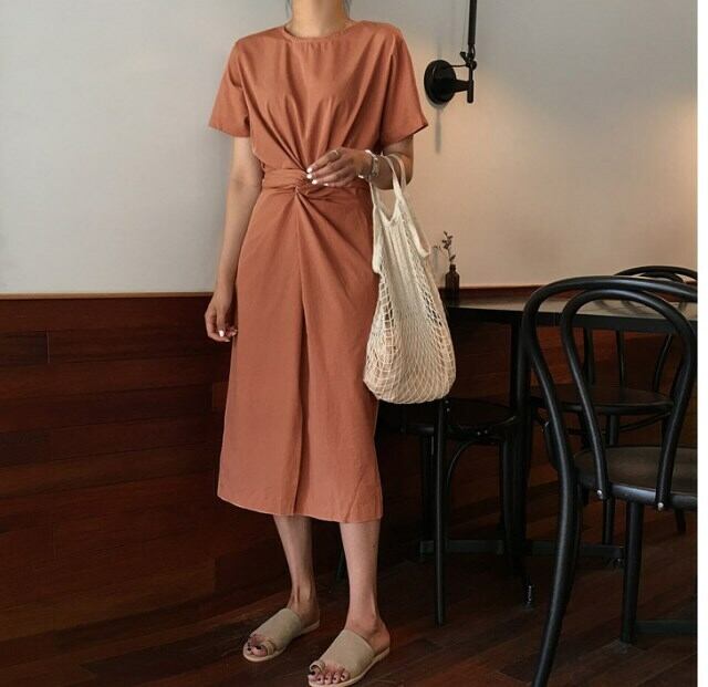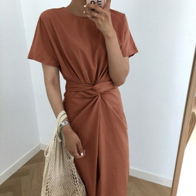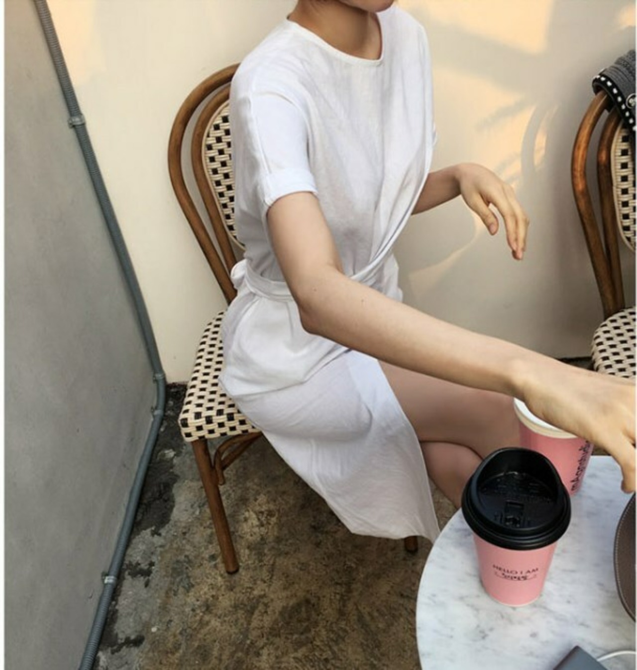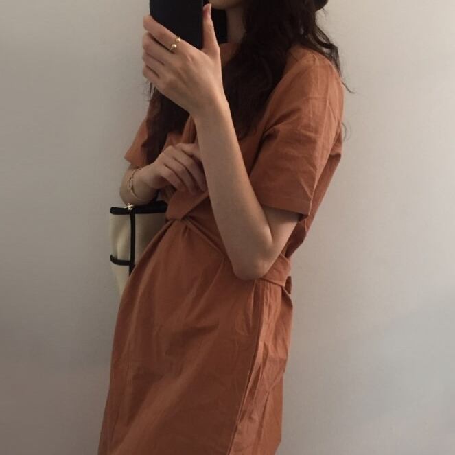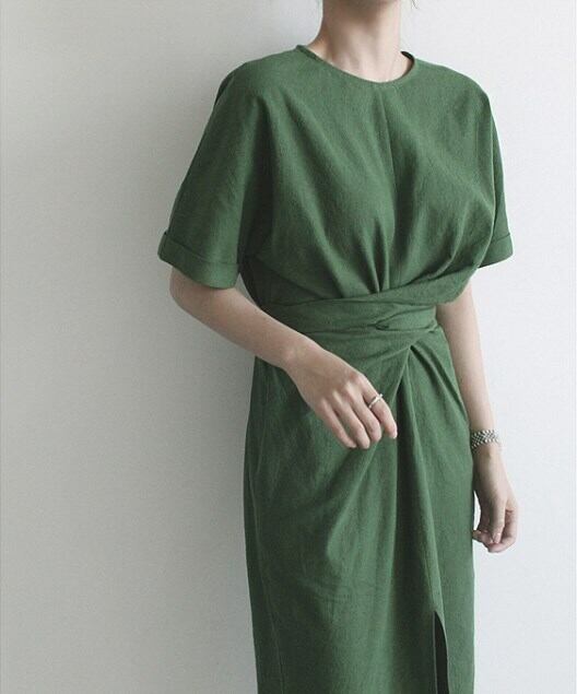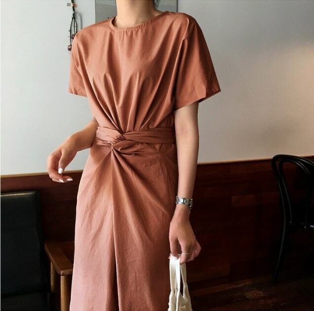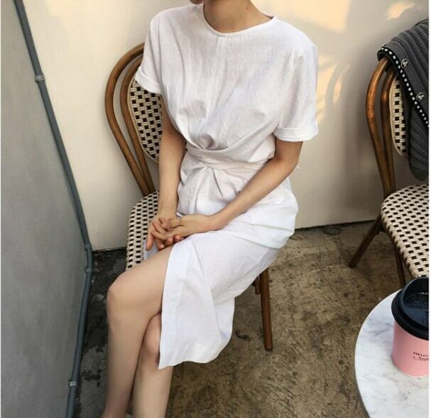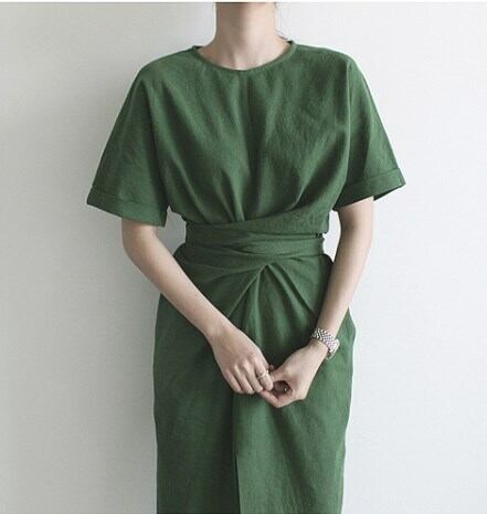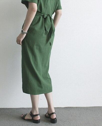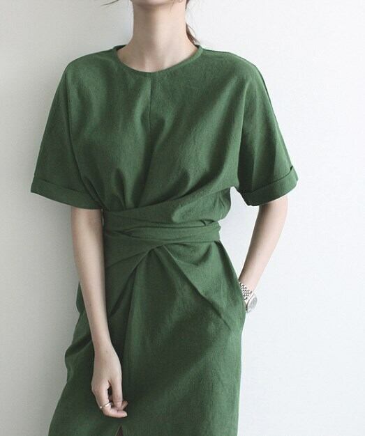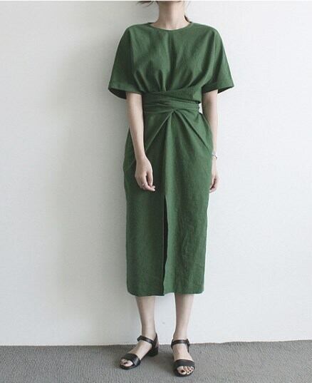 全3色 ひざ丈ワンピース スリット ウェストベルト 半袖 ラウンドネック 無地 コットン バックシャン
