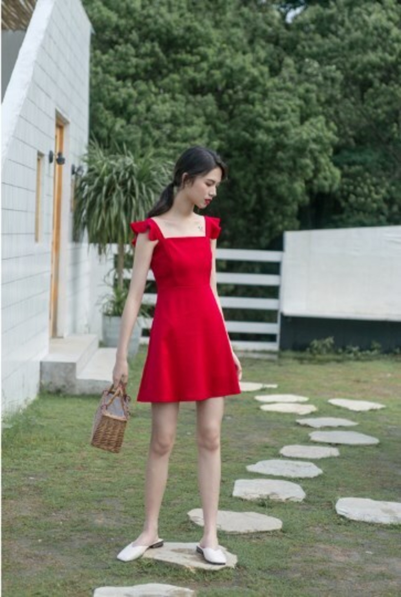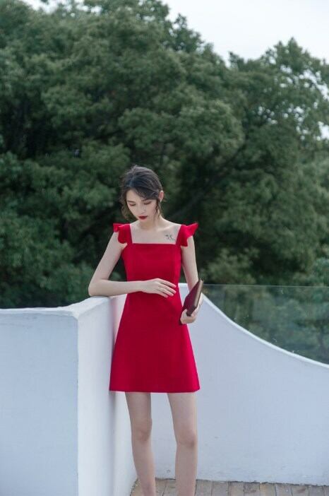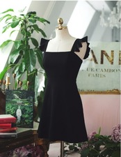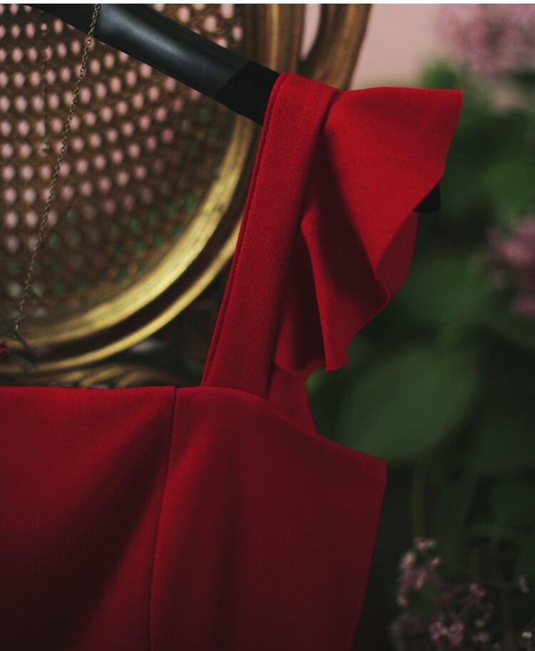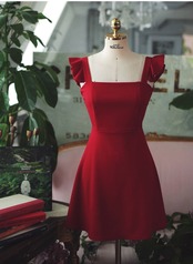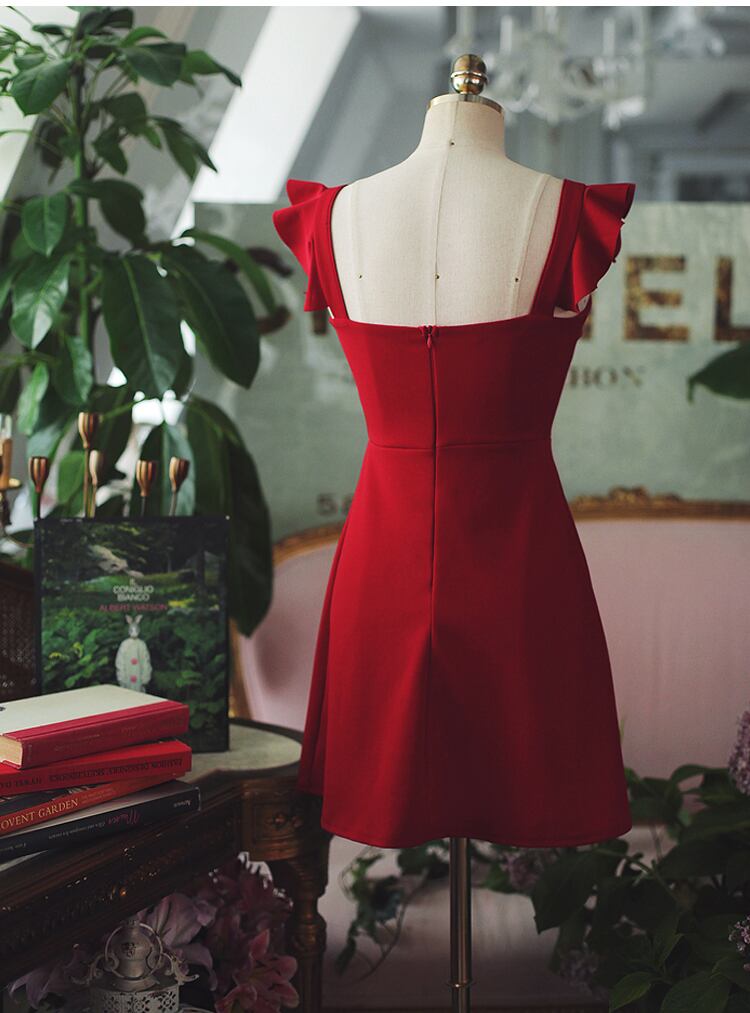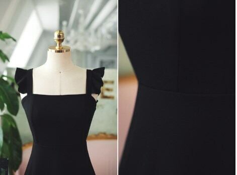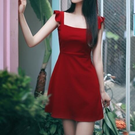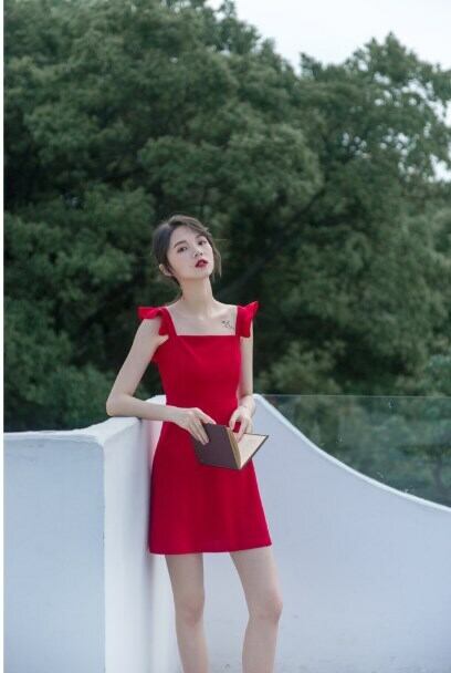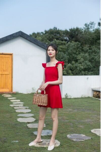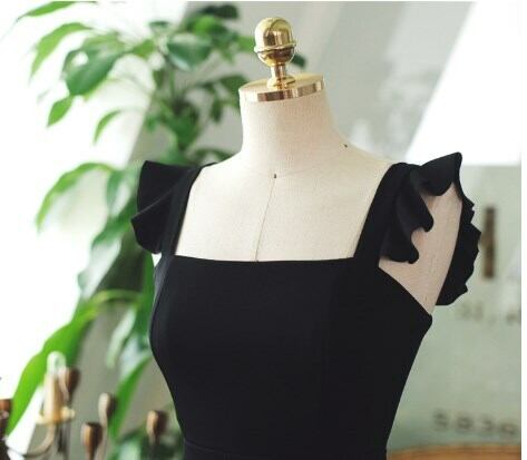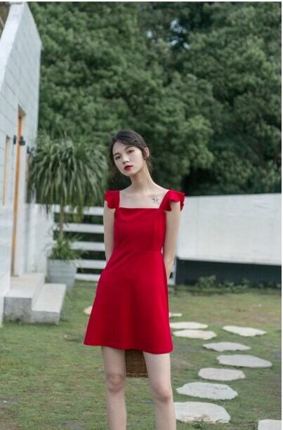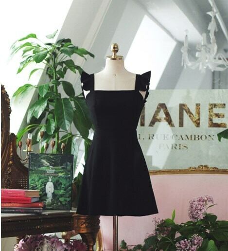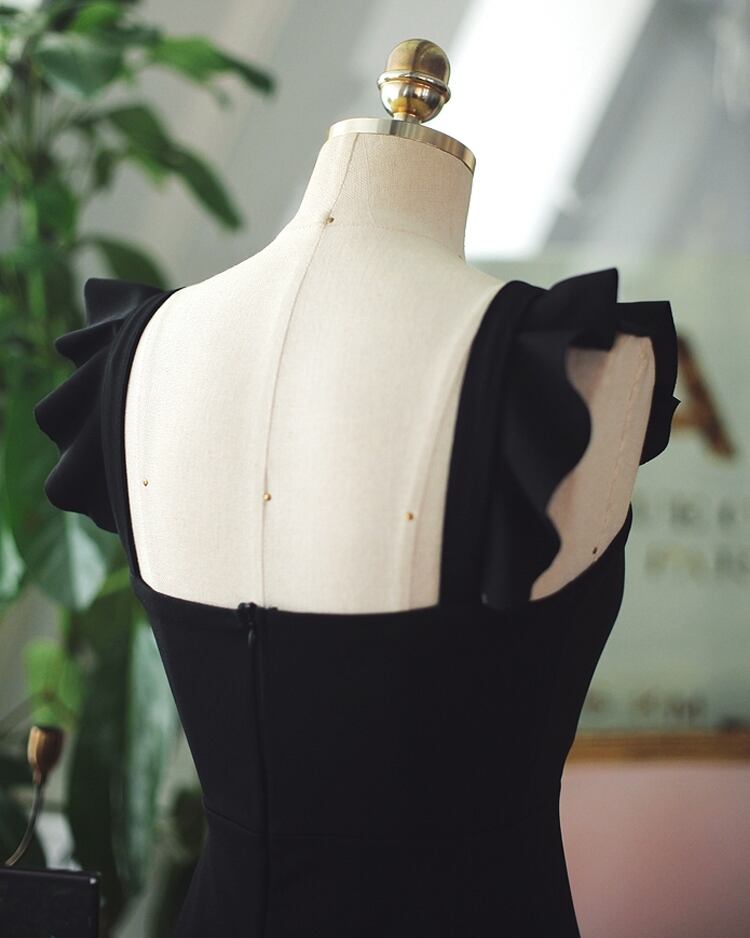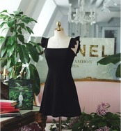 全2色 ショート丈ワンピース シフォン フリル ノースリーブ ミドルウェスト スクエアネック 無地 背中見せ バックシャン お出かけ