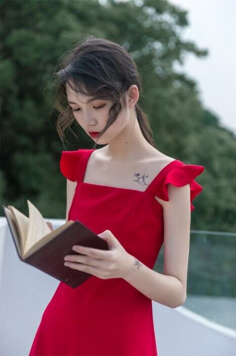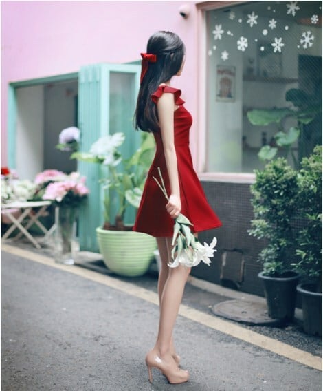 肩のフリルが女性らしくてかわいいノースリーブワンピース。