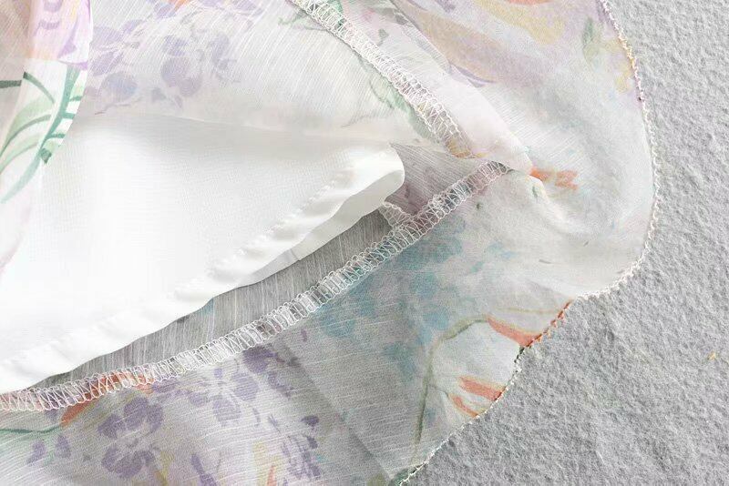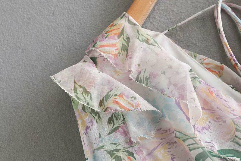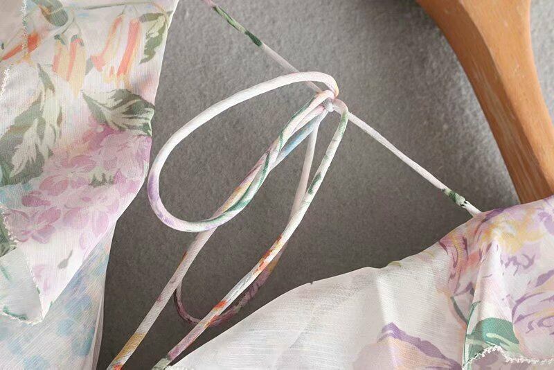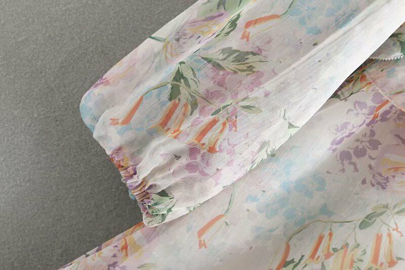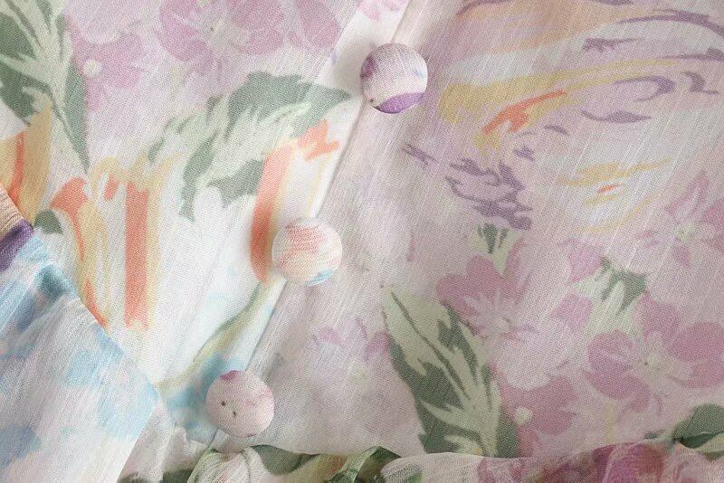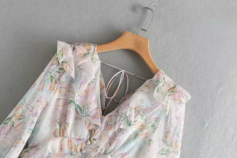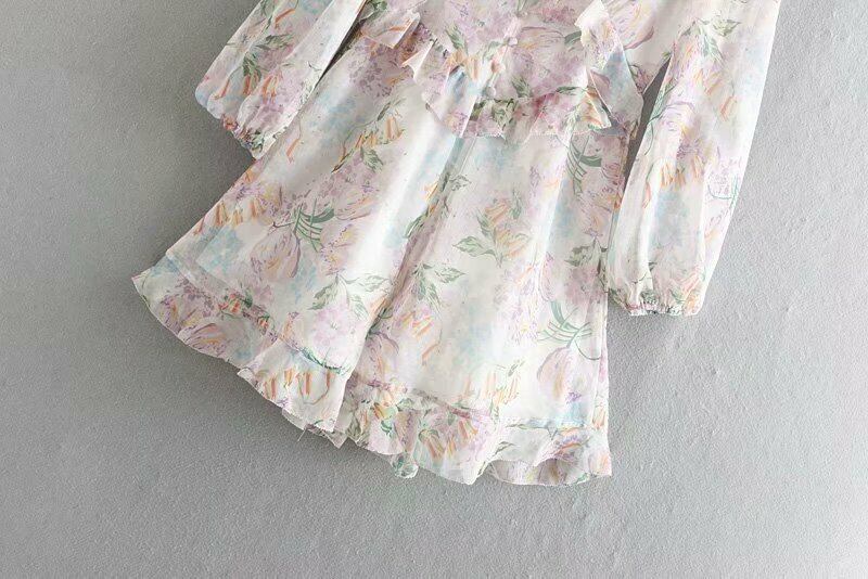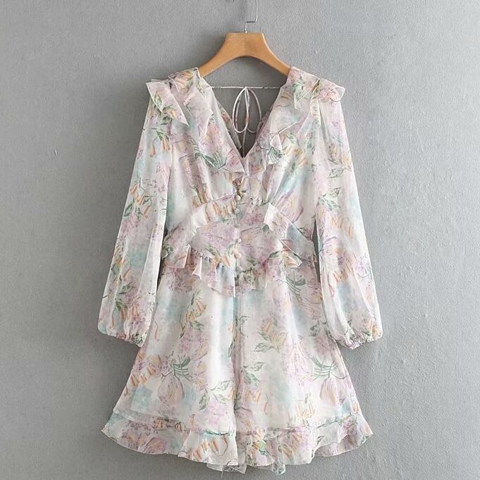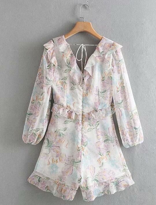 オールインワン ジャンプスーツ フレア 甘め 長袖 花柄 前ボタン フリル 夏 かわいい Vライン スィート