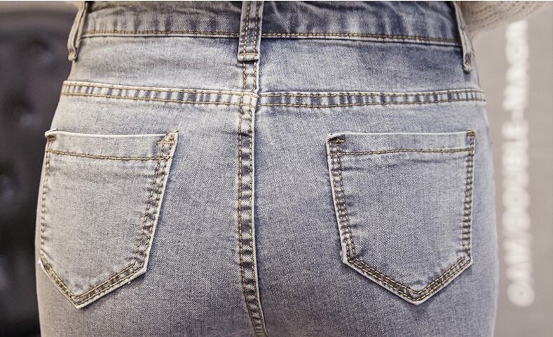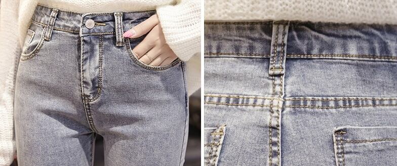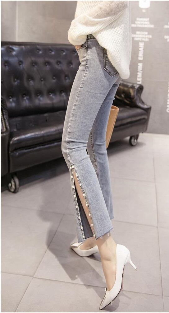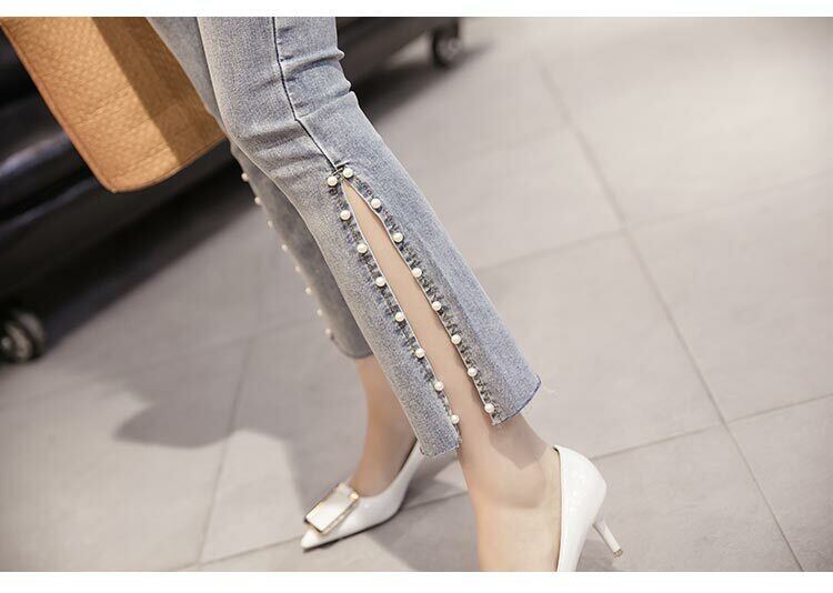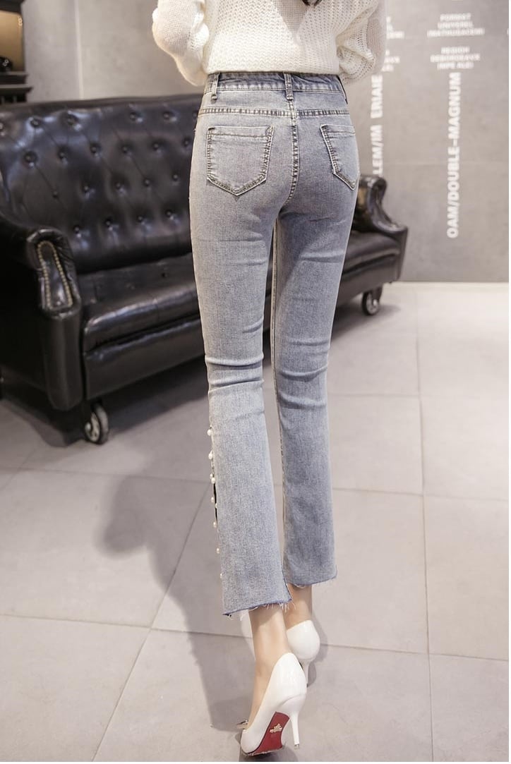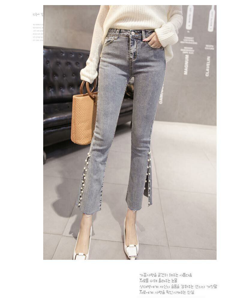 デニム ストレッチ パンツ ビジュー スリット 7分丈 ジーンズ パール