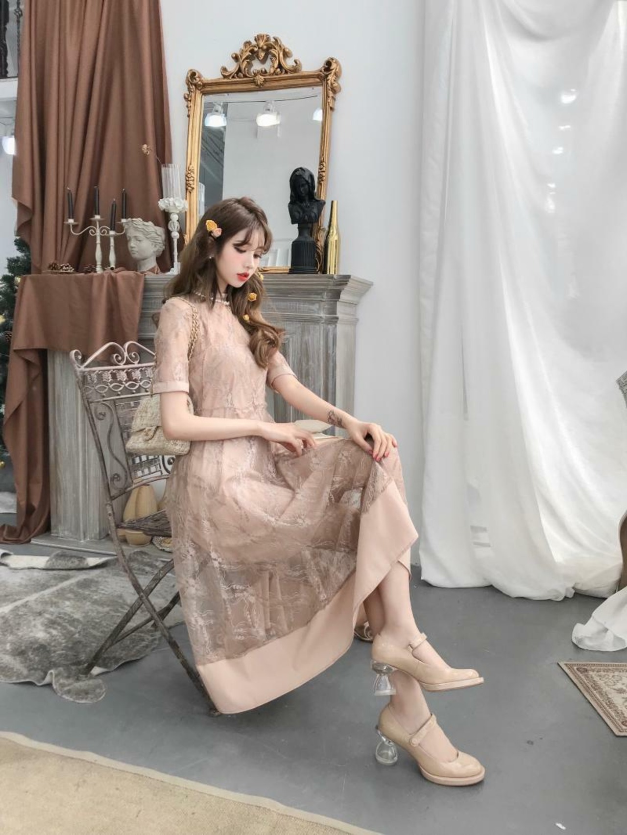 全2色 ワンピース ドレス 袖有り バックリボン Aライン ひざ下 ミモレ丈 花柄 シースルーキャミソール 肩ひも 重ね着 シースルー レース パーティー 春夏秋