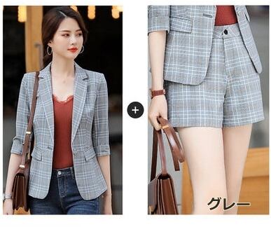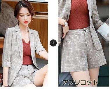 全2色 セットアップ スーツ ジャケット ショートパンツ オフィスカジュアル チェック 5分丈 OL カジュアル キレイめ 春夏