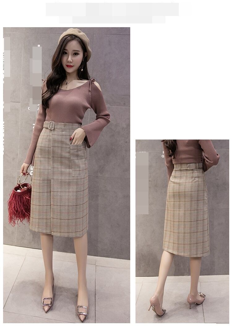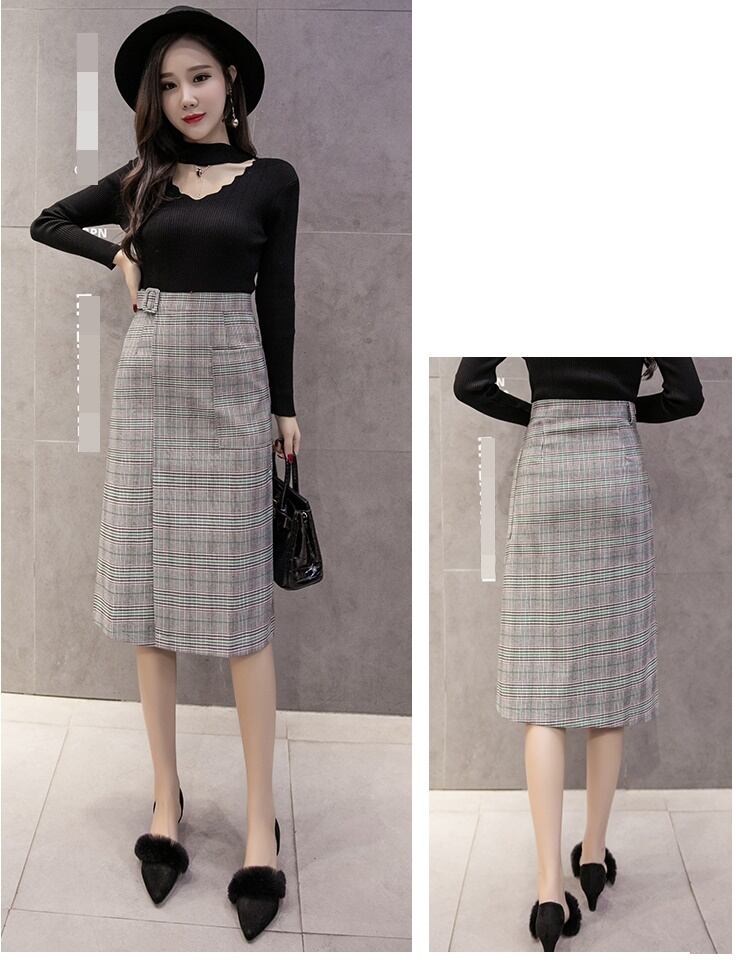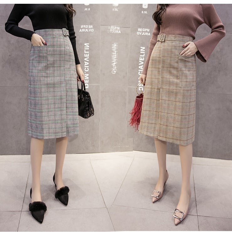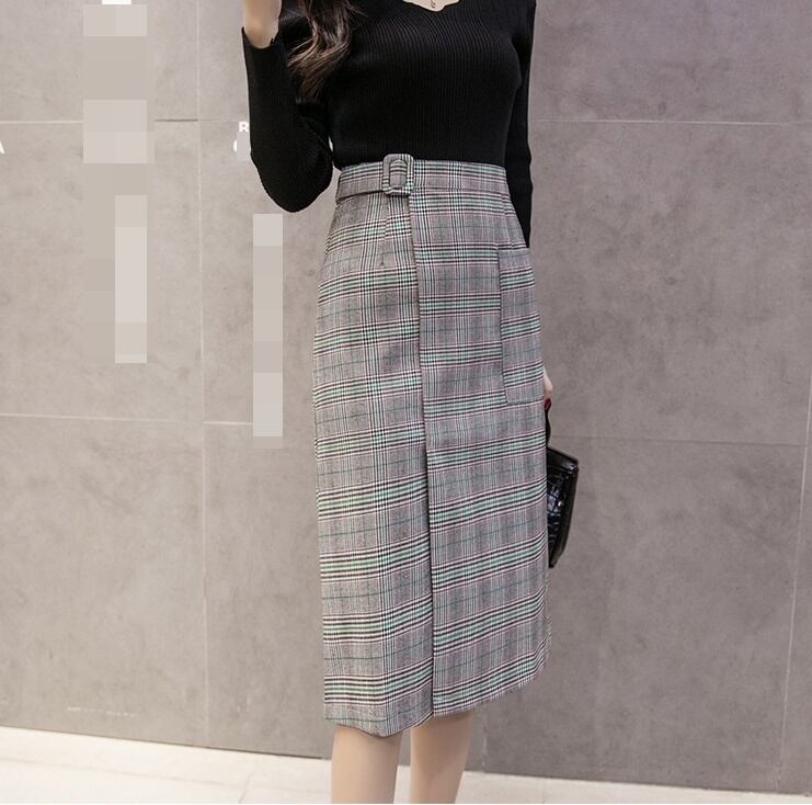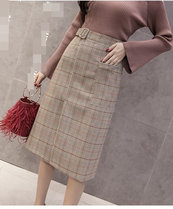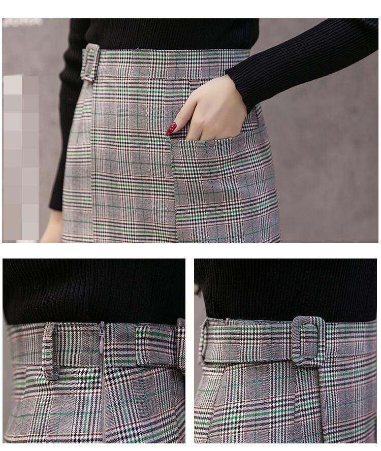 全2色 ハイウエスト スカート グレンチェック エレガント チェック柄 着やせ ベルト ひざ丈 ロング 秋冬 大人 通勤 お出かけ