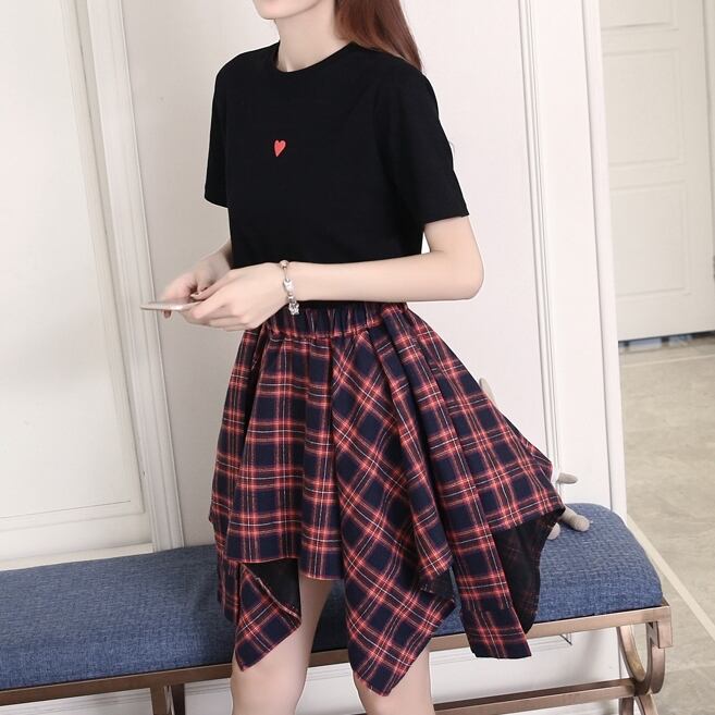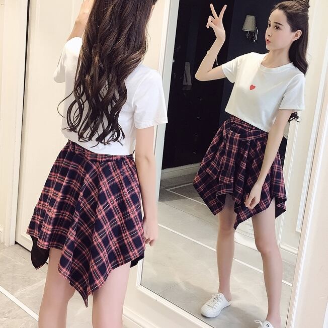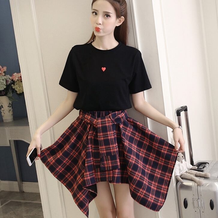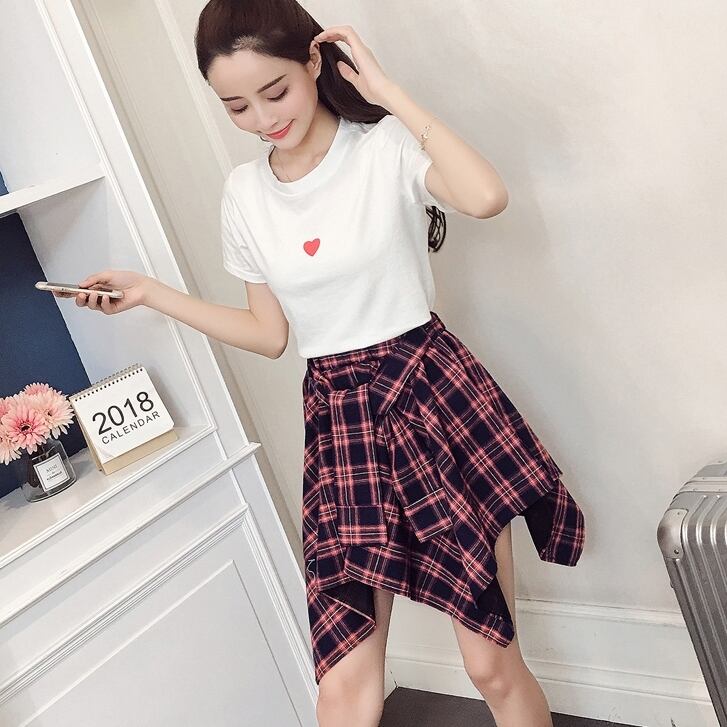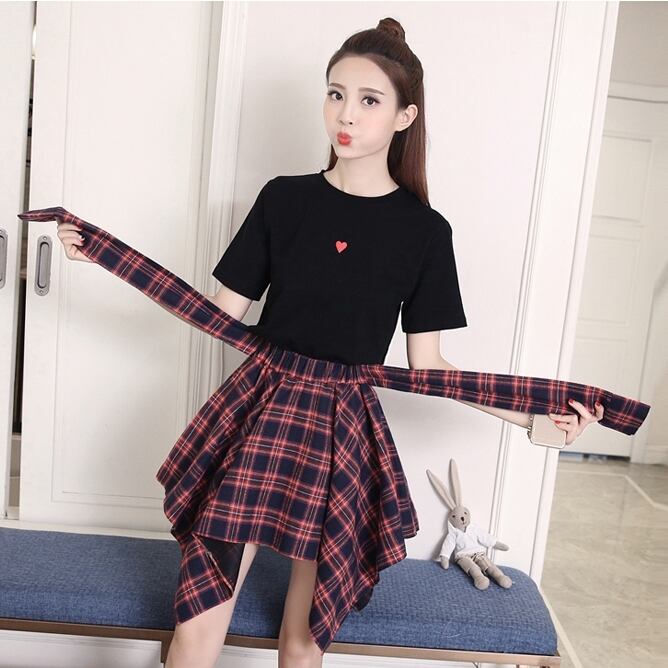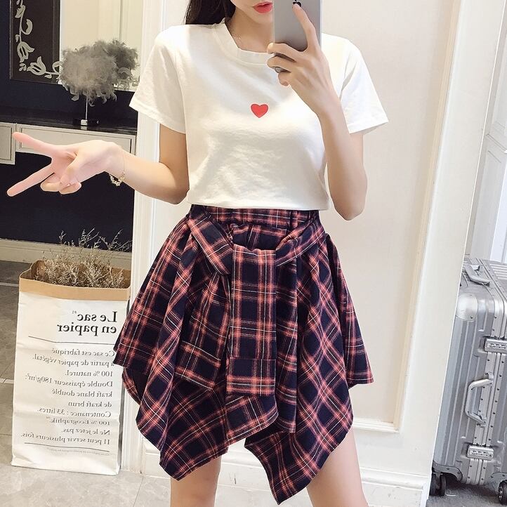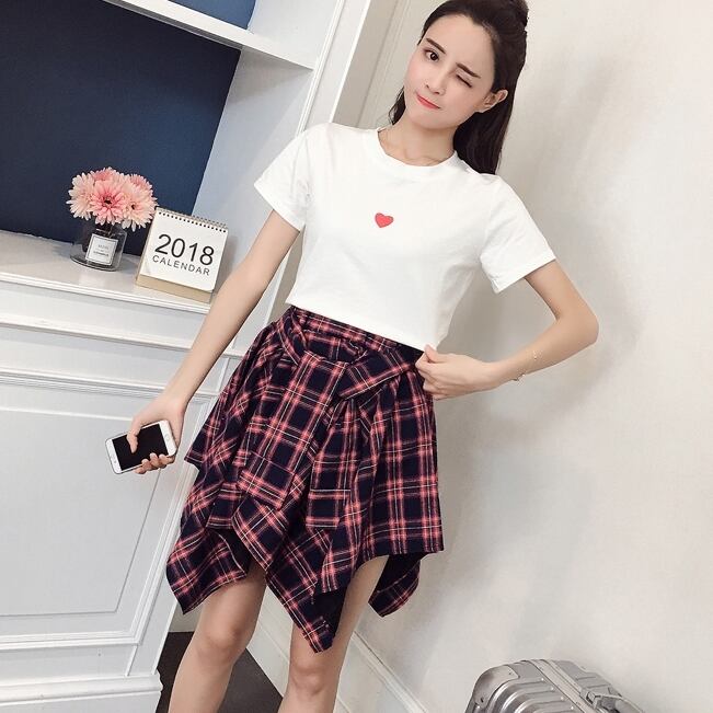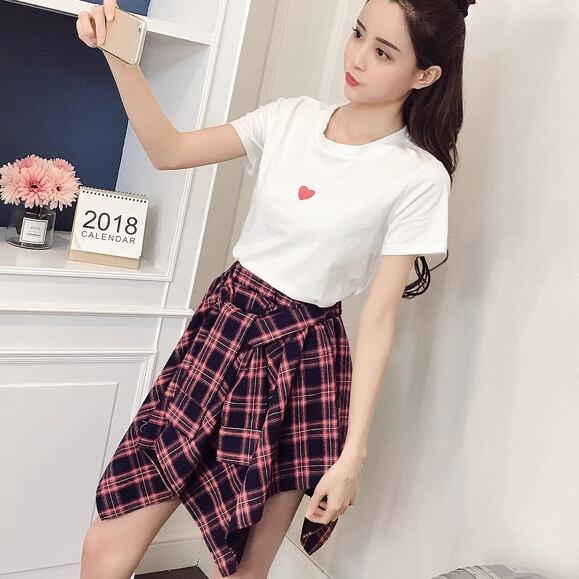 全2色 セットアップ ミニ スカート トップス Tシャツ ショート丈 チェック柄 美脚 ウエストゴム リボン 大人可愛い デート デイリー ハイウエスト 春夏