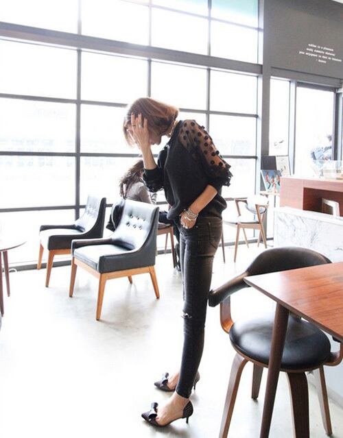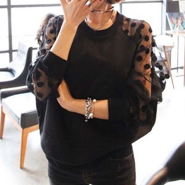 トップス シースルー ドット ラウンドネック コットン 長袖 スリーブ レディース 大人かわいい 春秋 大人かわいい