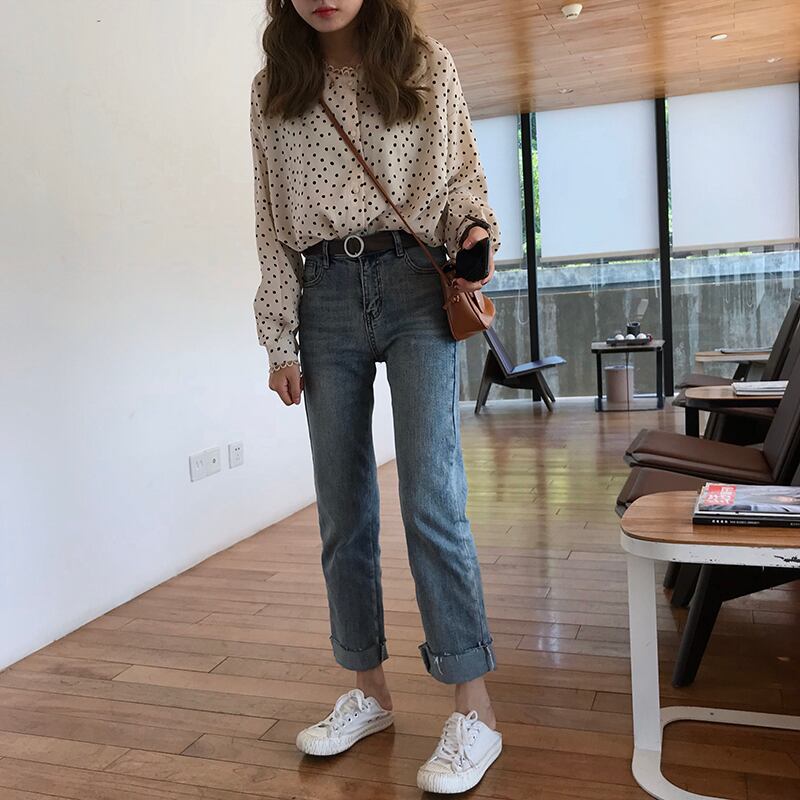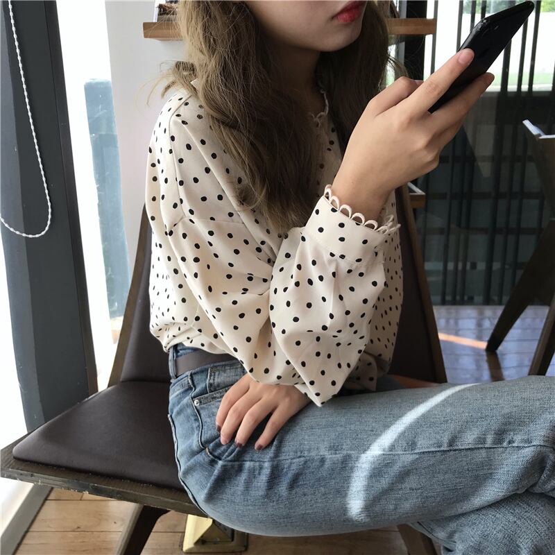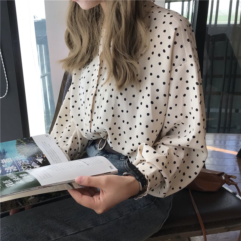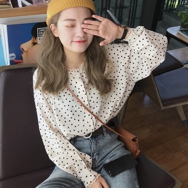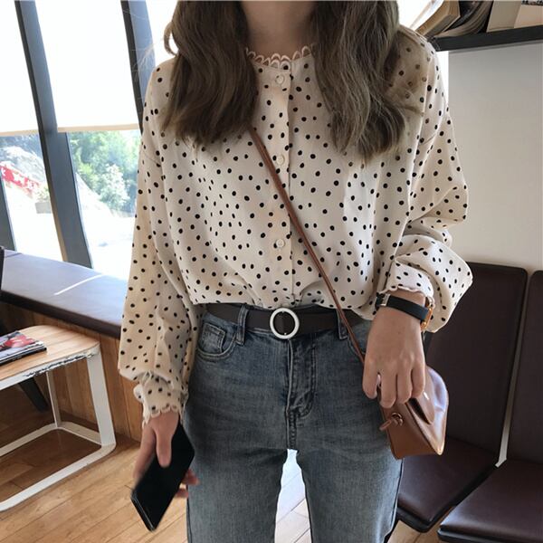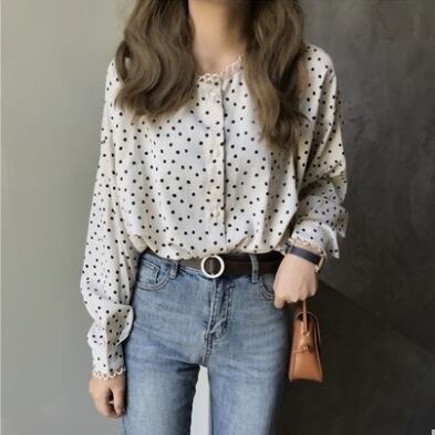 トップス ブラウス ドット 柄 シャツ フリル フロントボタン ラウンドネック ゆったり シンプル かわいい レトロ 水玉 長袖 かわいい 春秋