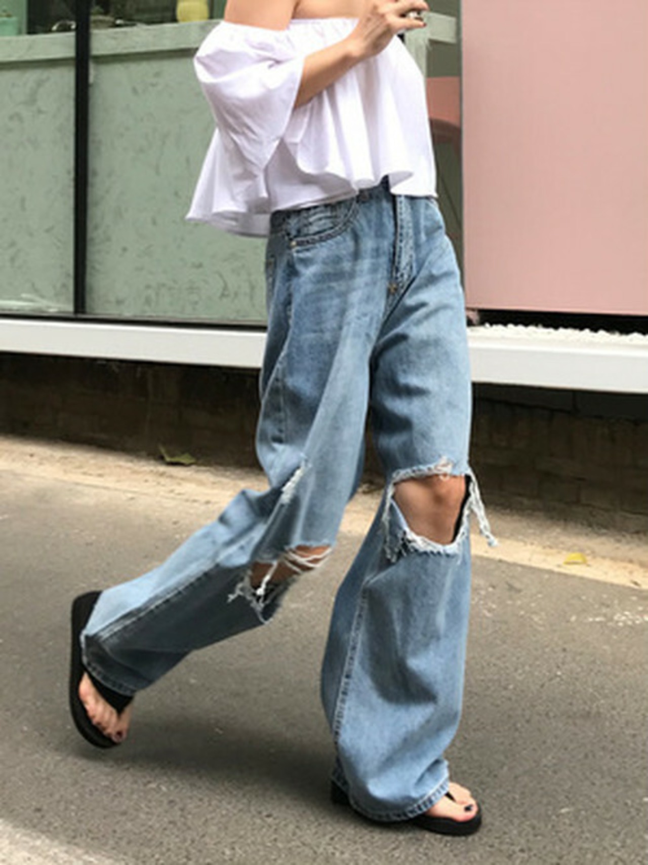 ダメージ ジーンズ デニム ワイドレッグパンツ ハイウエスト ダメージデニム レディース カジュアル かっこいい スタイリッシュ