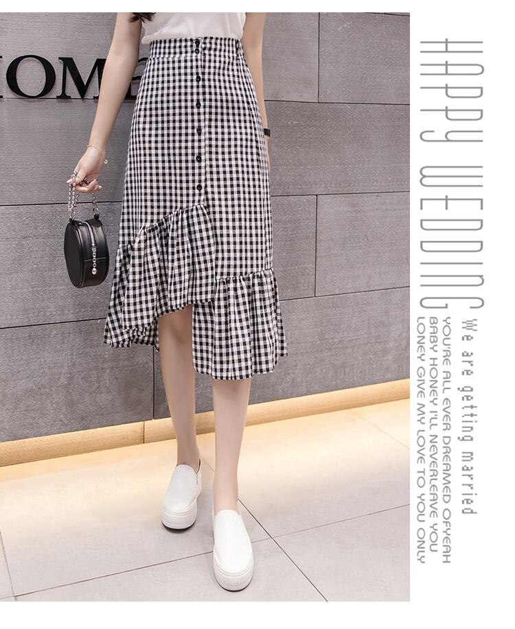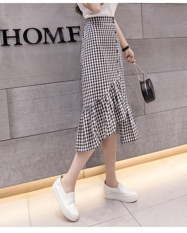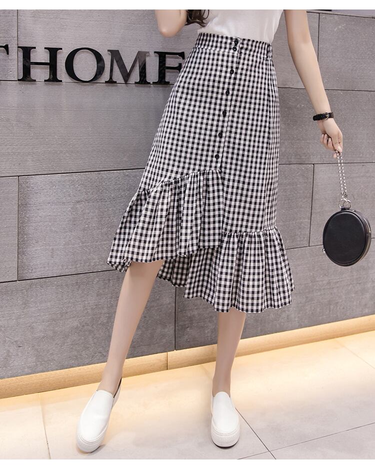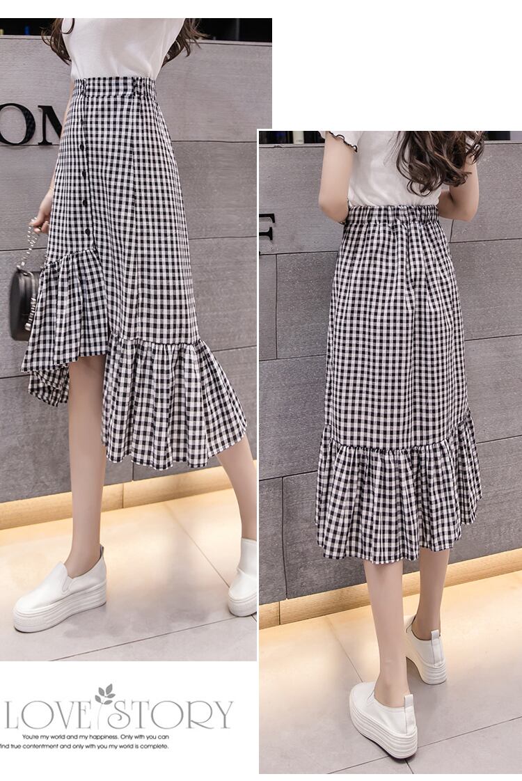 スカート フレア ミモレ丈 レトロ 切り替え ひざ下 ひざ丈 フィッシュテール フロントボタン アシンメトリー チェック柄 デイリー デート