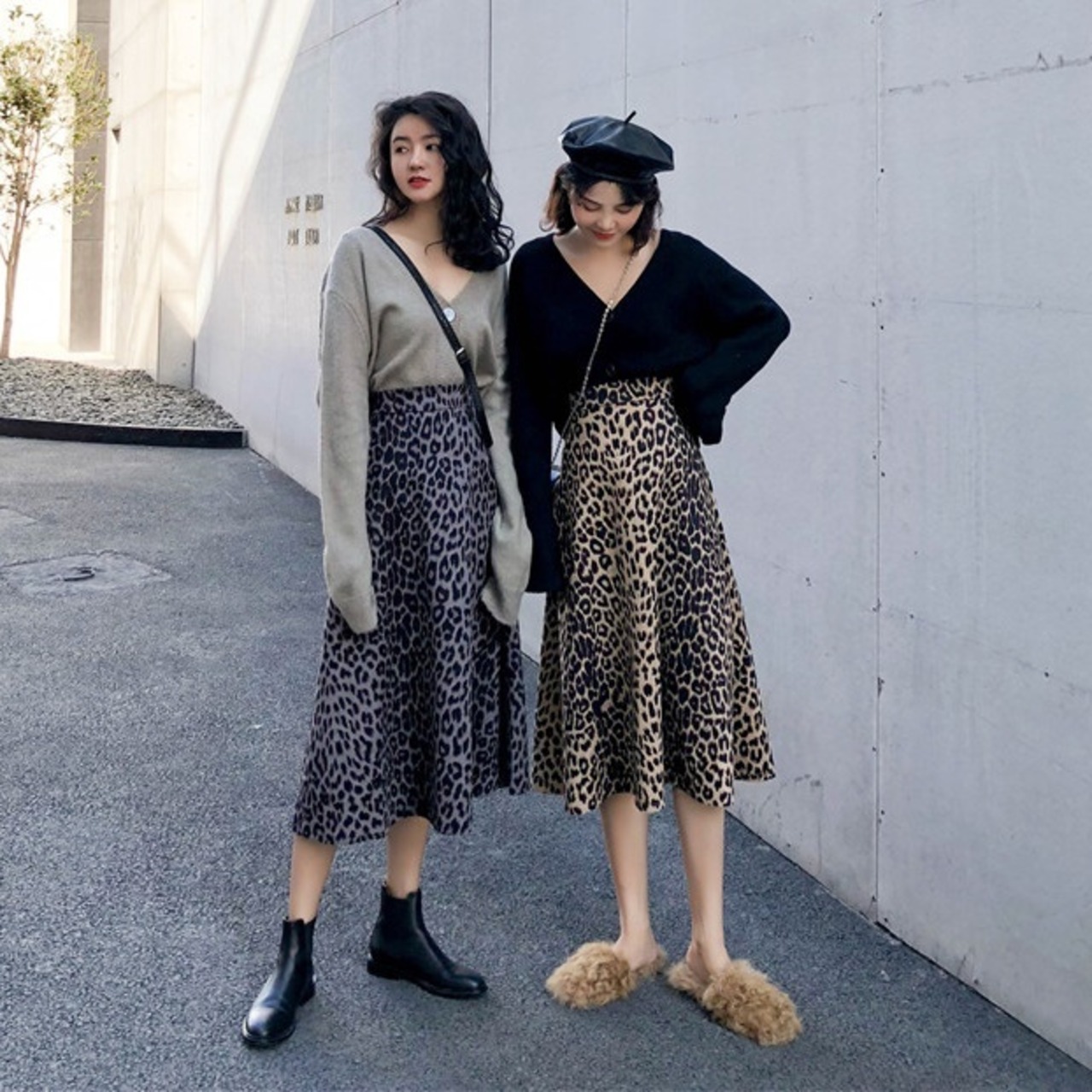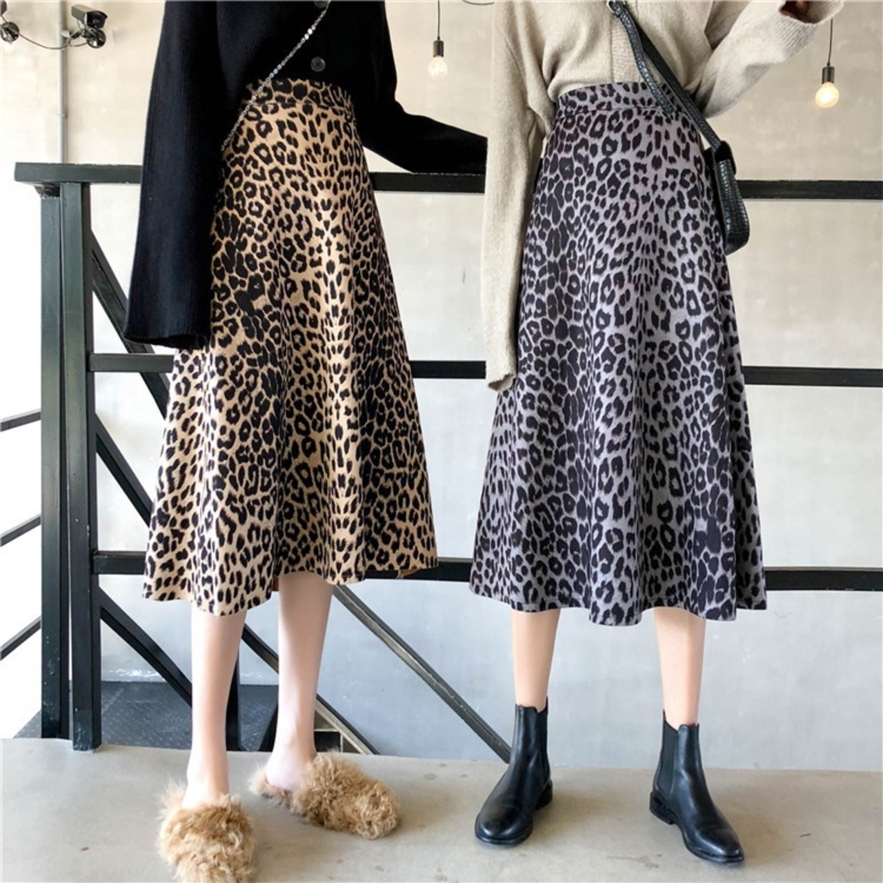 全2色 レオパード柄 スカート ハイウエスト シック 足長効果 ひざ下丈 ミディ丈 Aライン フレア 大人可愛い ロング丈 サーキュラー・スカート お出かけ デート
