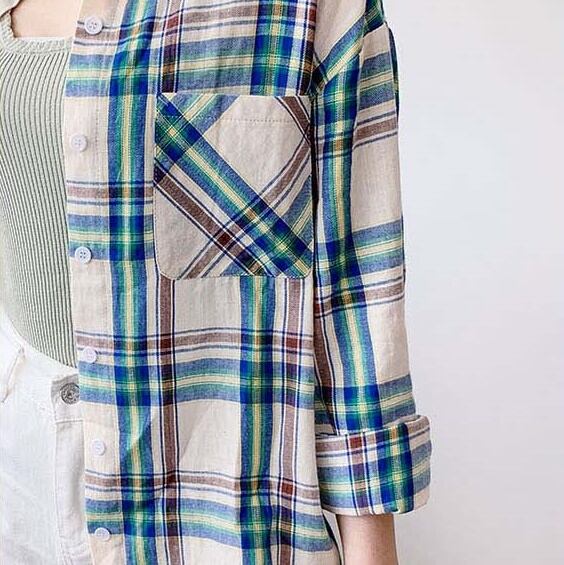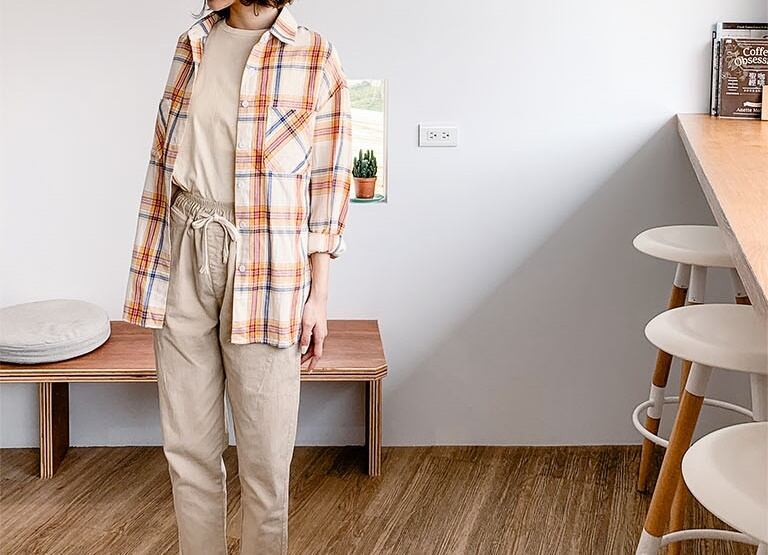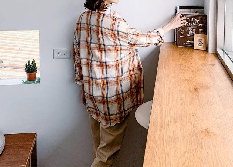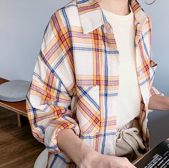 色使いが秋らしいチェック柄の長袖シャツ。