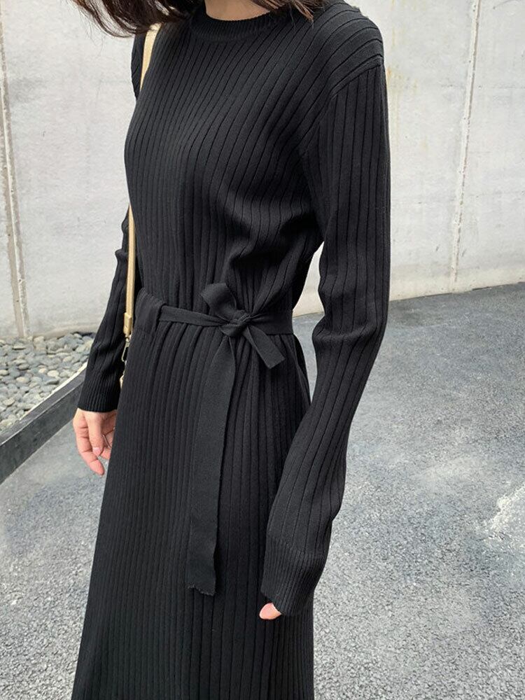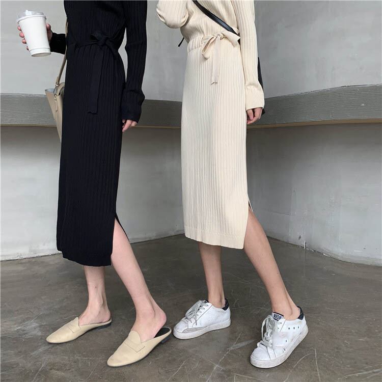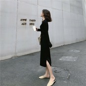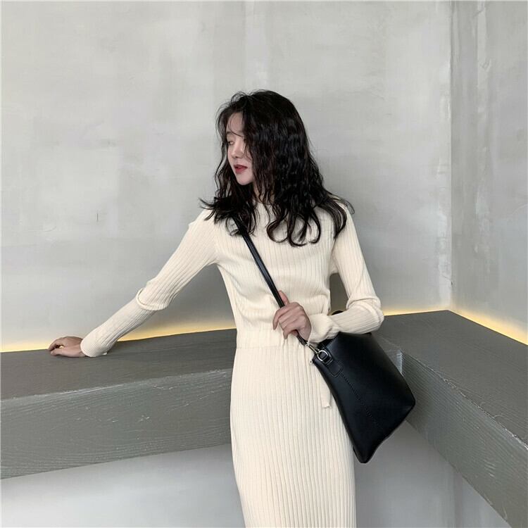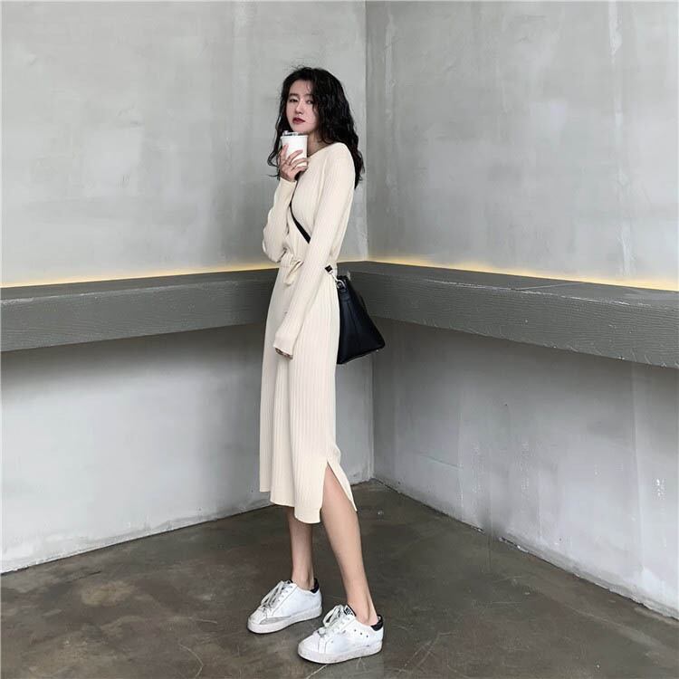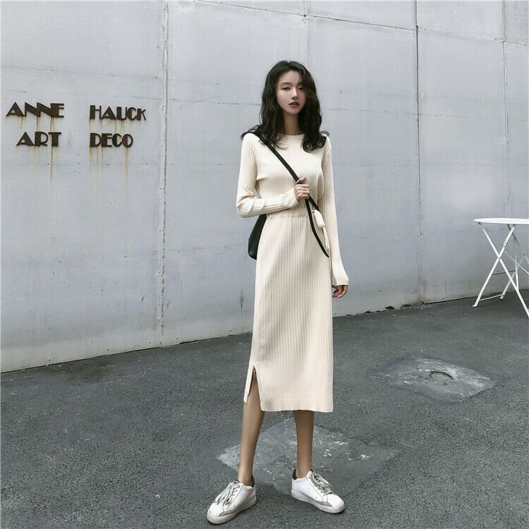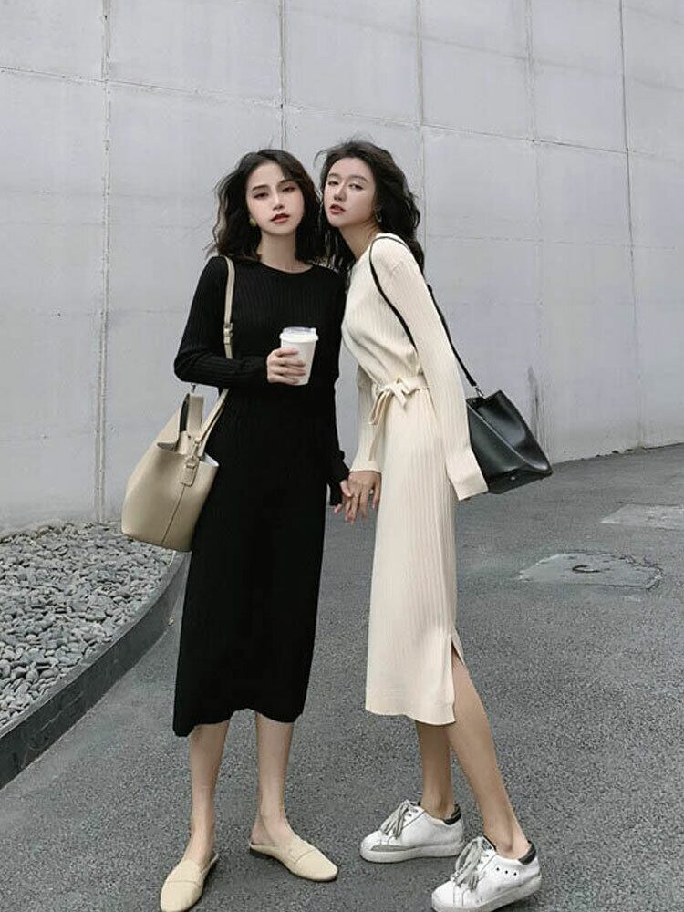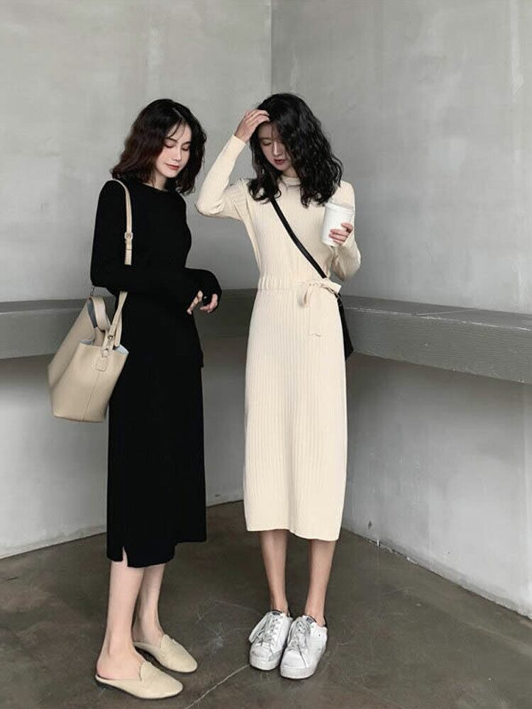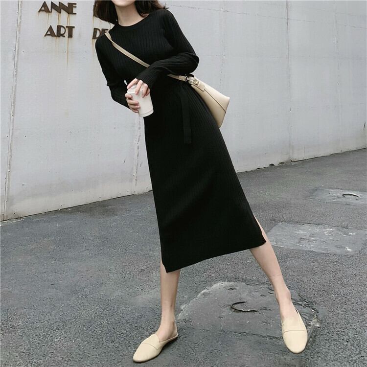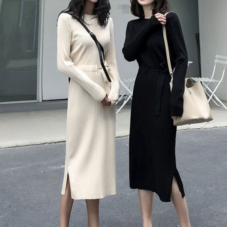全2色 ニットワンピース ニット ワンピ ミモレ丈 ラウンドネック 無地 シンプル 秋冬 レトロ 大人可愛い デート お出かけ デイリー 20代