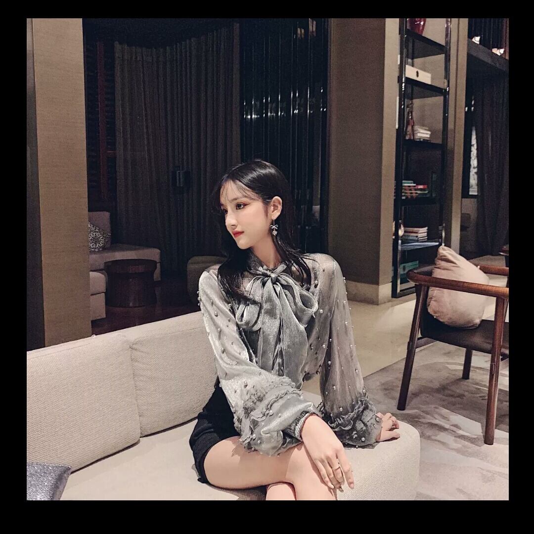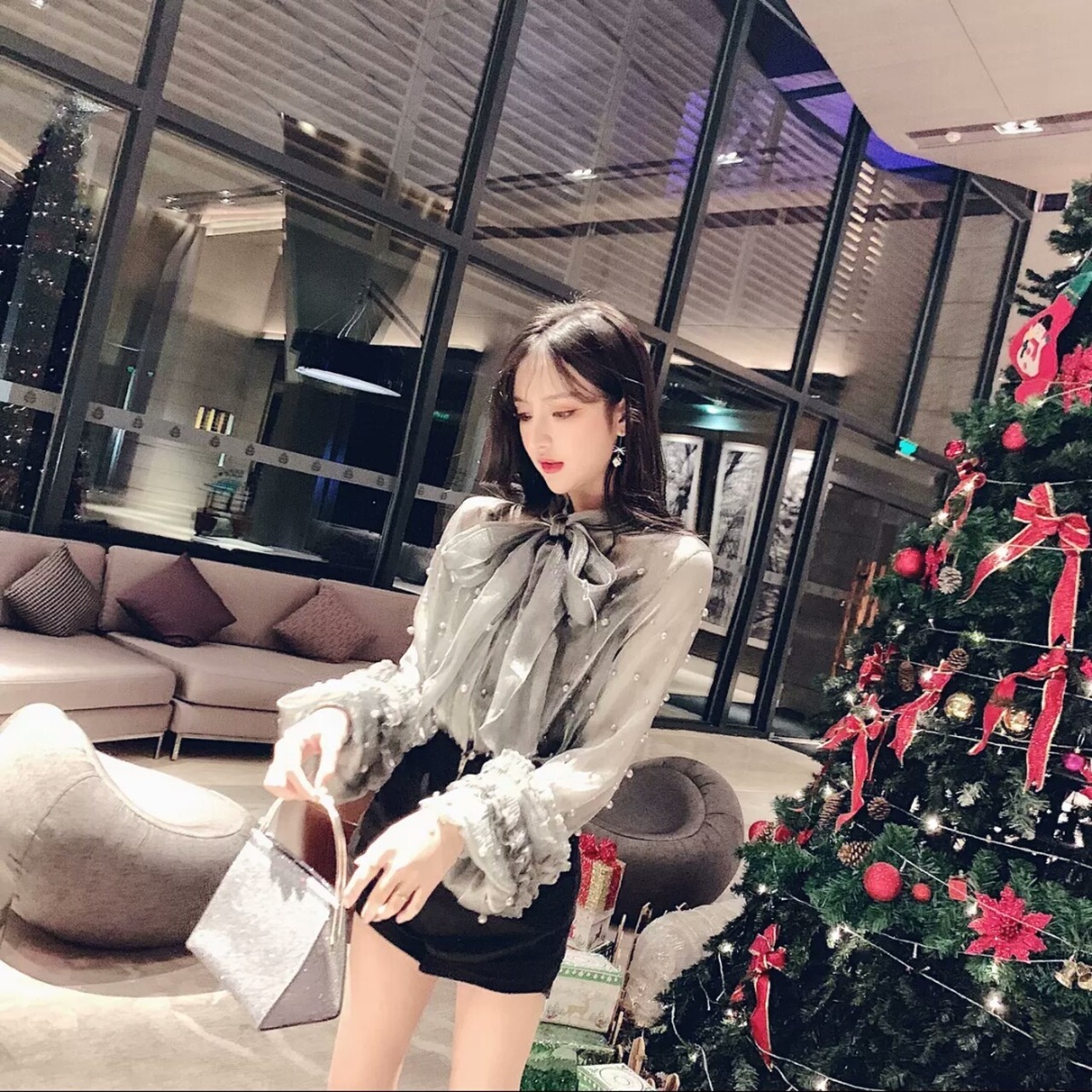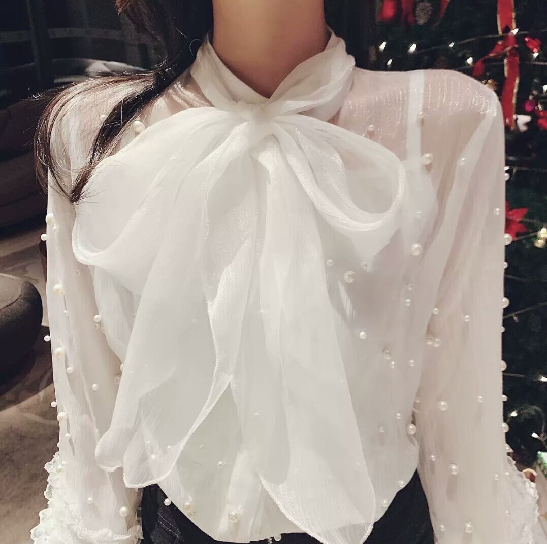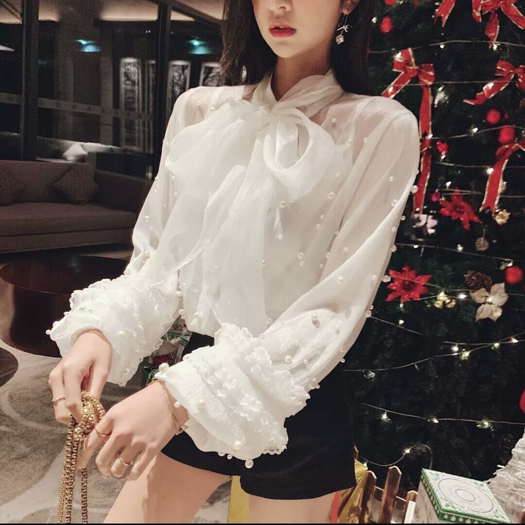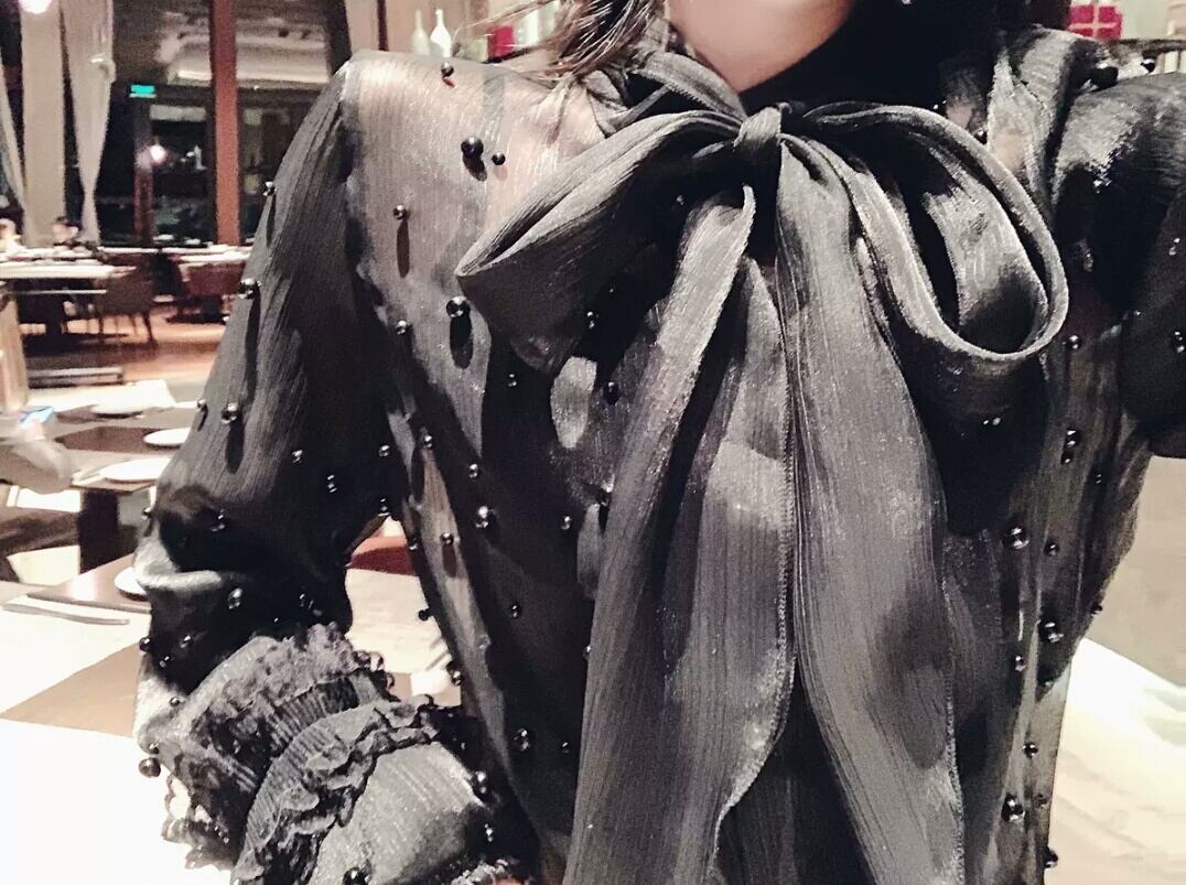 全3色 ブラウス リボン ランタンスリーブ 長袖 袖紺 シフォン シャツ フリル フレア パール ビーズ デザイン 大人 エレガント キレイめ お出かけ デート オフィス 女子会 秋冬