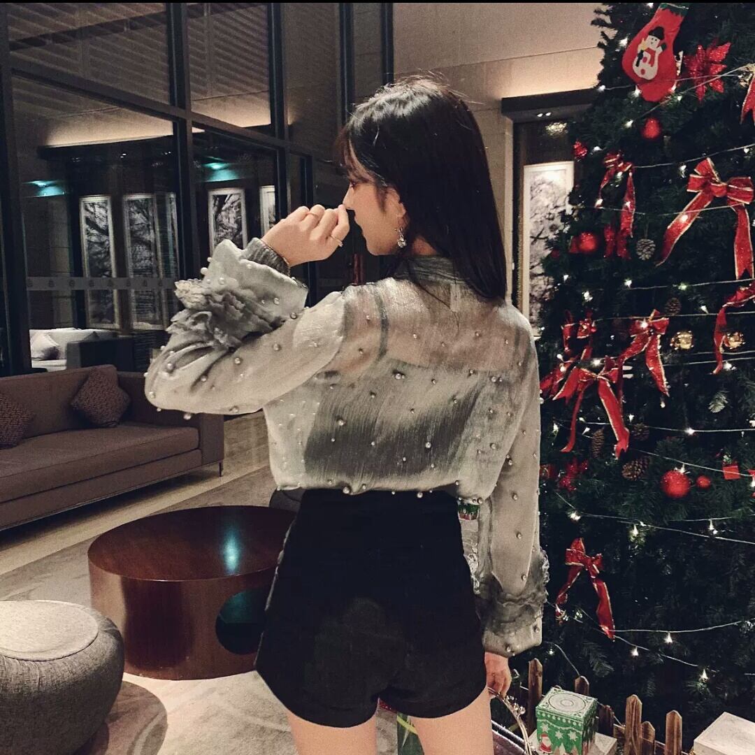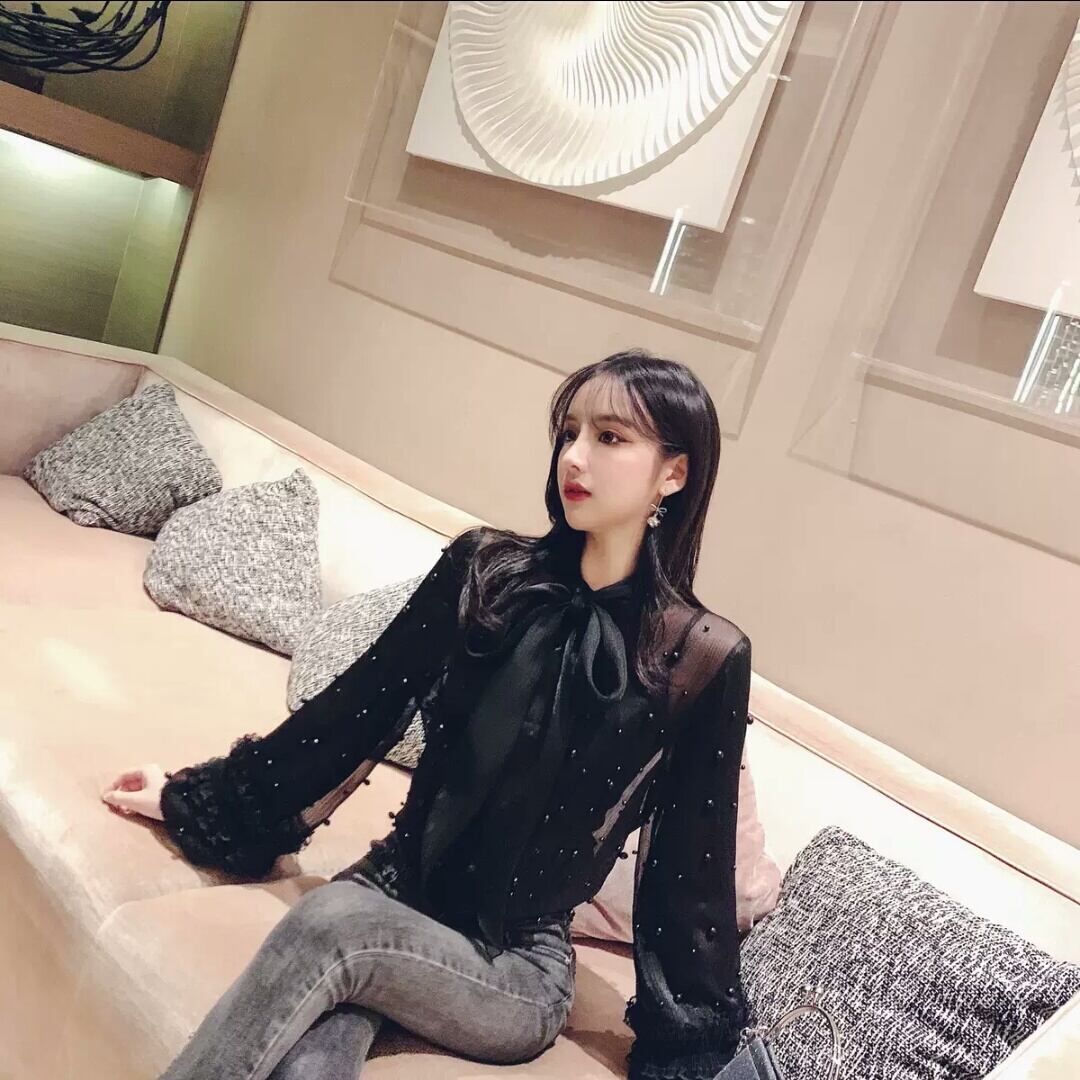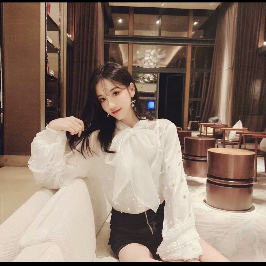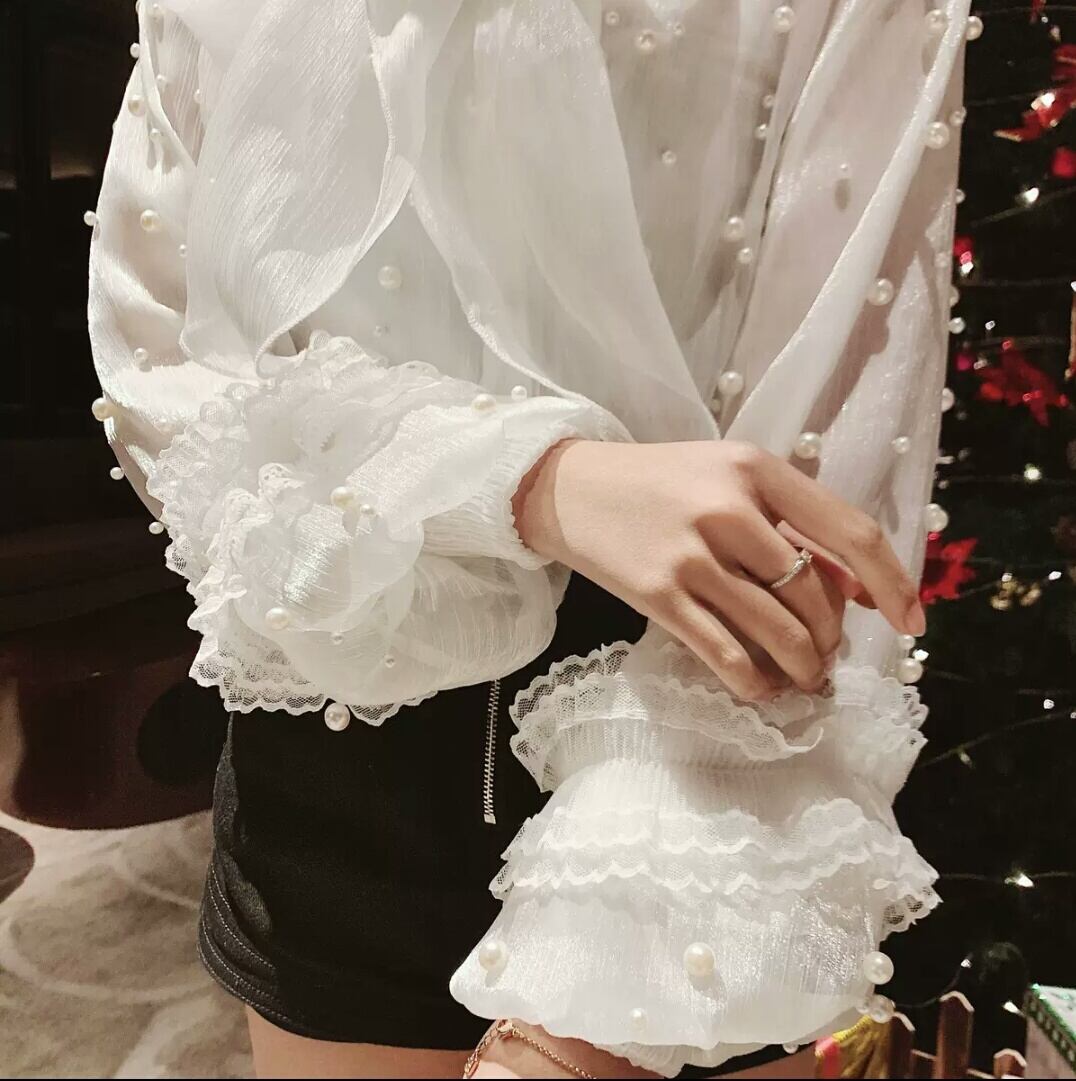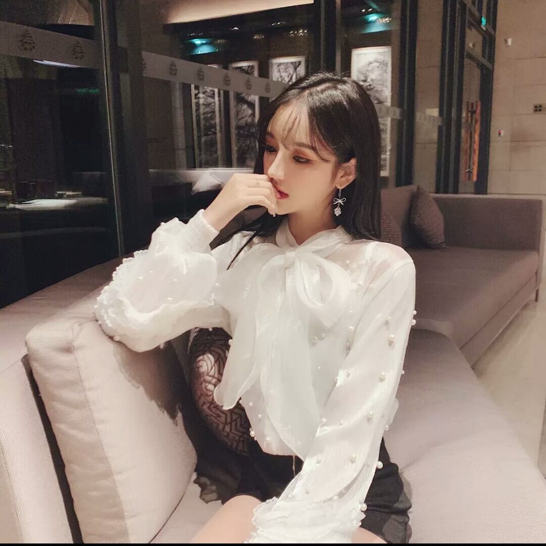 全3色 ブラウス リボン ランタンスリーブ 長袖 袖紺 シフォン シャツ フリル フレア パール ビーズ デザイン 大人 エレガント キレイめ お出かけ デート オフィス 女子会 秋冬