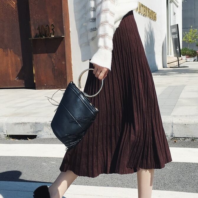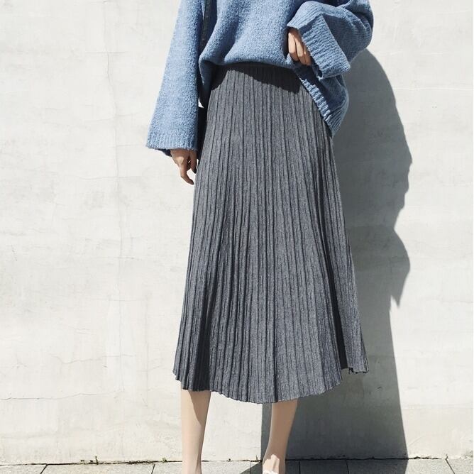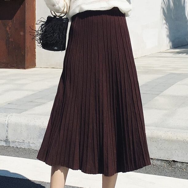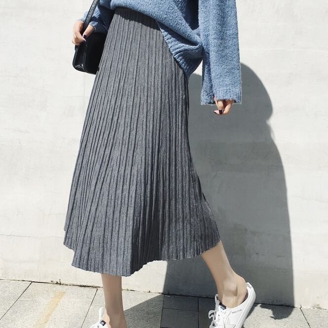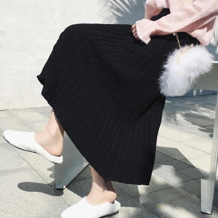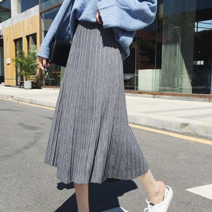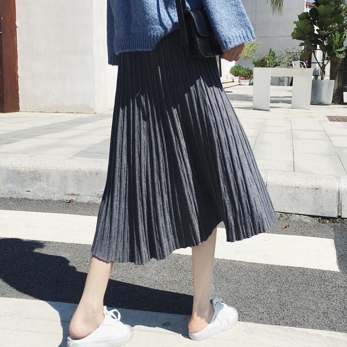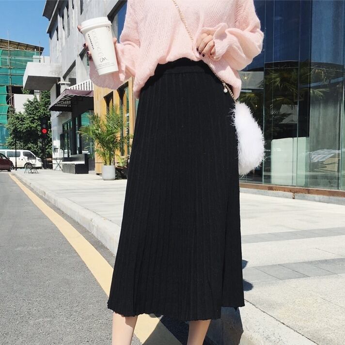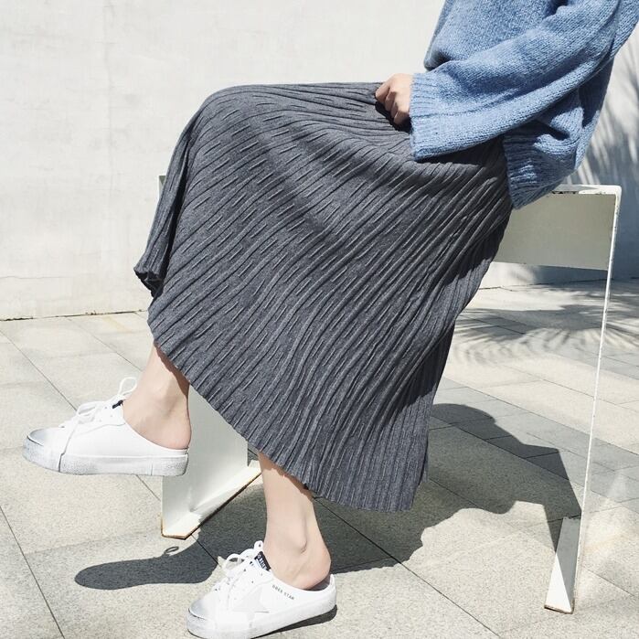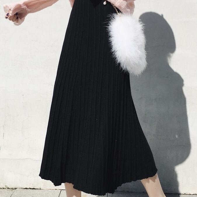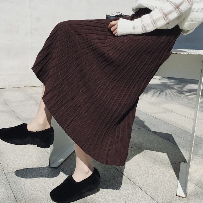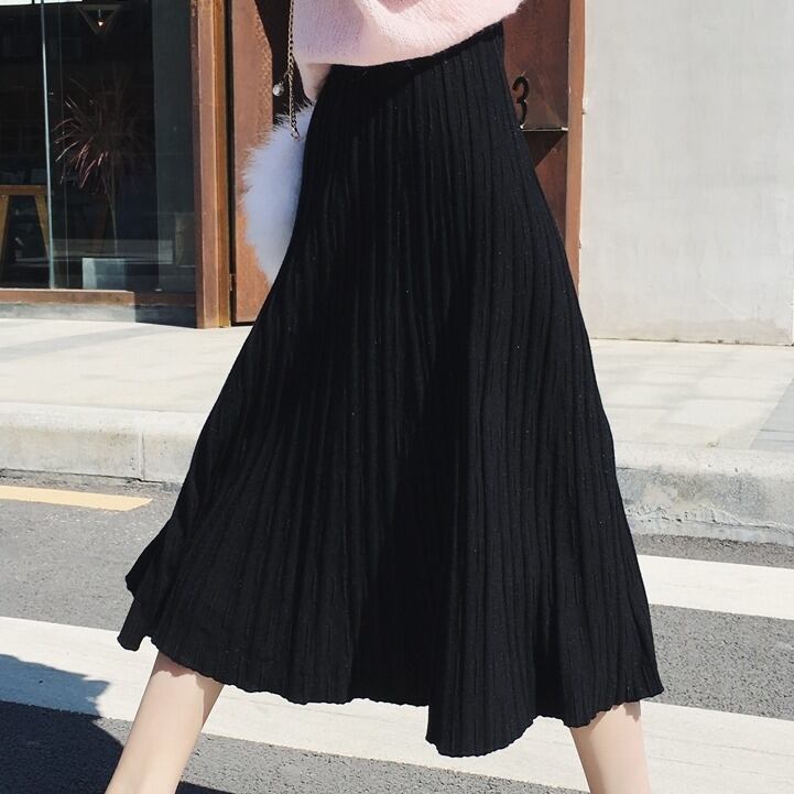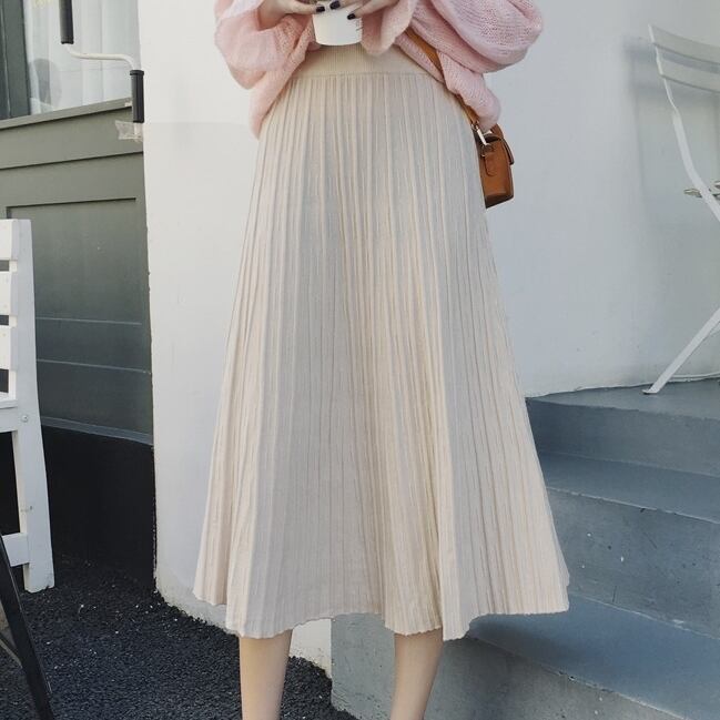 全4色 プリーツスカート ワイド ニット レディース トレンド 定番 ハイウエスト ロング マキシ丈 無地 くすみカラー 編み物 秋冬 デイリー アプリコット ブラック ブラウン グレー