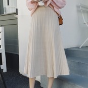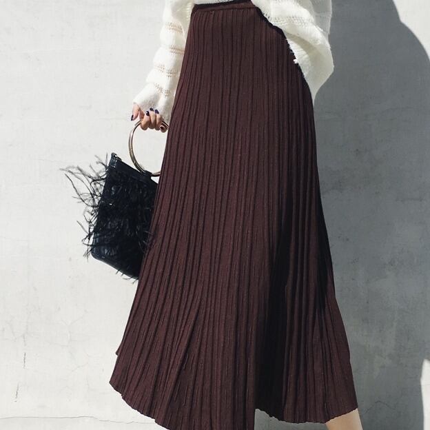 ロングプリーツスカートのポイントは、ハイウエストではいてニットのフロント部分だけINをして着こなすことです。