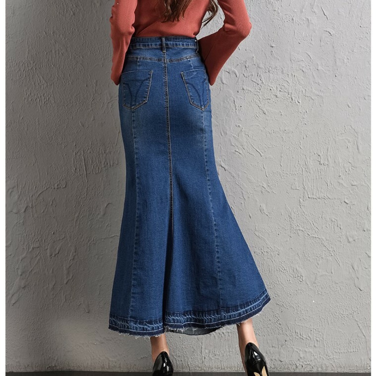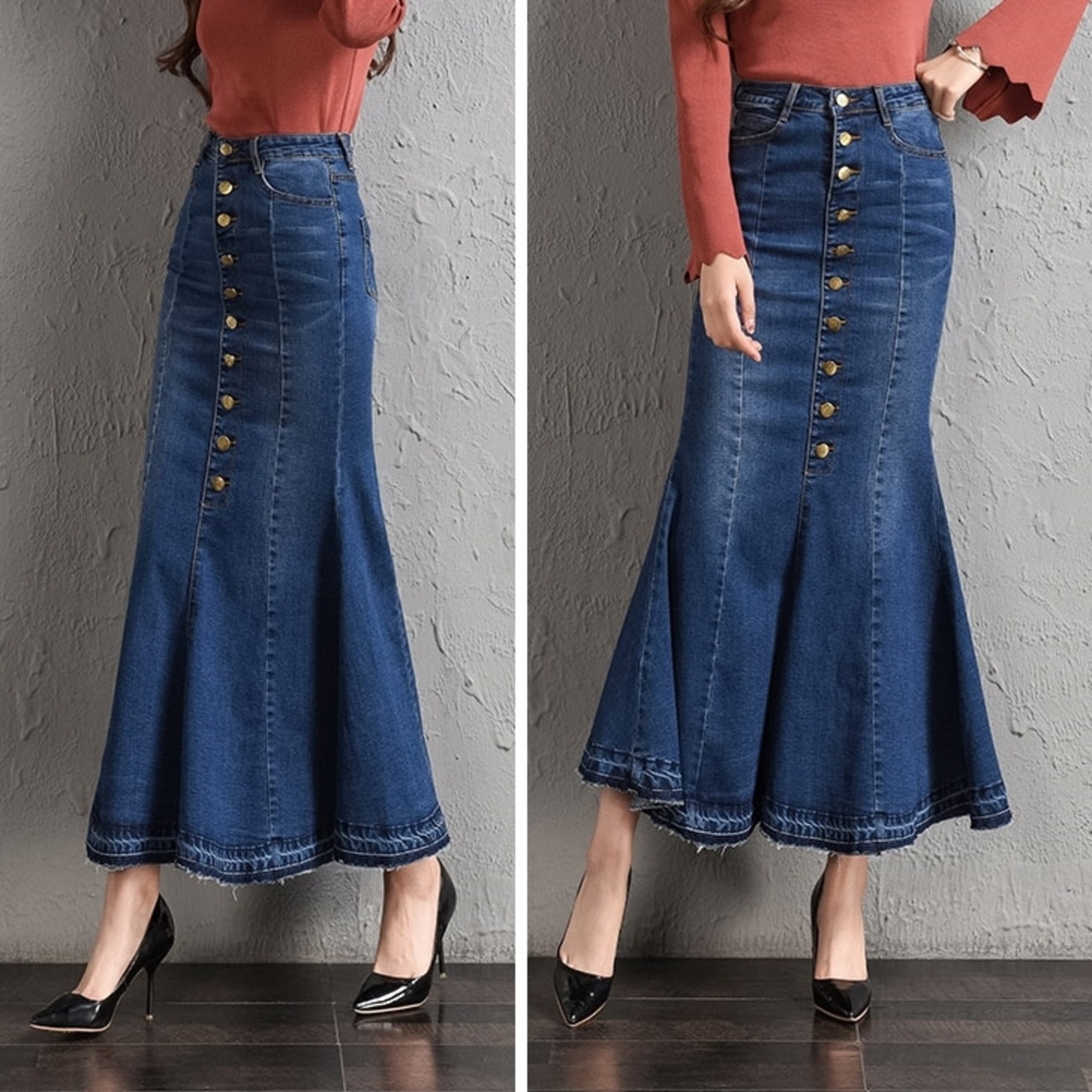 ロングスカート デニムスカート マーメイド カジュアル 大人可愛い お出かけ ハイウエスト フロントボタン 無地 定番 着回し 通学 ダークブルー 秋冬 春