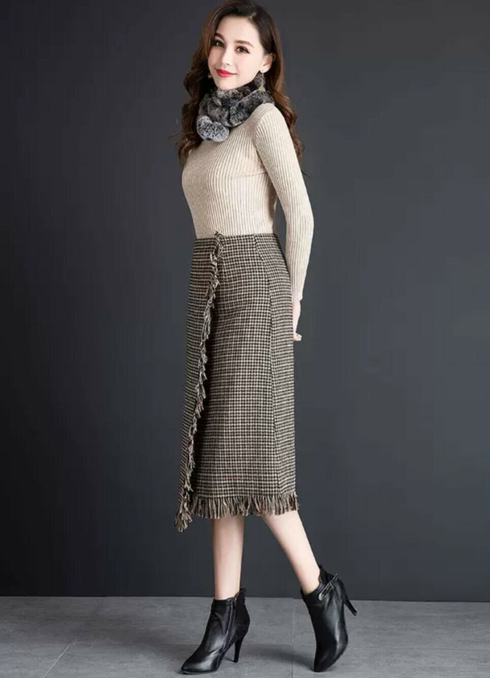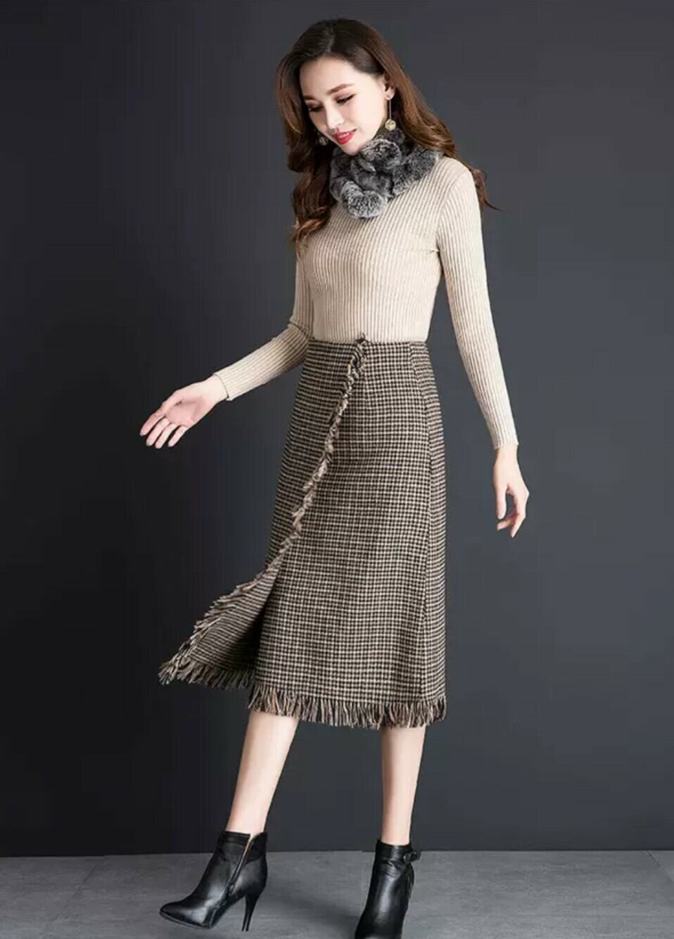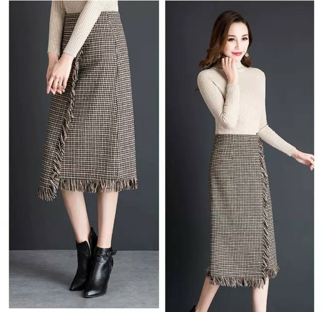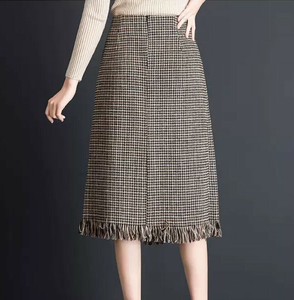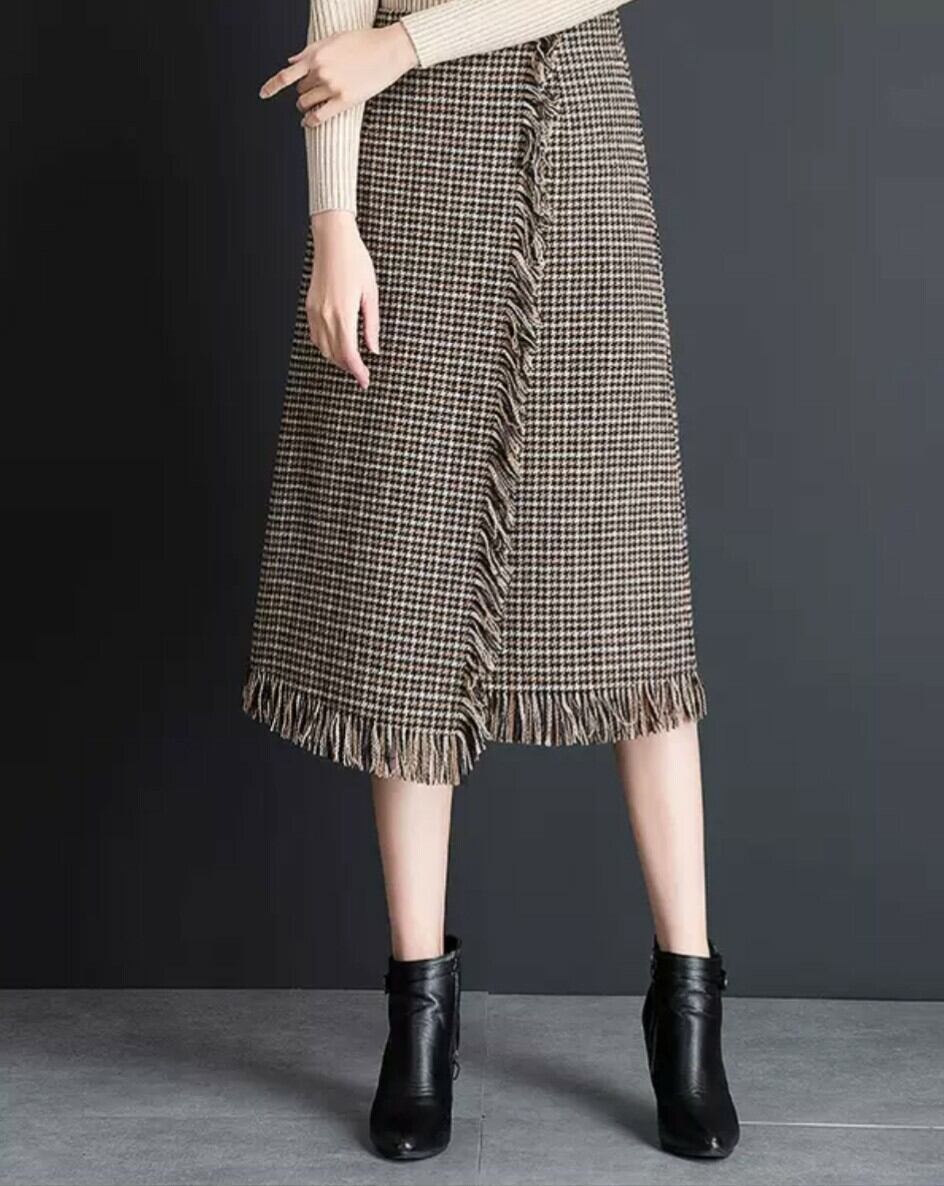 ラップスカート 千鳥格子柄 フリンジ ミディアム ロング Aライン 膝下 デート イエロー
