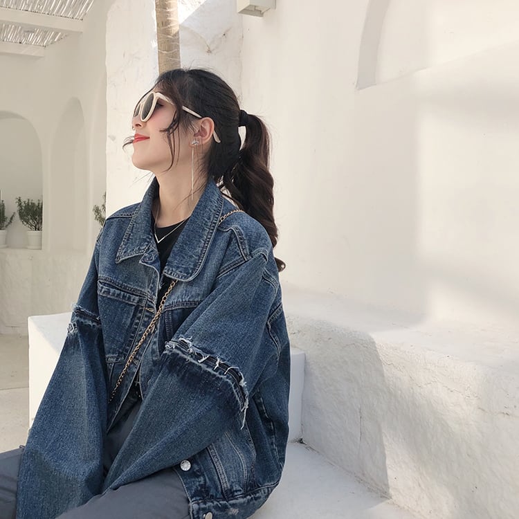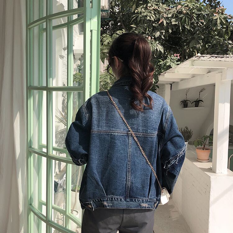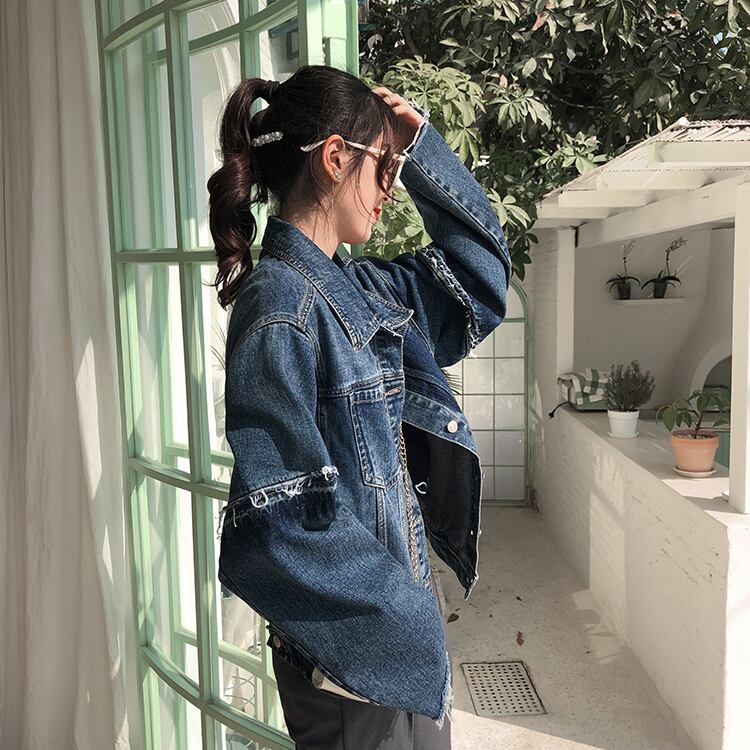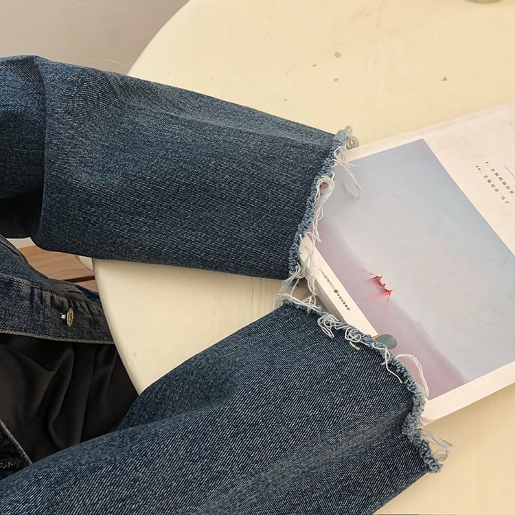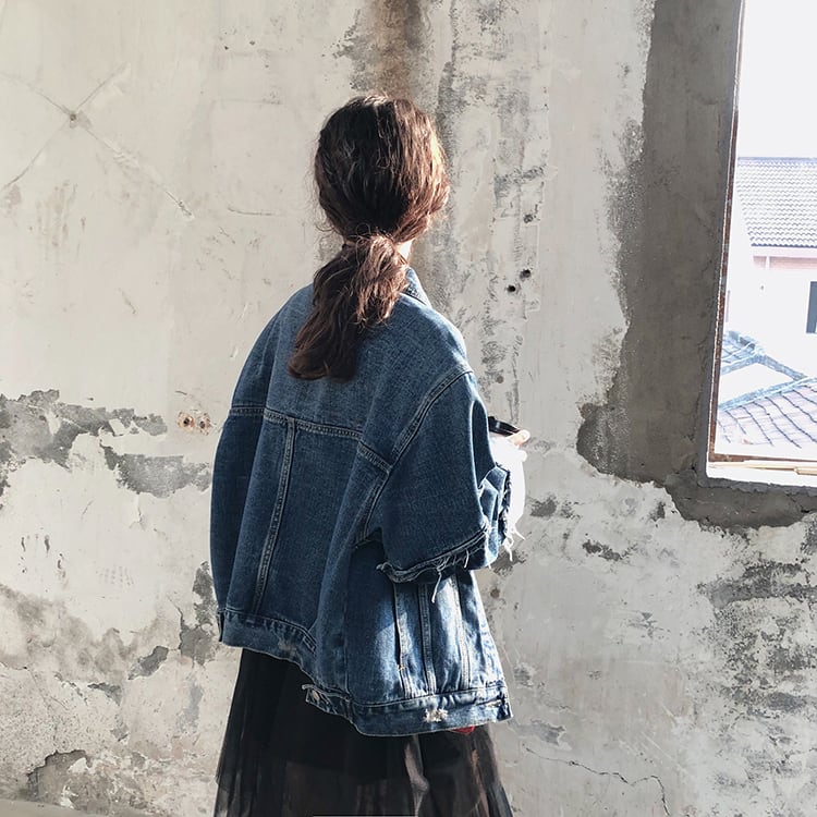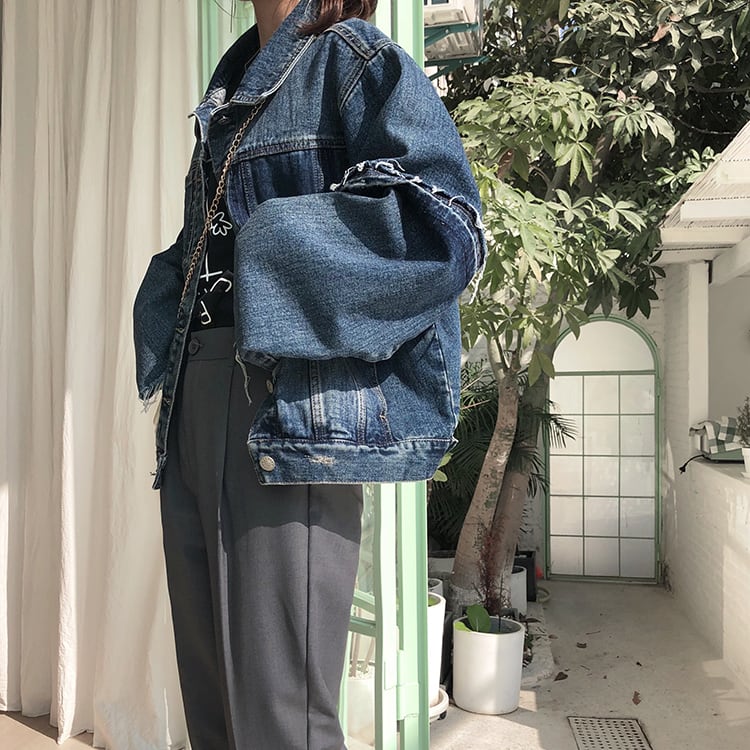 デニムジャケット アウター ミディアム丈 ウォッシュデニム 切りっぱなし袖 大人可愛い 無地 長袖 レトロ デイリー カジュアル 羽織りもの 秋冬