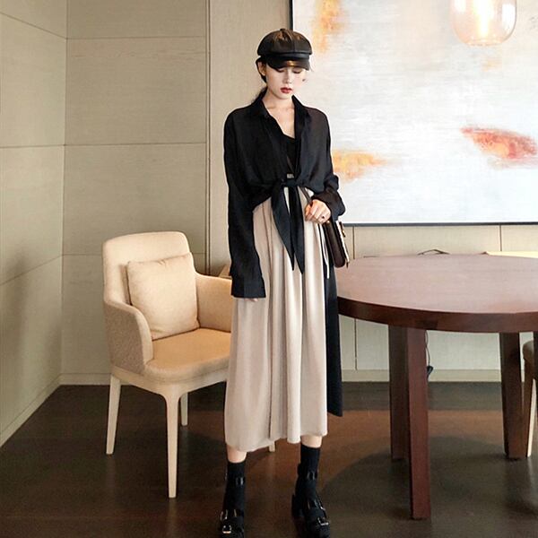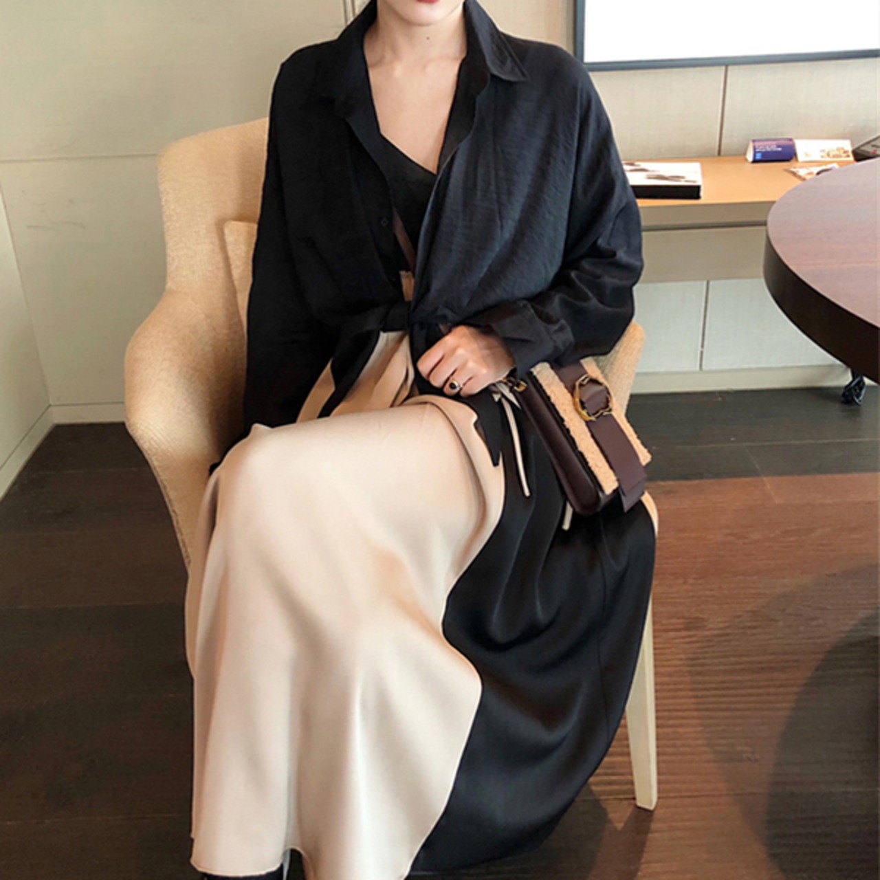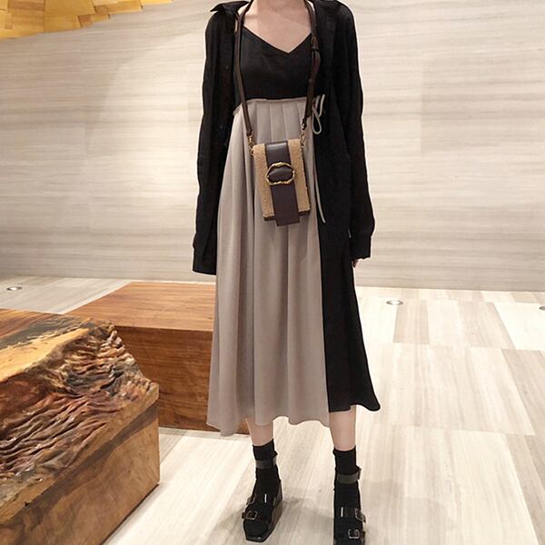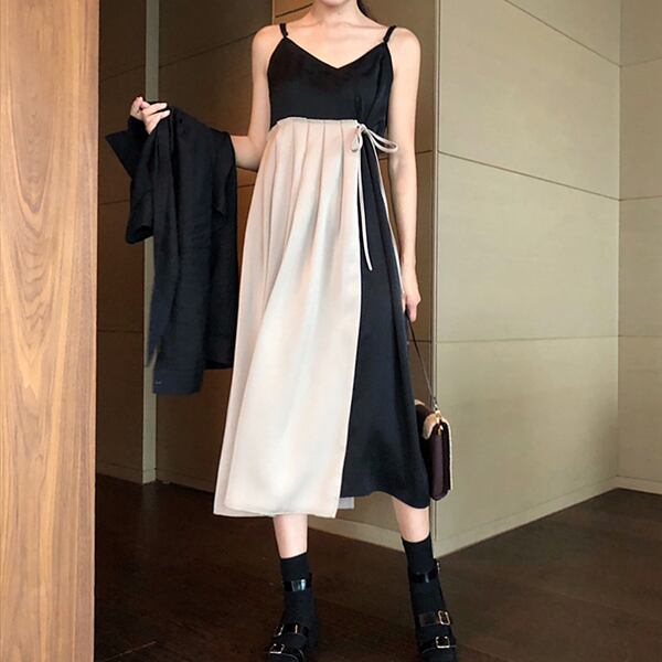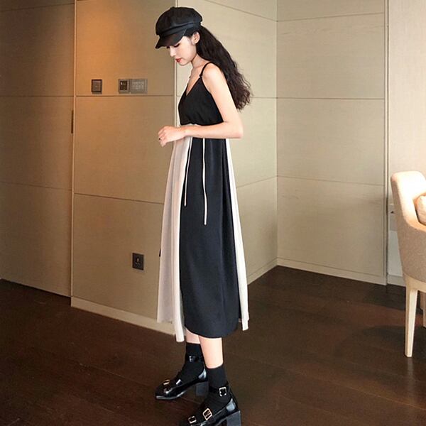ワンピース ひざ下丈 ミモレ丈 バイカラー ハイウエスト キャミソールタイプ Vネック 秋冬 レトロ 大人可愛い デート お出かけ デイリー 20代