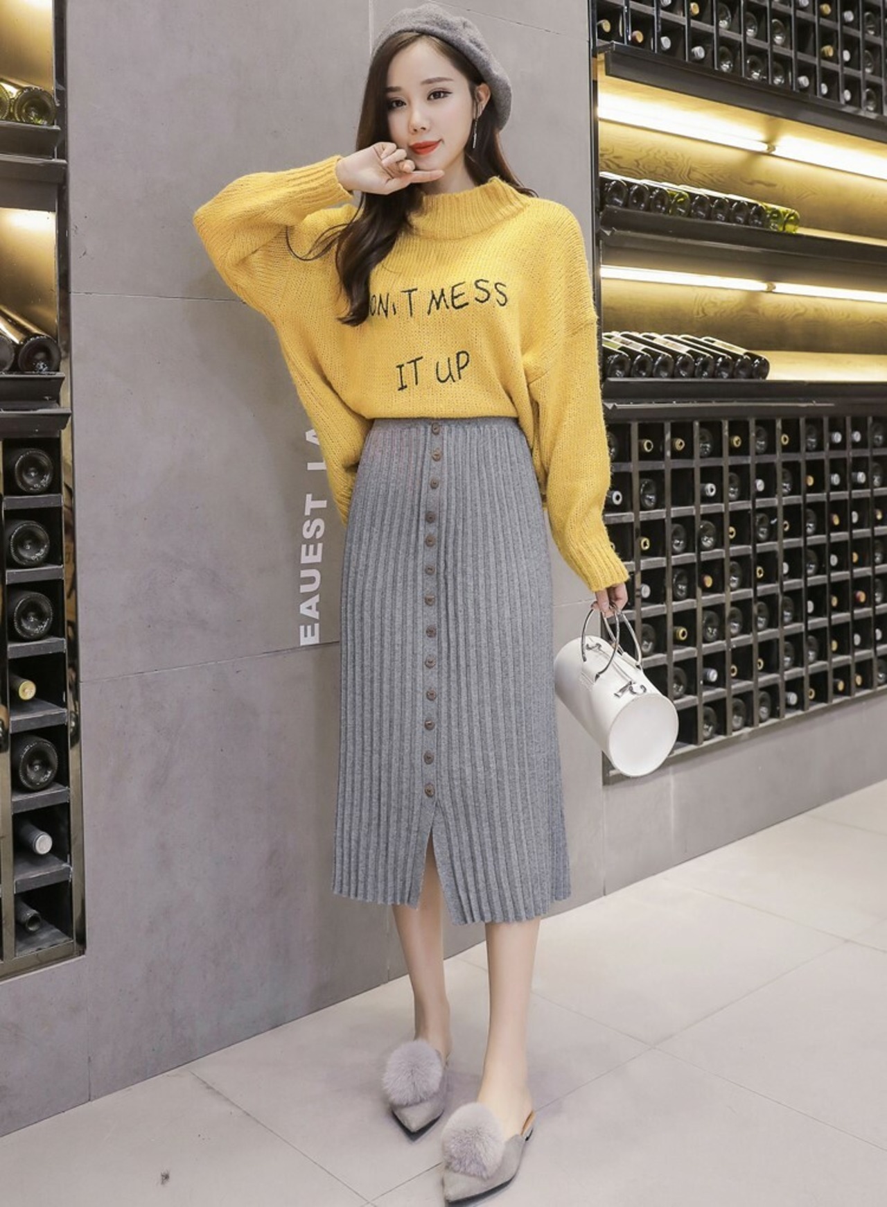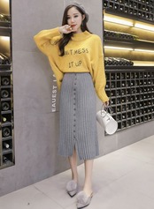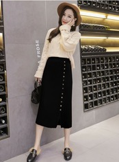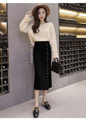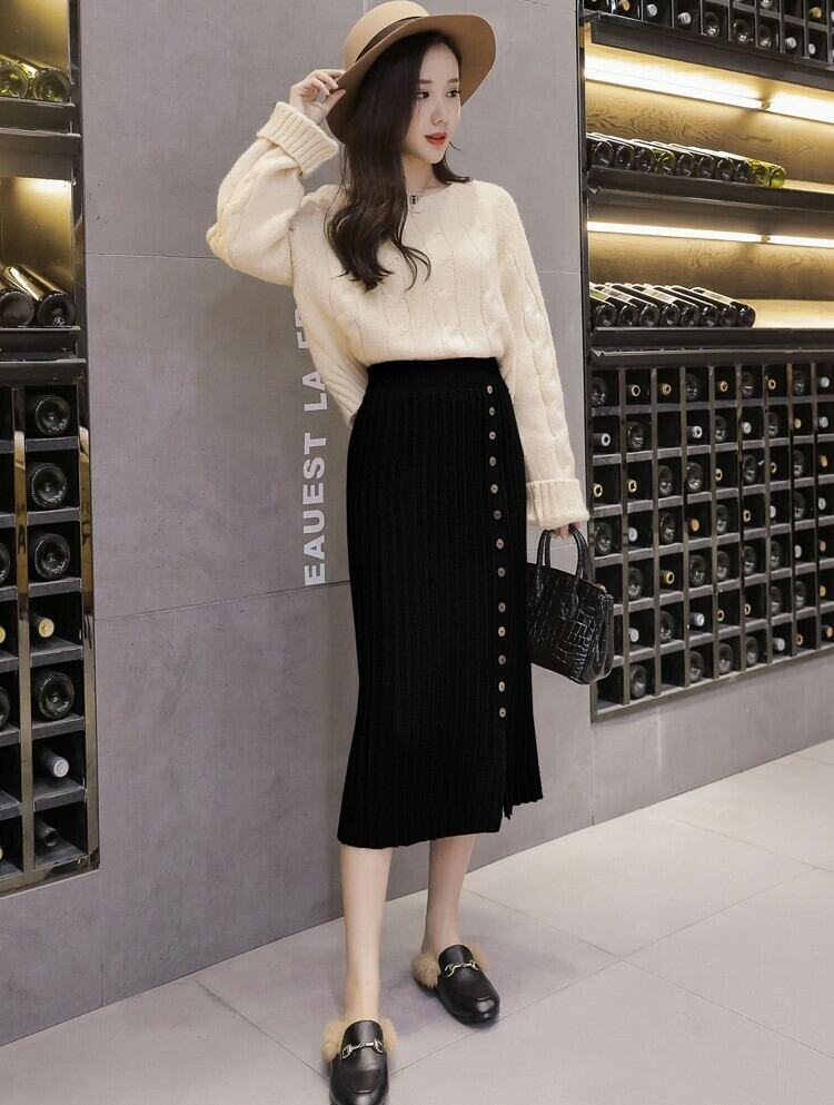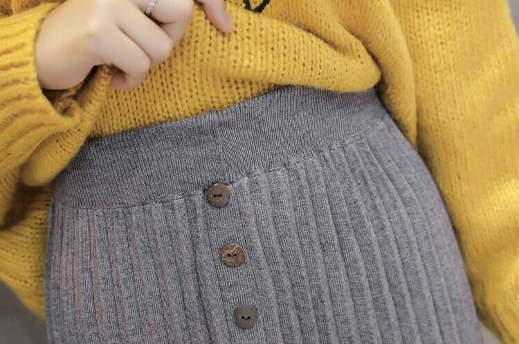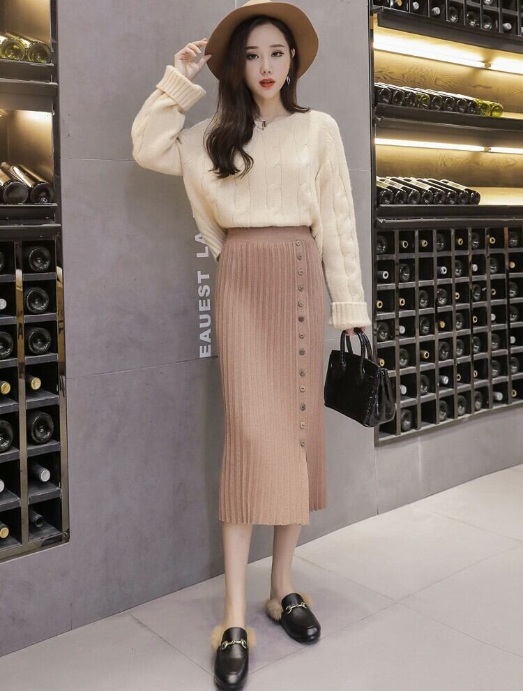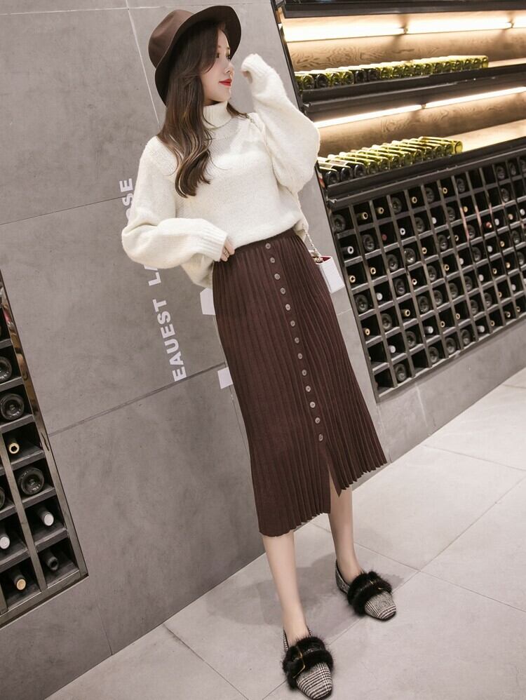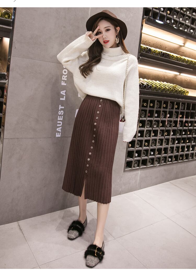 全4色 プリーツスカート タイト ストレッチ ミモレ丈 スリット ニット フロントボタン 秋冬 お出かけ 通勤 オフィス 韓国