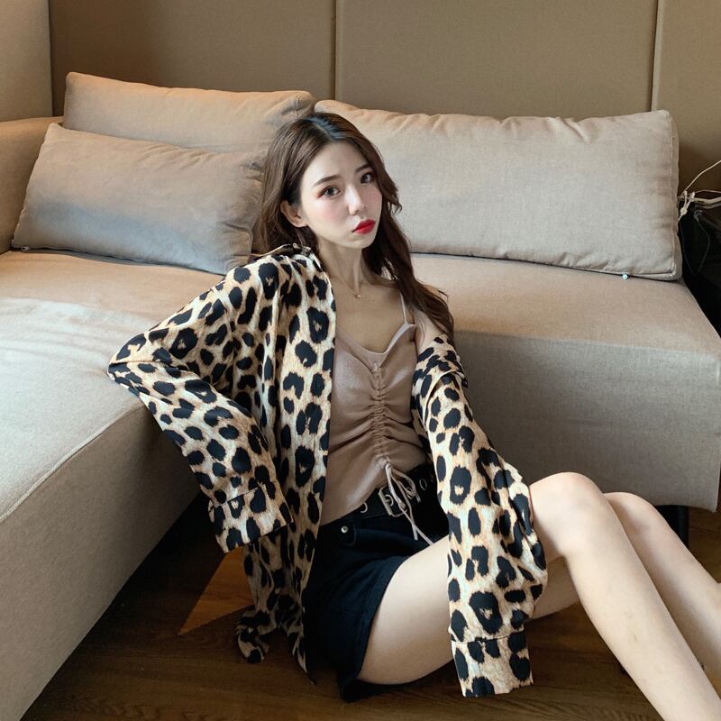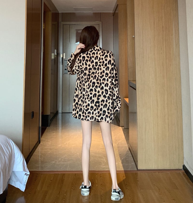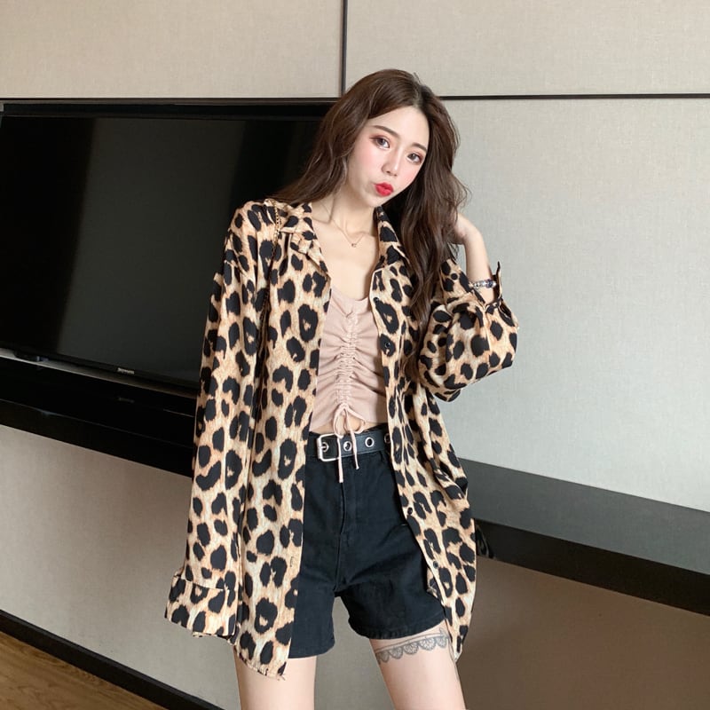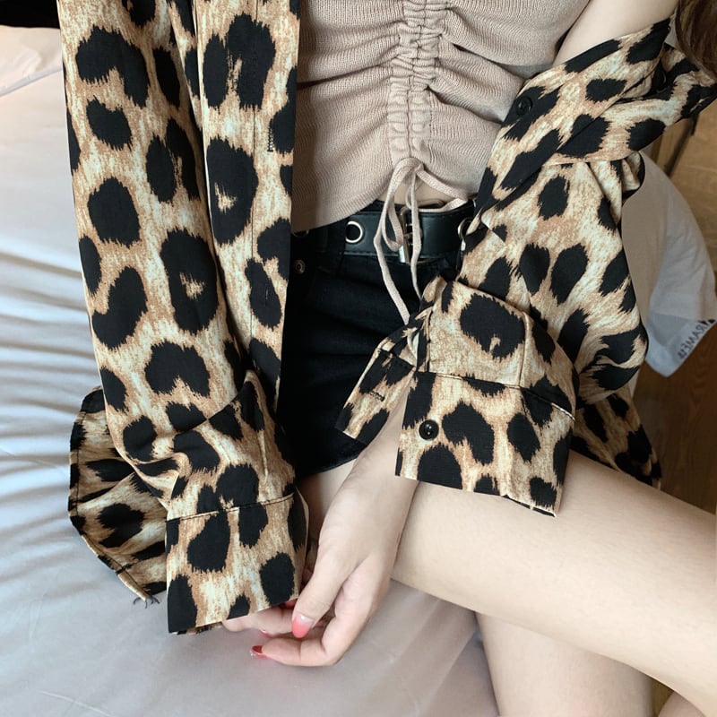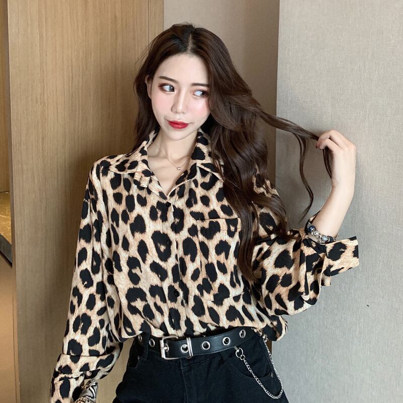 レオパード ブラウス シャツ 長袖 トップス ボタンシャツ ドロップショルダー アニマル柄 上品 カジュアル 韓国
