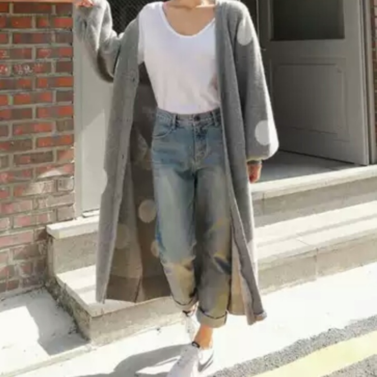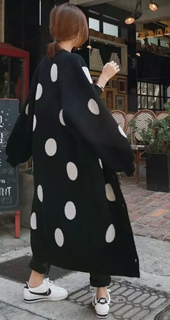 ドット柄がカジュアルで目を引くロングカーディガン。
