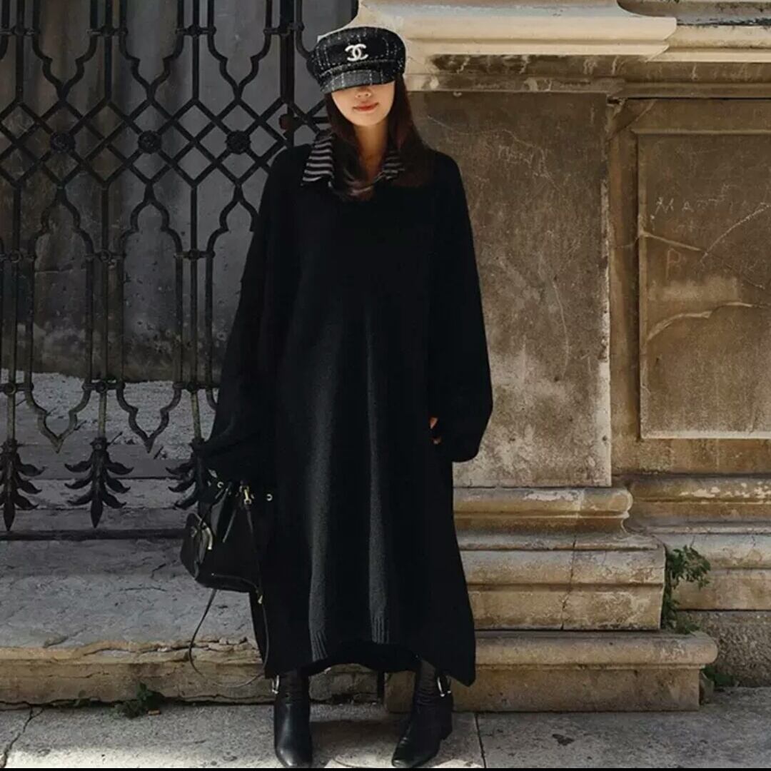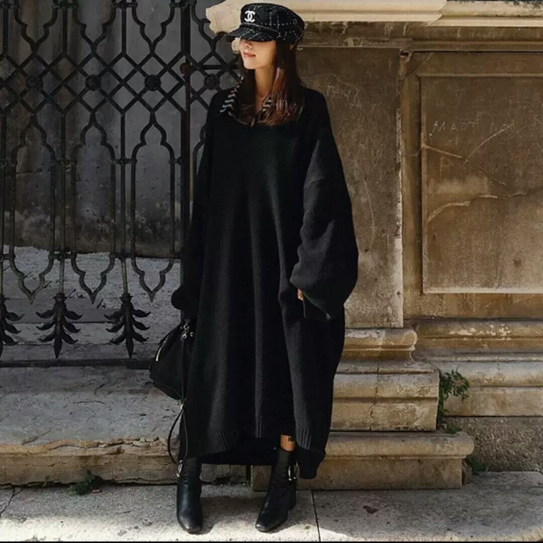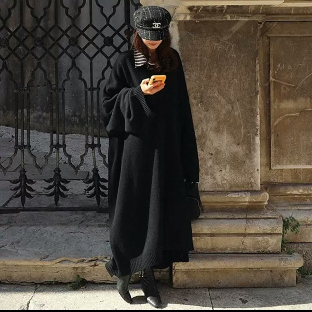 Vネック ロング ニット ワンピース セーター トップス 無地 シンプル 大人 カジュアル キレイめ 着まわし オーバーサイズ ゆったり フリーサイズ お出かけ お買い物 デート 女子会 通学 通勤 秋冬 春