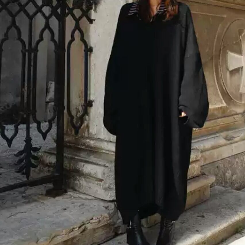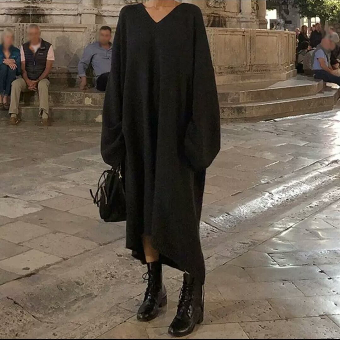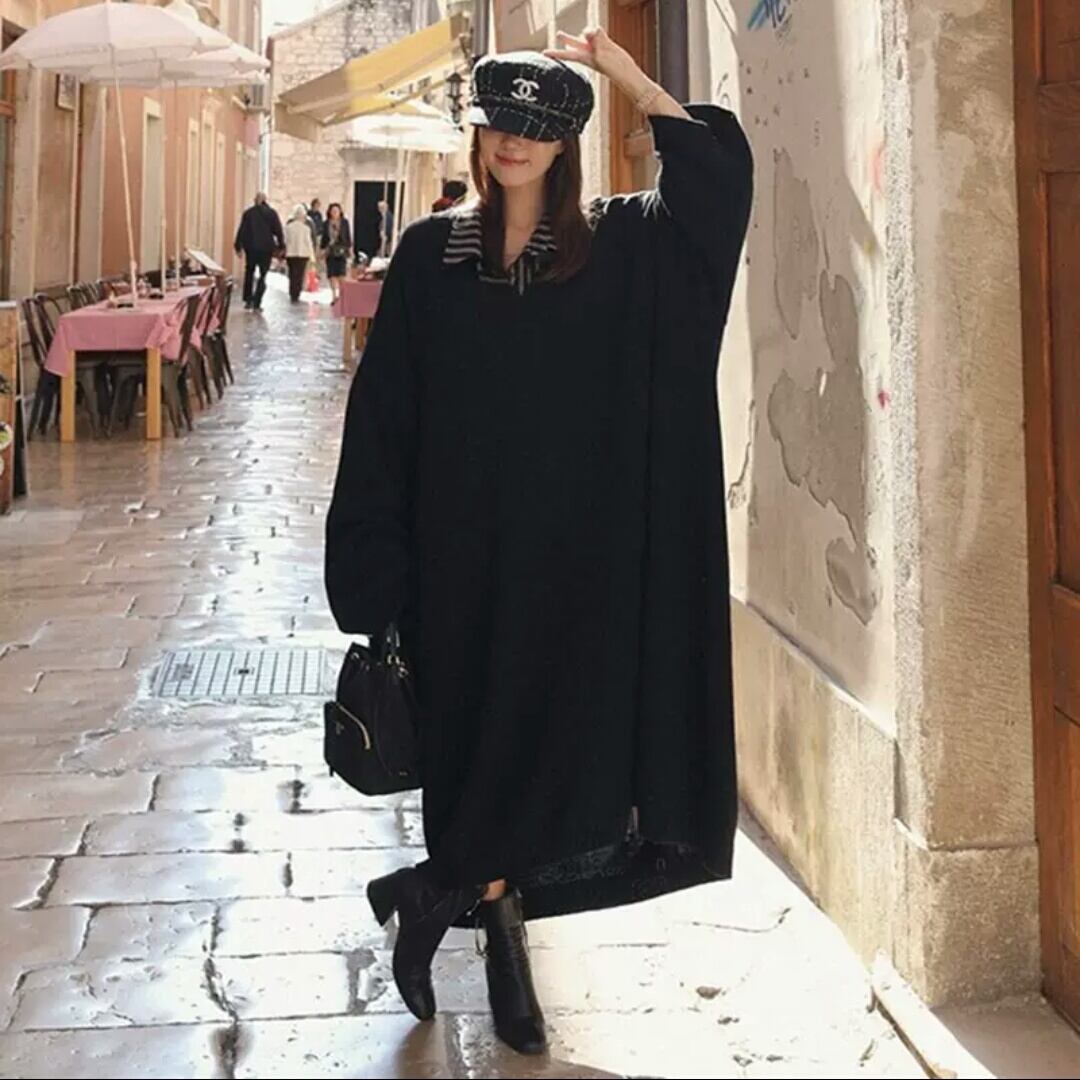 Vネック ロング ニット ワンピース セーター トップス 無地 シンプル 大人 カジュアル キレイめ 着まわし オーバーサイズ ゆったり フリーサイズ お出かけ お買い物 デート 女子会 通学 通勤 秋冬 春