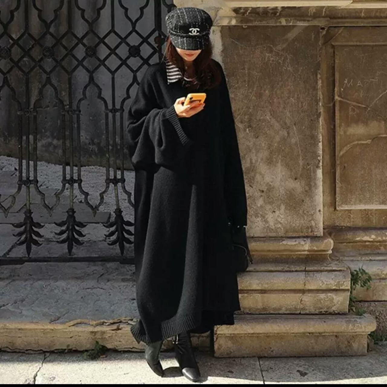 秋冬にピッタリのVネックロングニットワンピースです。