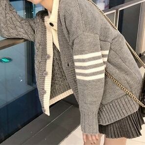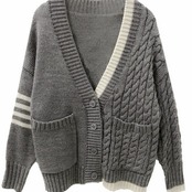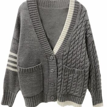 左右の模様が違うデザインがおしゃれなカーディガン。ショート丈でパンツにもスカートにもあうグレーのカーディガンは、これからの寒くなる季節にピッタリの一品です。