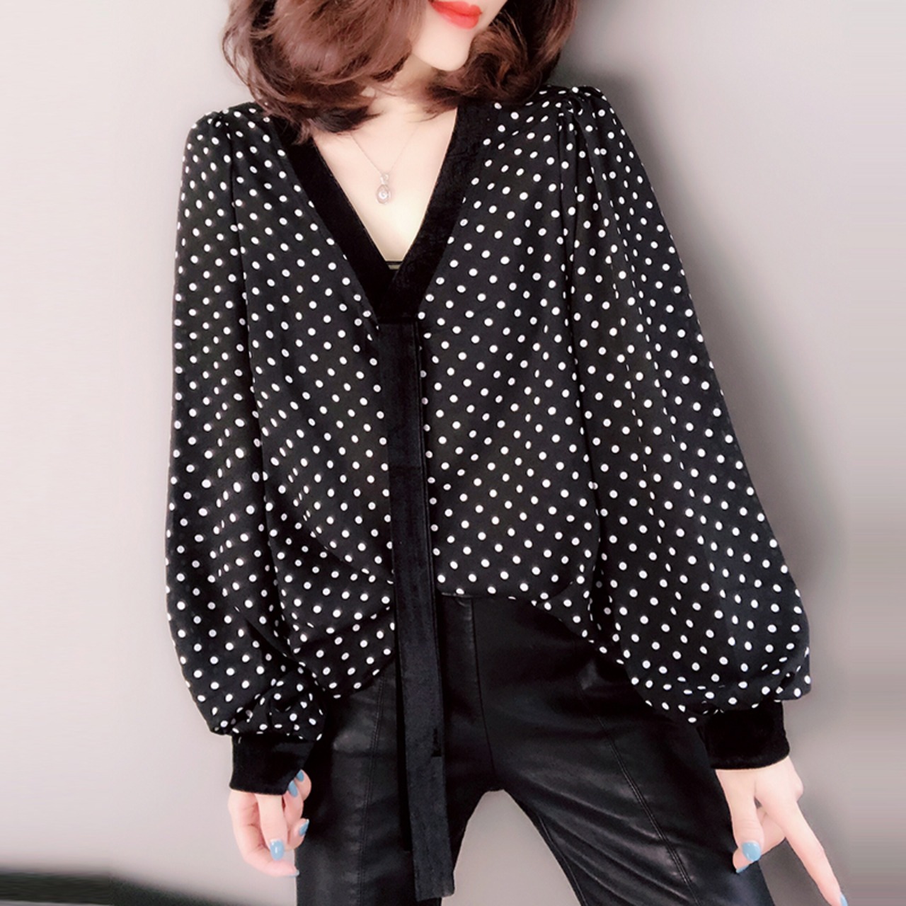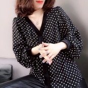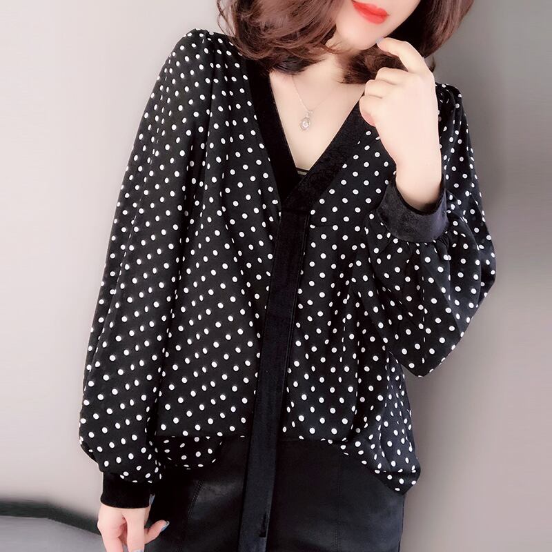 Vネック トップス ボウタイブラウス シャツ プルオーバー 水玉 ドット柄 ブラック 長袖 レトロ 通勤 カジュアル 韓国