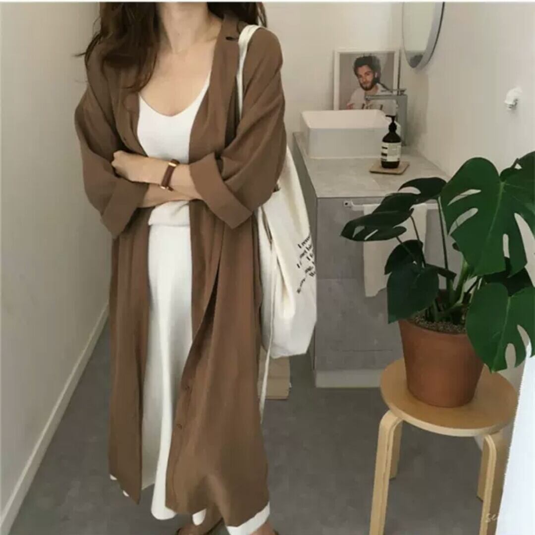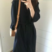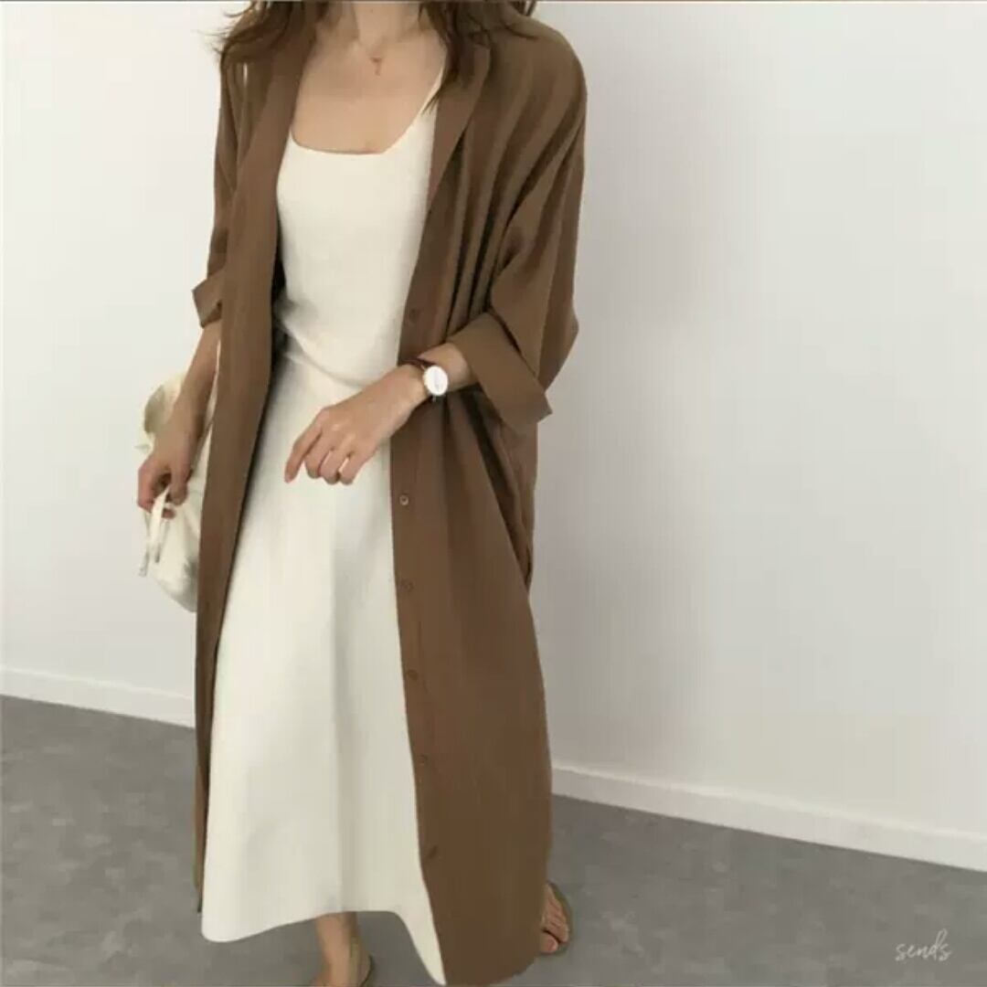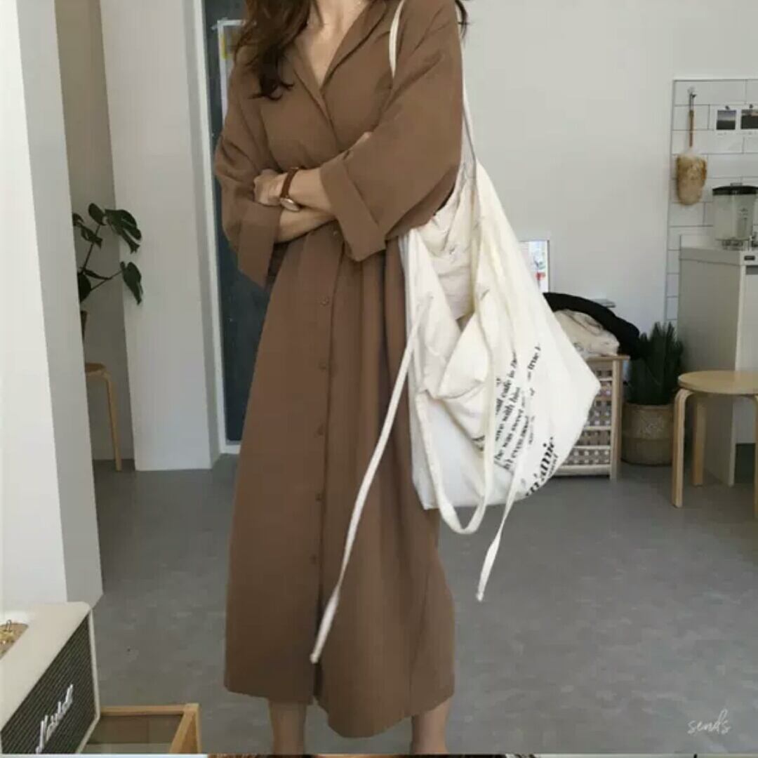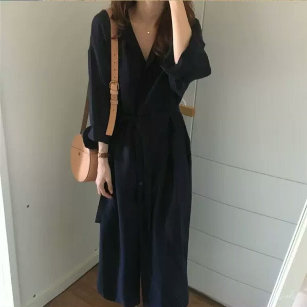 全2色 ロング丈 シャツ ワンピース フロントボタン 襟有り 長袖 無地 ウエストリボン 大人 カジュアル キレイめ シンプル 羽織り トップス アウター 秋冬 春 通勤 通学 オフィス お出かけ お買い物 デート 女子会