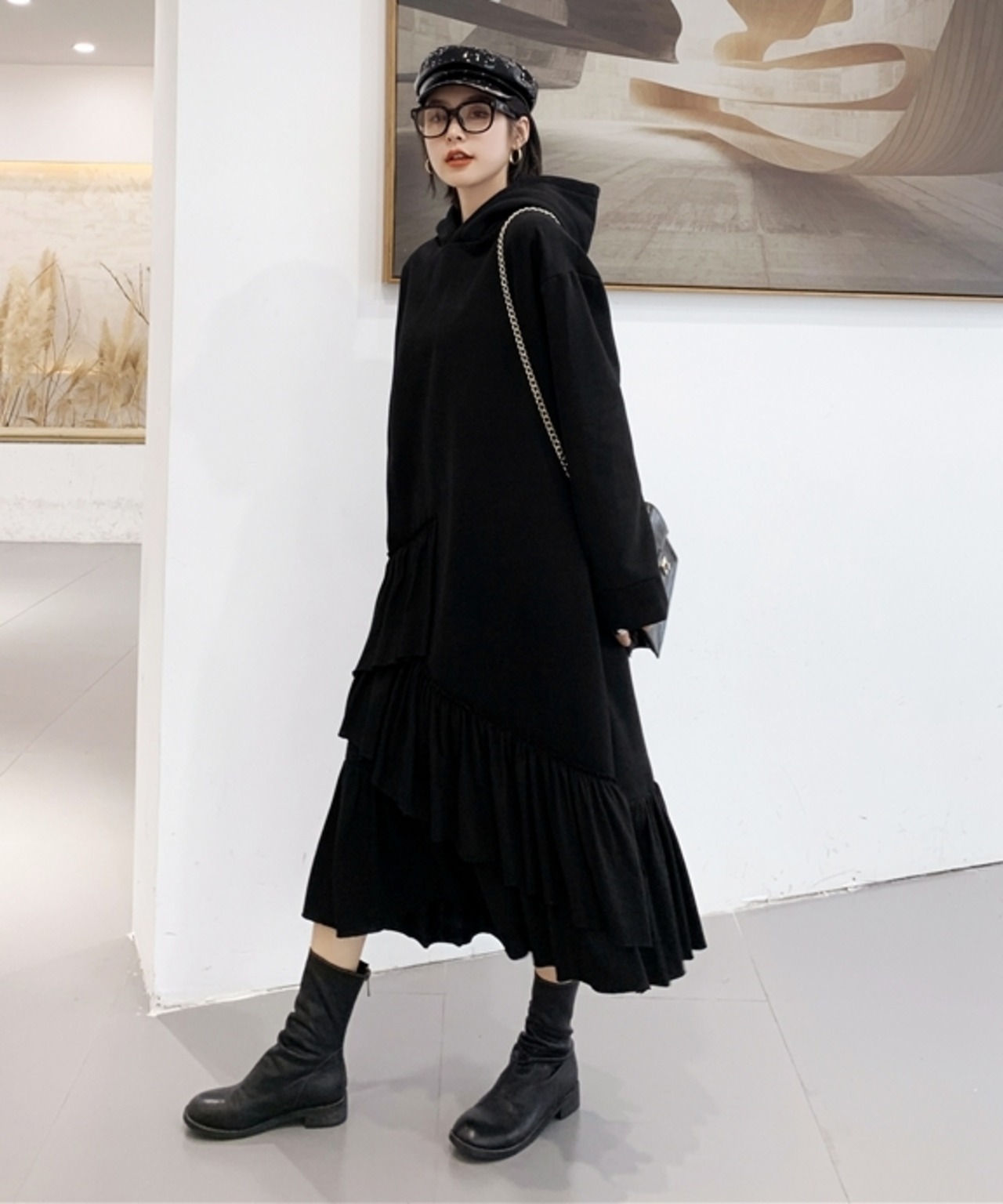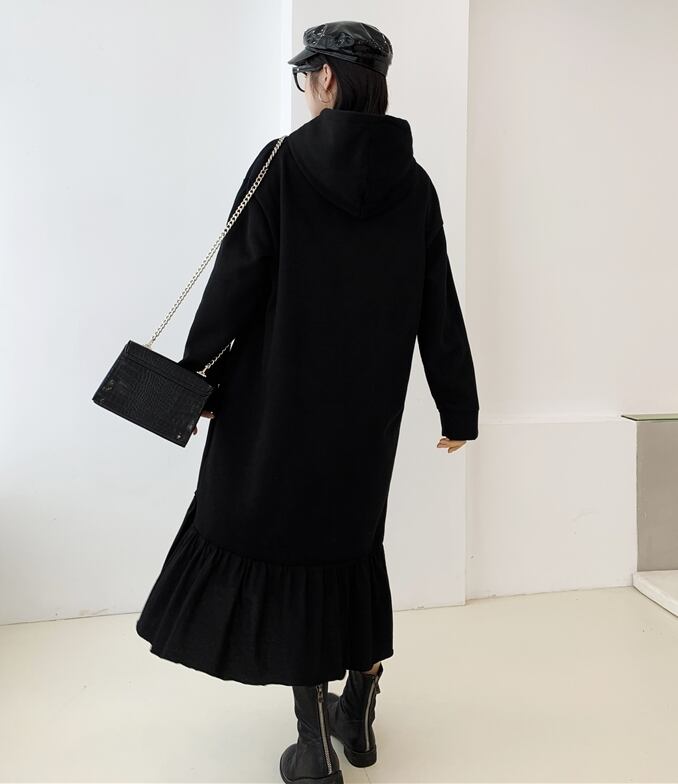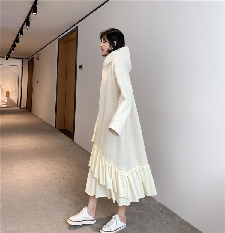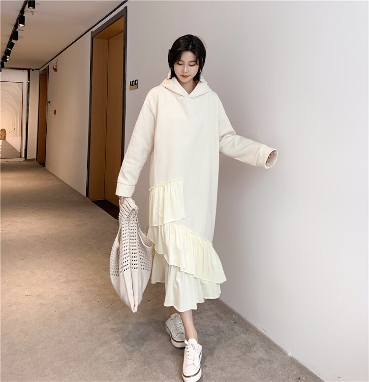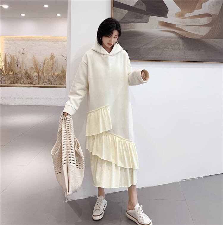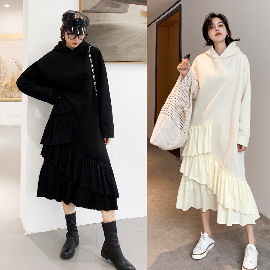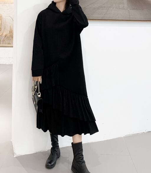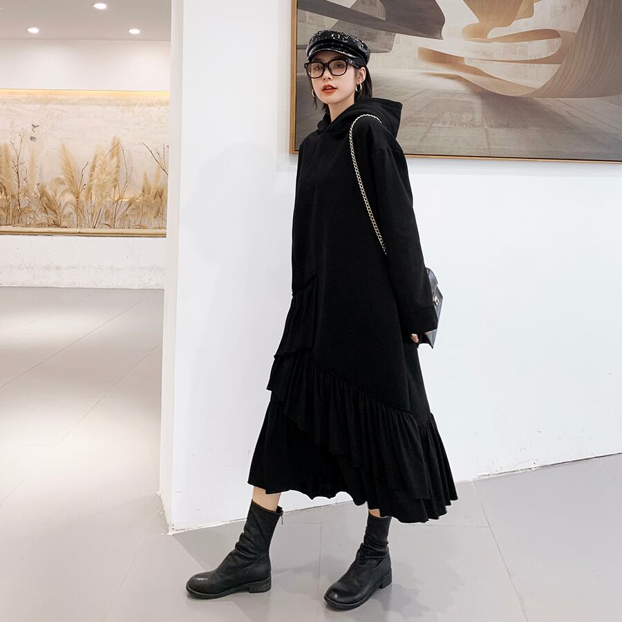 全2色 ワンピース フード付き フリル ティアード アシンメトリー ゆったり ロングスリーブ 長袖 ミモレ丈 大人可愛い ガーリー 秋 春 冬 体型カバー