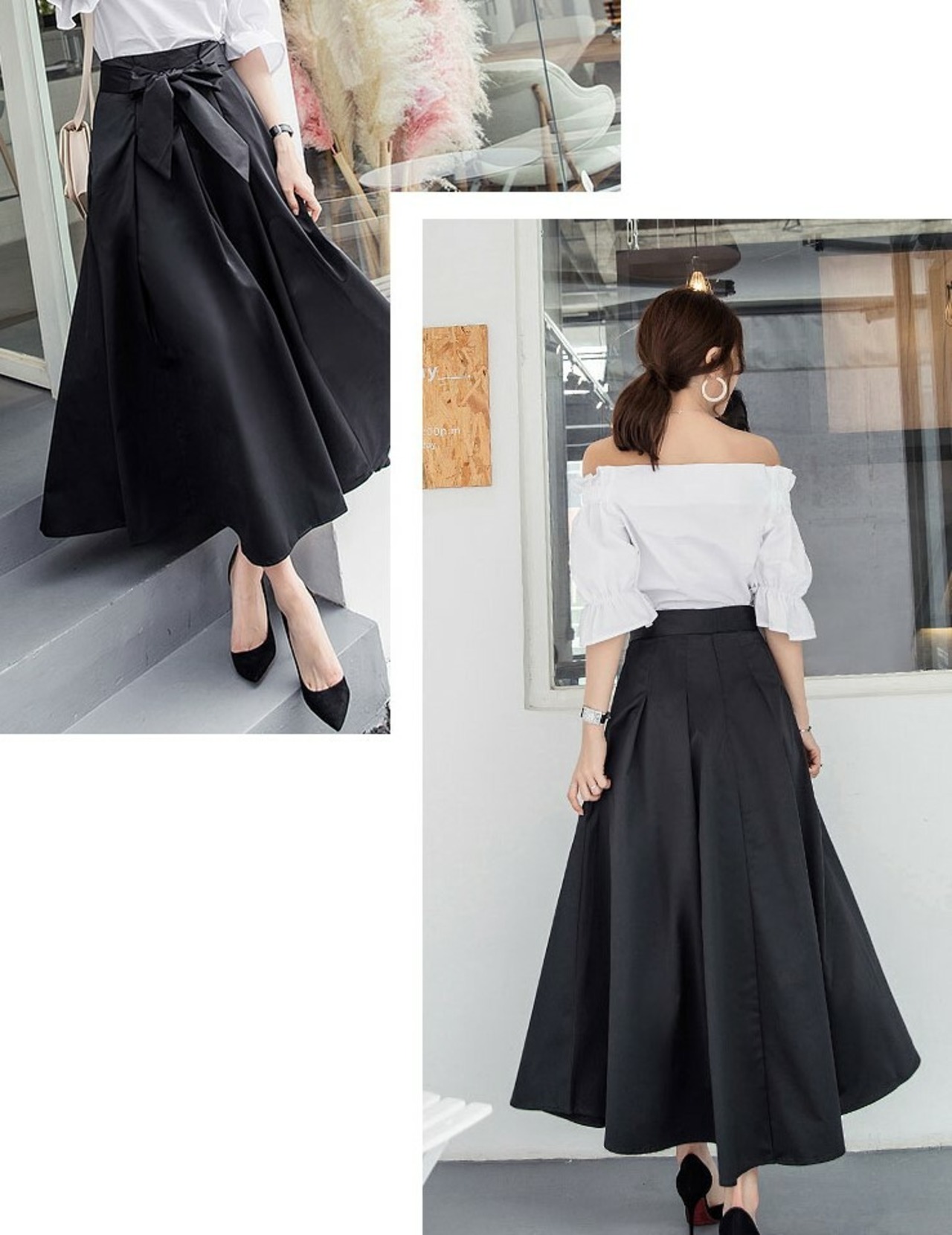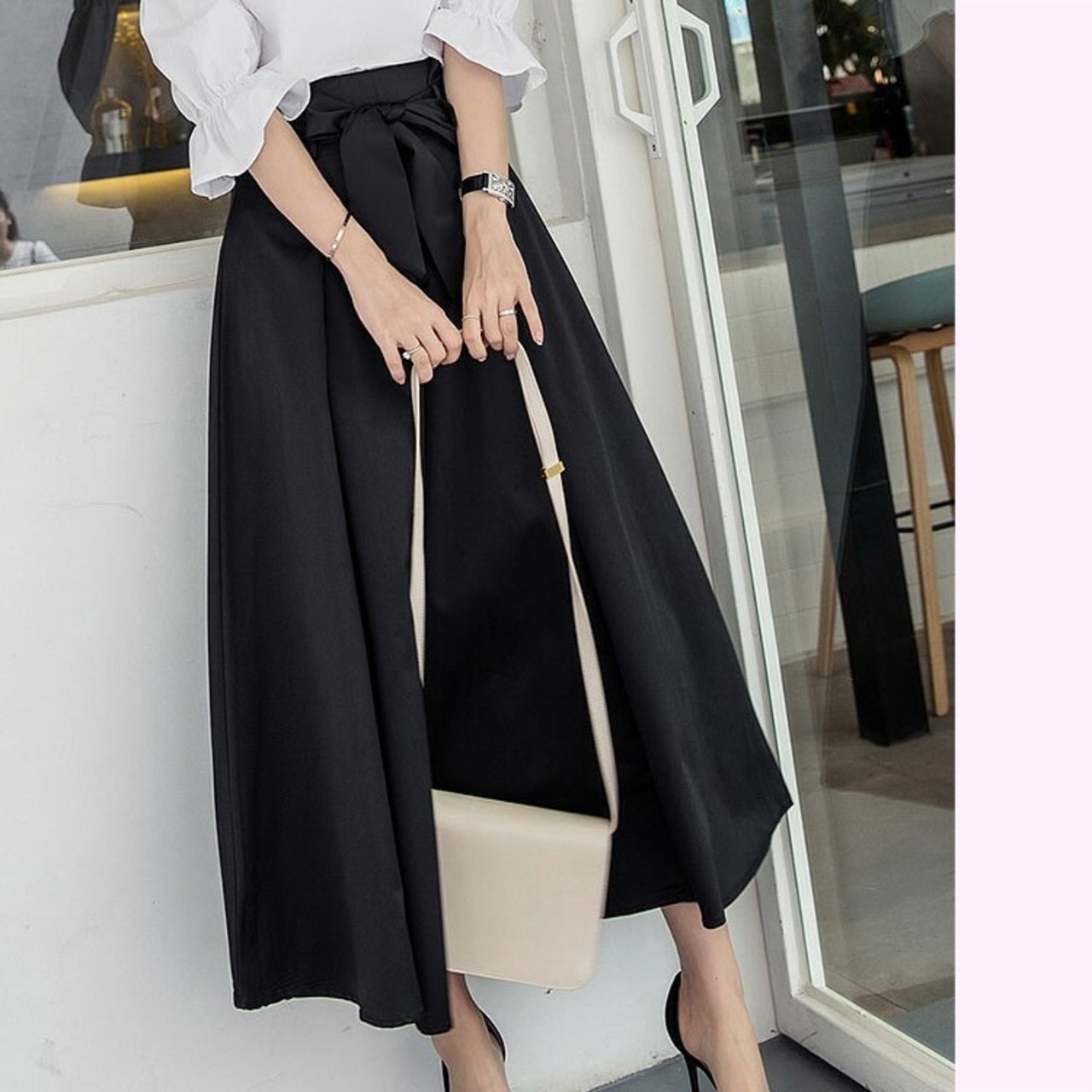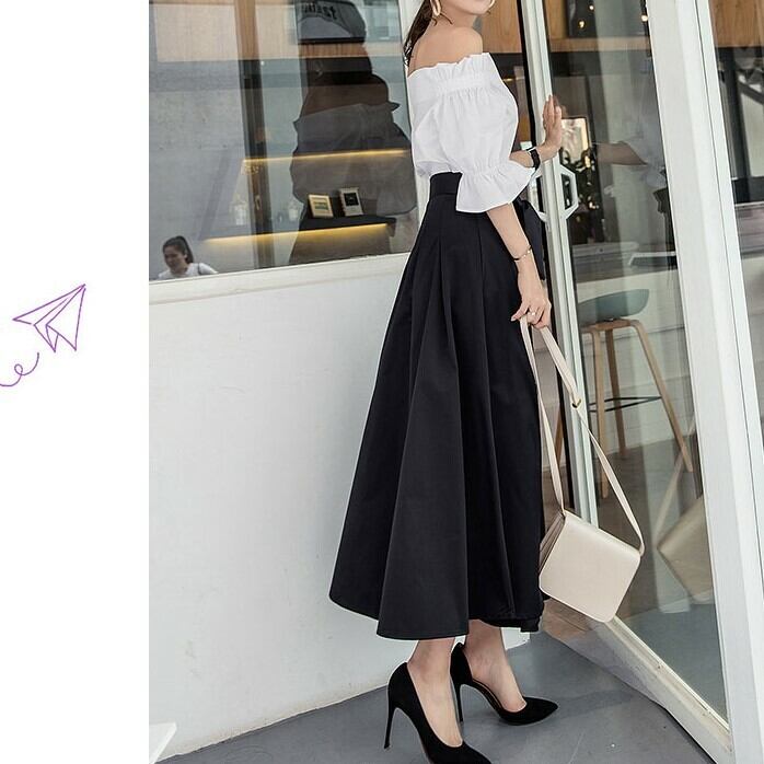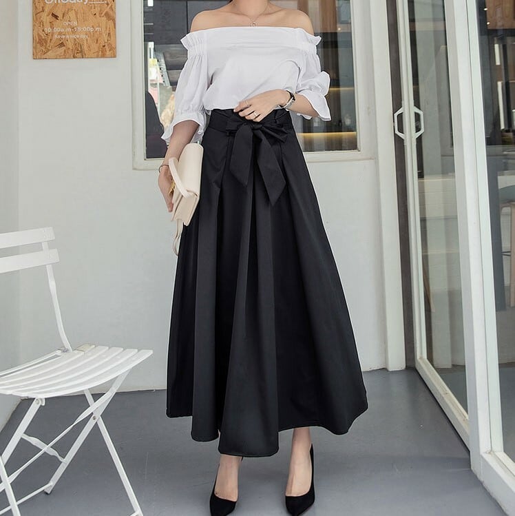 ウエストの大きめリボンがアクセントのロングスカート。