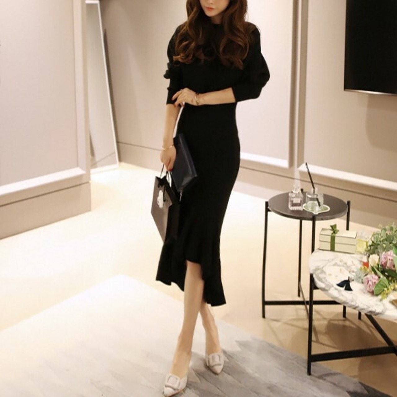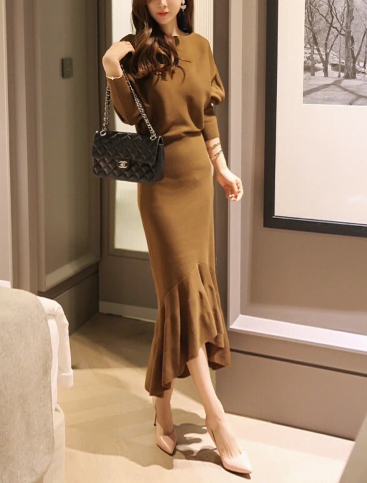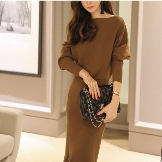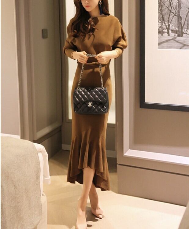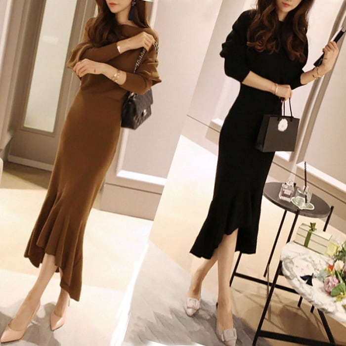 全2色 ニットワンピース ロング ひざ丈 フィッシュテール マーメイド タイト 無地 長袖 フリル セクシー お出かけ デート パーティ ブラック ブラウン 秋冬