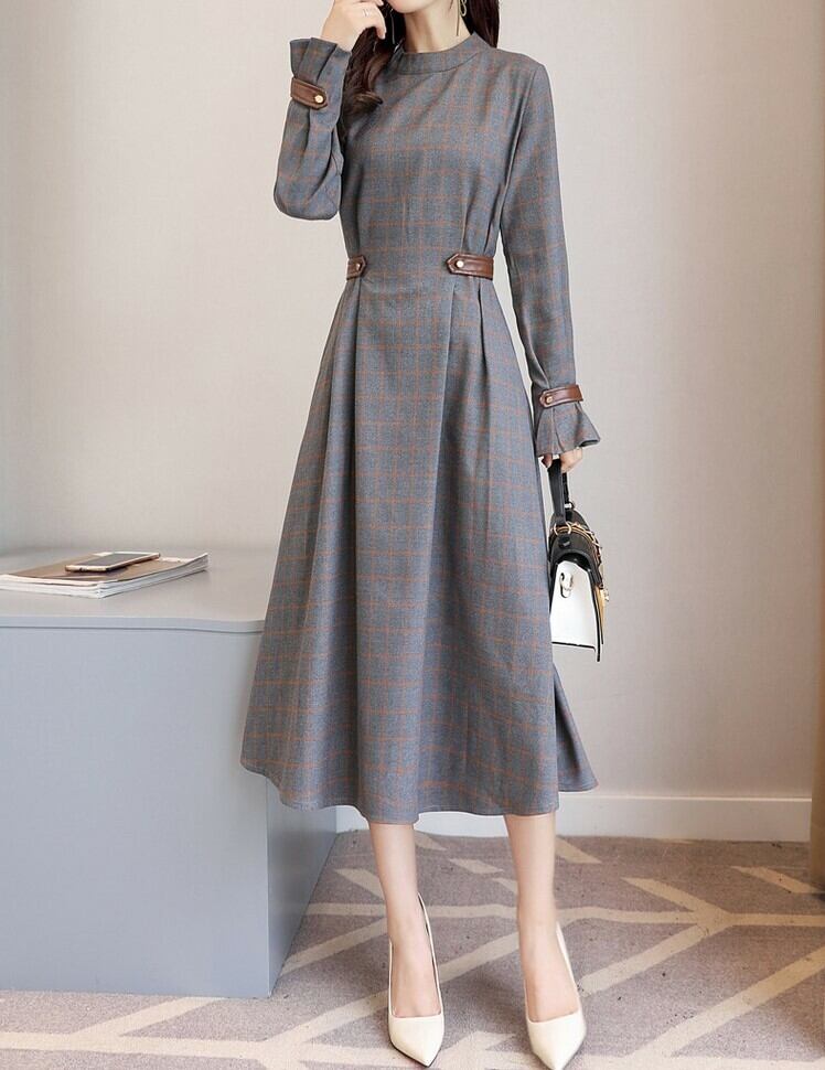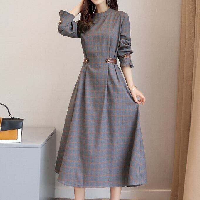 ワンピース ミモレ丈 長袖 ラウンドネック グレンチェック きれいめ 上品 オフィス 通勤 お呼ばれ デート パーティ グレー 秋冬