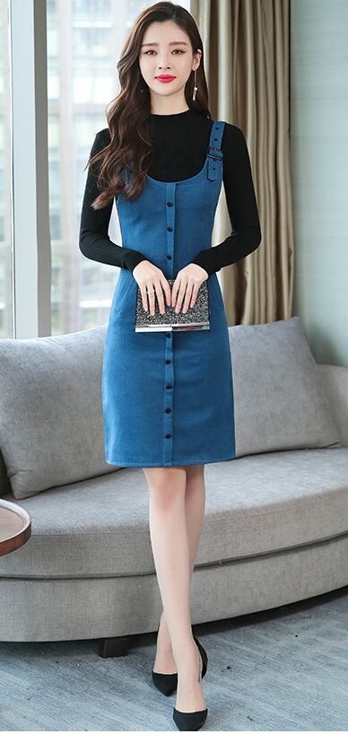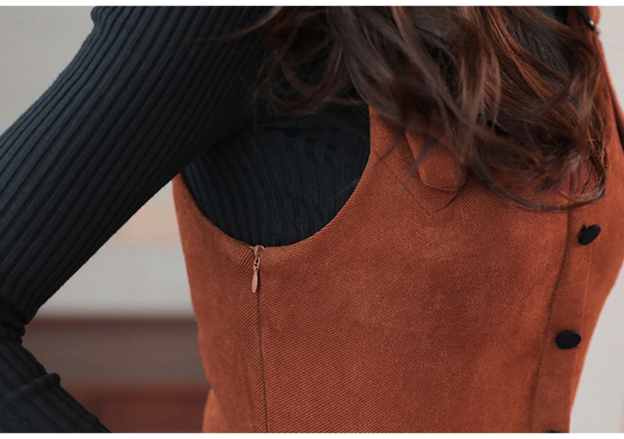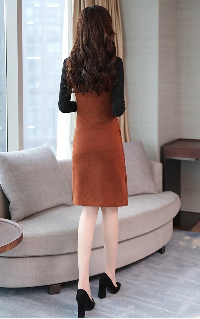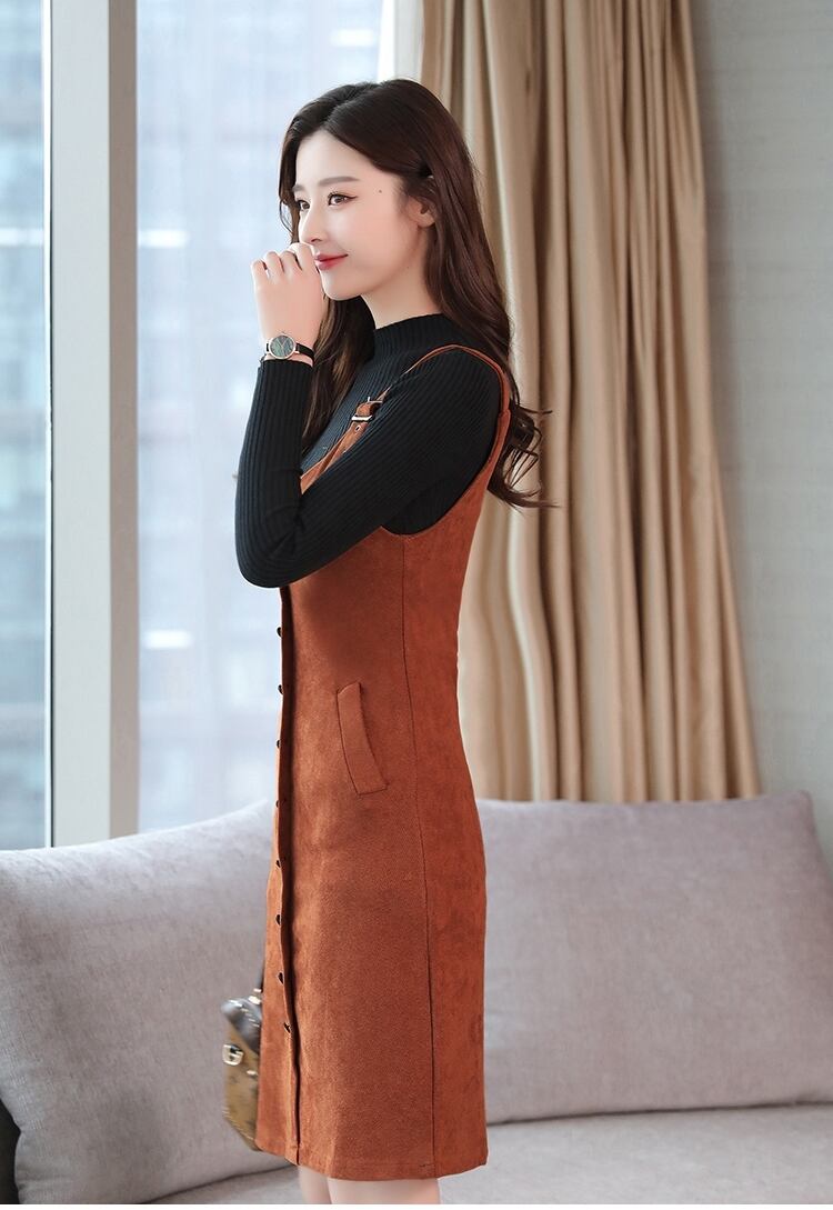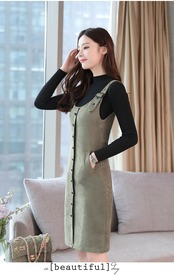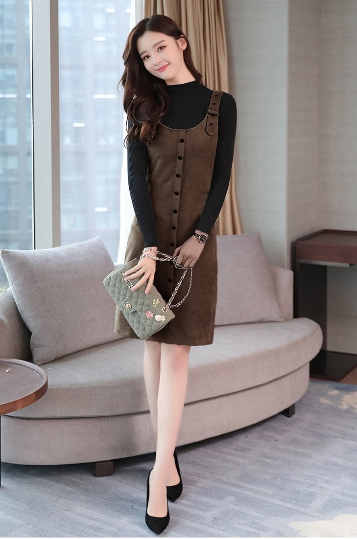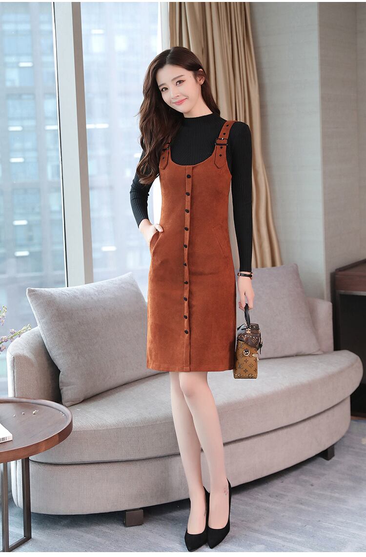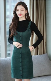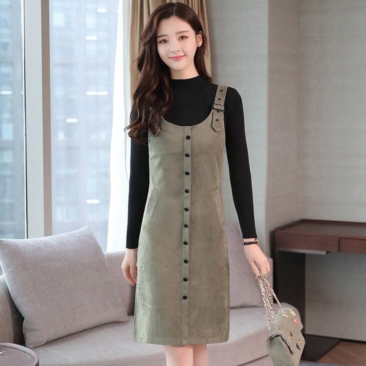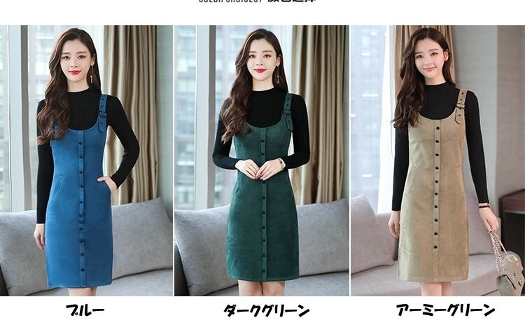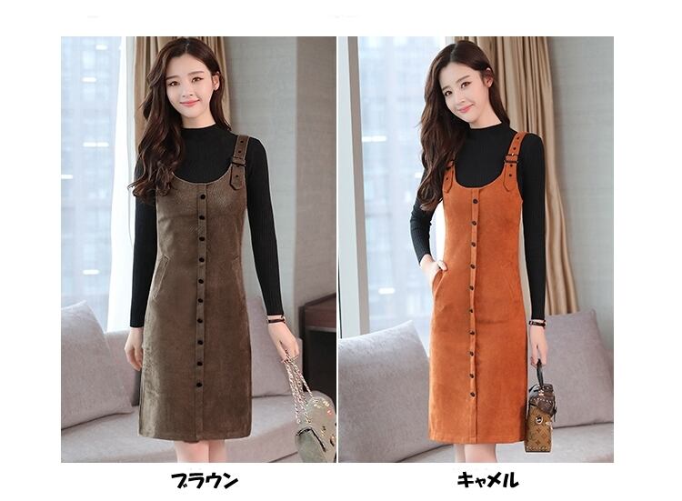 全5色 ツーピース ウール ワンピース サロペット スカート サスペンダー ボタン ショート丈 タイト ストラップ Uネック 上品 カジュアル ポケット 秋