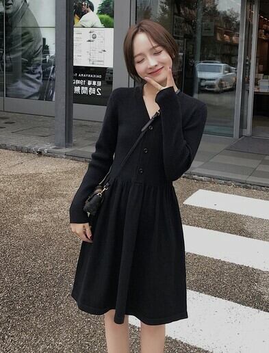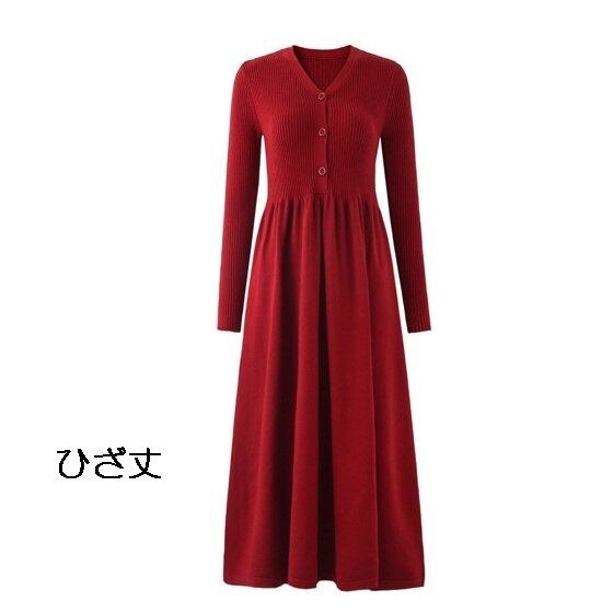 全2種4色 選べる丈 ニットワンピース ひざ丈 ミニ丈 フロントボタン フレアスカート 秋 冬 シンプル ニットドレス Vネック 長袖 エレガント カジュアル 韓国 オルチャン