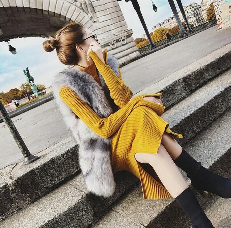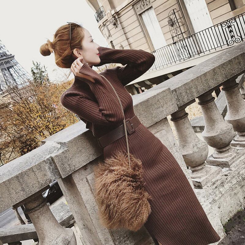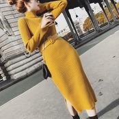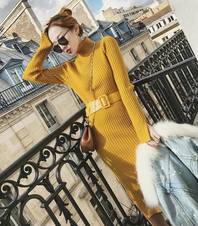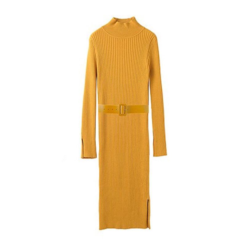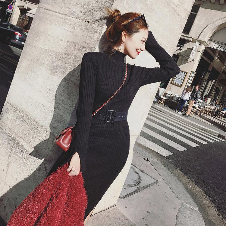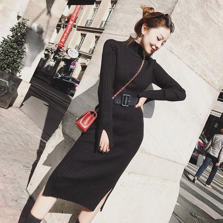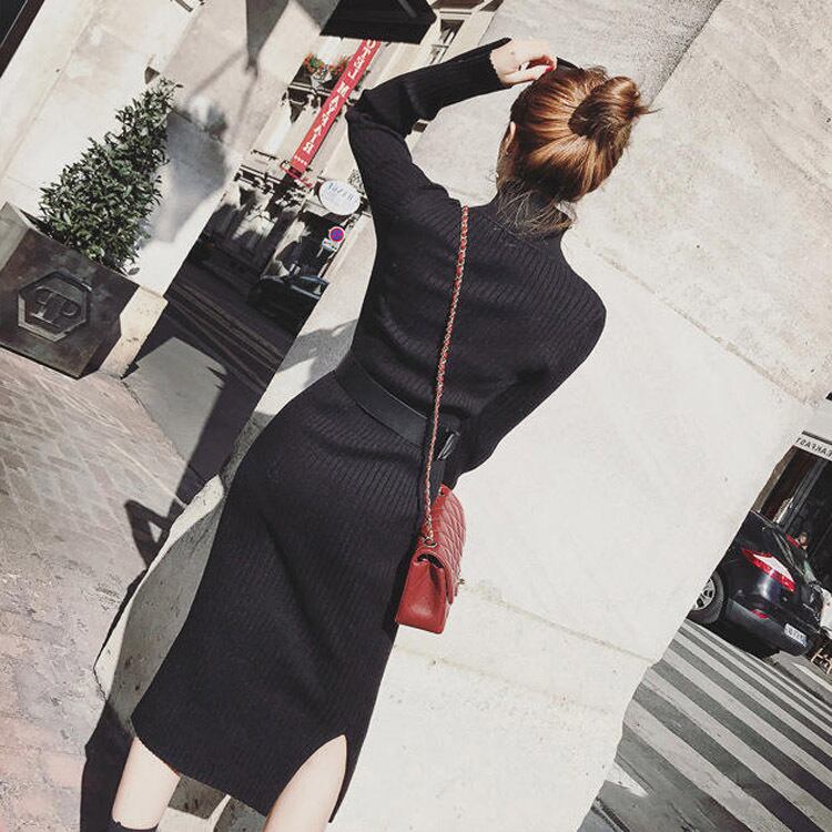 全3色 リブニットワンピース ニットドレス タイト タートルネック ハイネック ウエストベルト サイドスリット 長袖 大人カジュアル エレガント セクシー 韓国 オルチャン 秋 冬