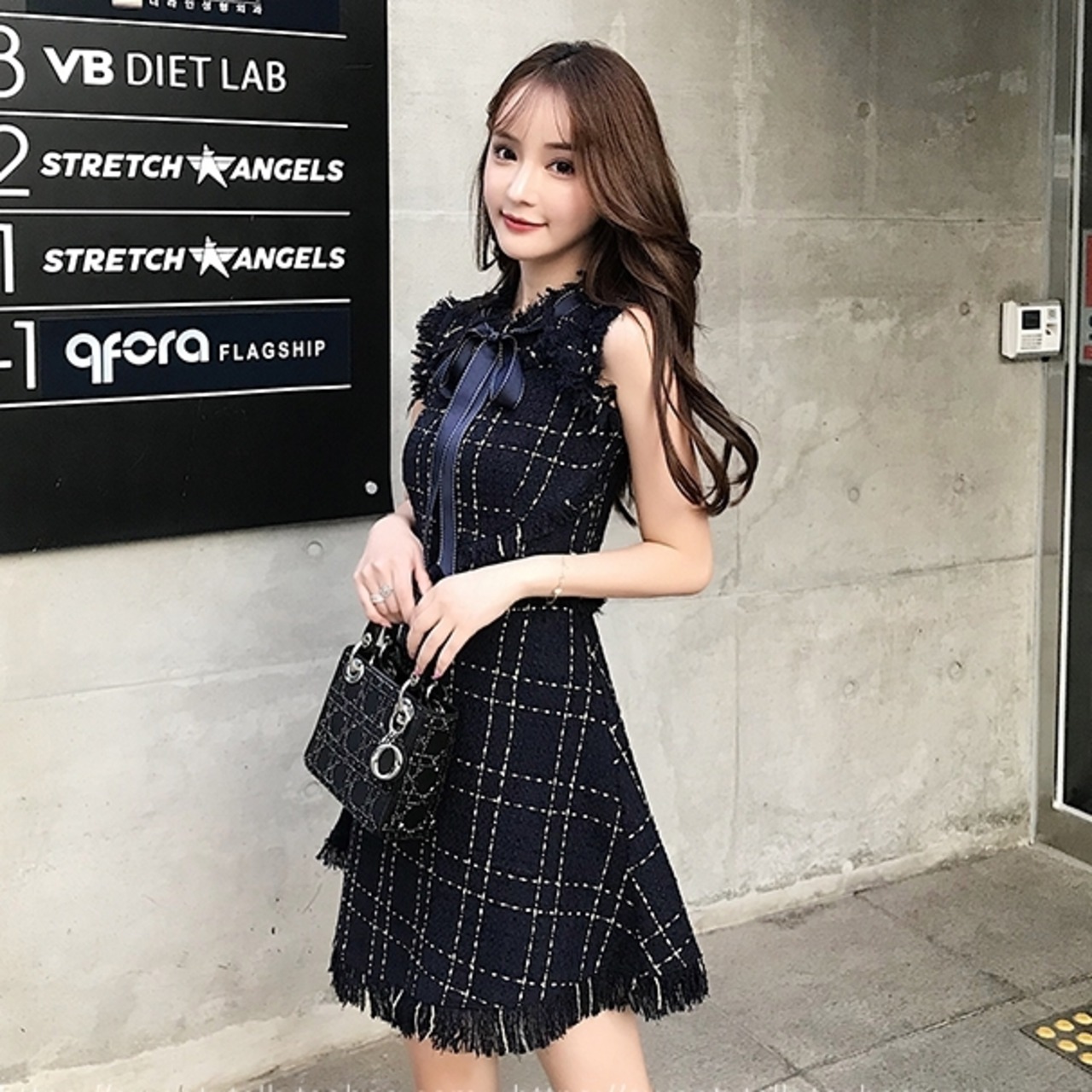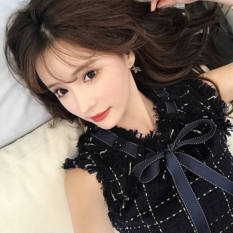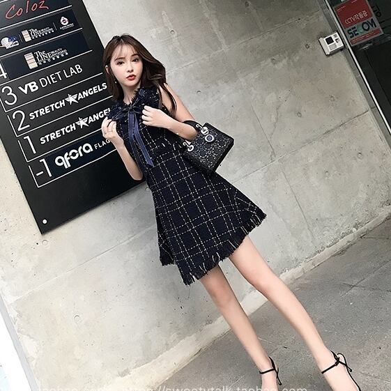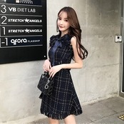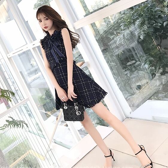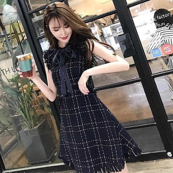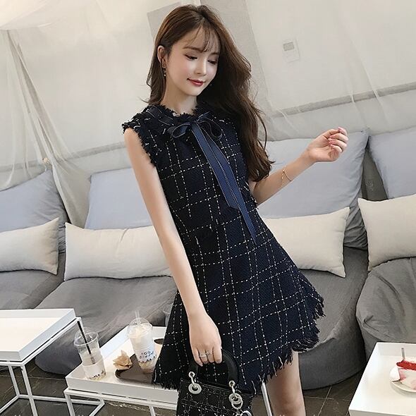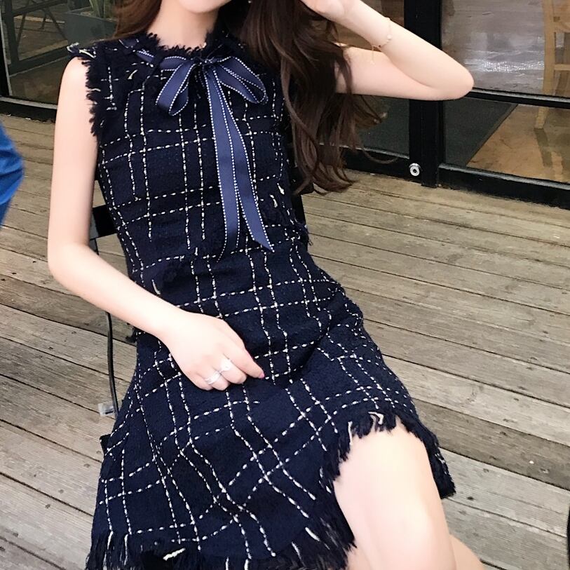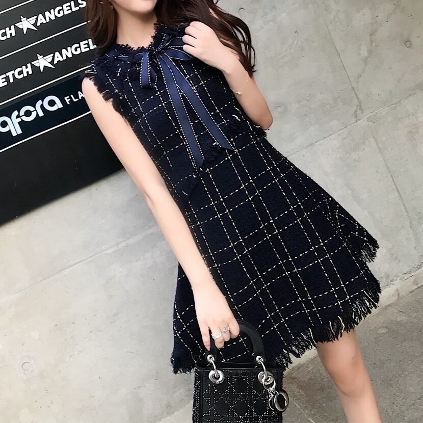 ノースリワンピース チェック柄 ボウタイワンピ フロントリボン ひざ上 ハイウエスト フレア フリンジ風 可愛い キレイ 脚長効果 デート 女子会