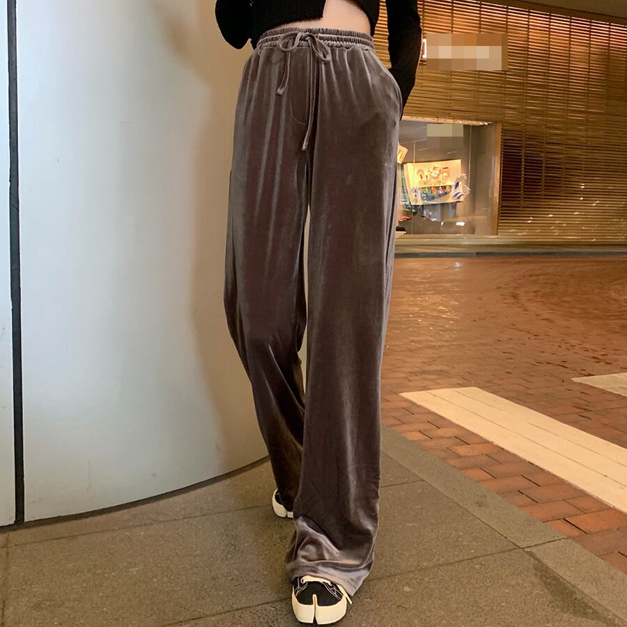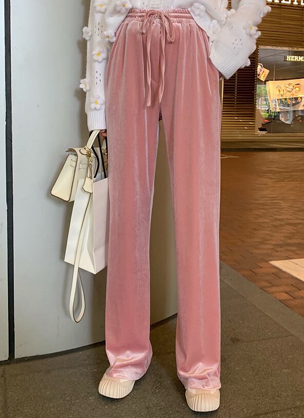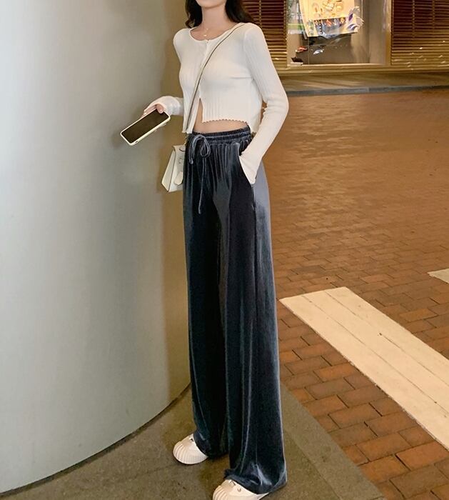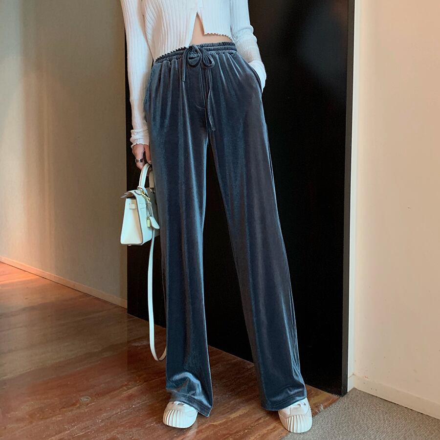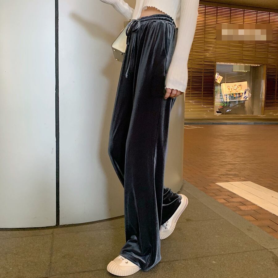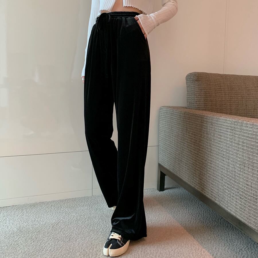 全4色 ベルベット 光沢 パンツ ワイドパンツ ゆったり カジュアル 秋 冬 リボン ハイウエスト ポケット ロング丈