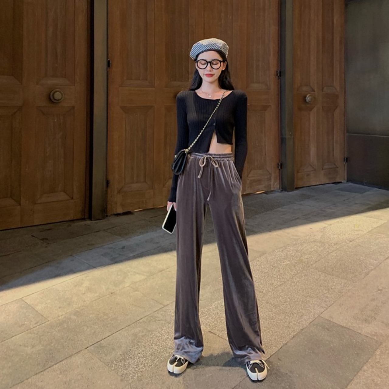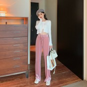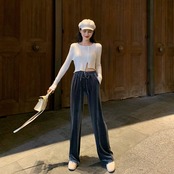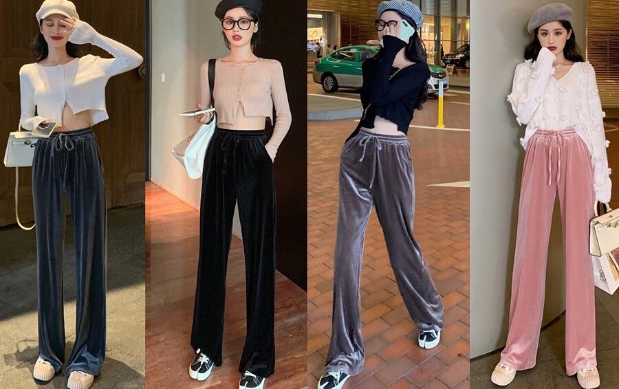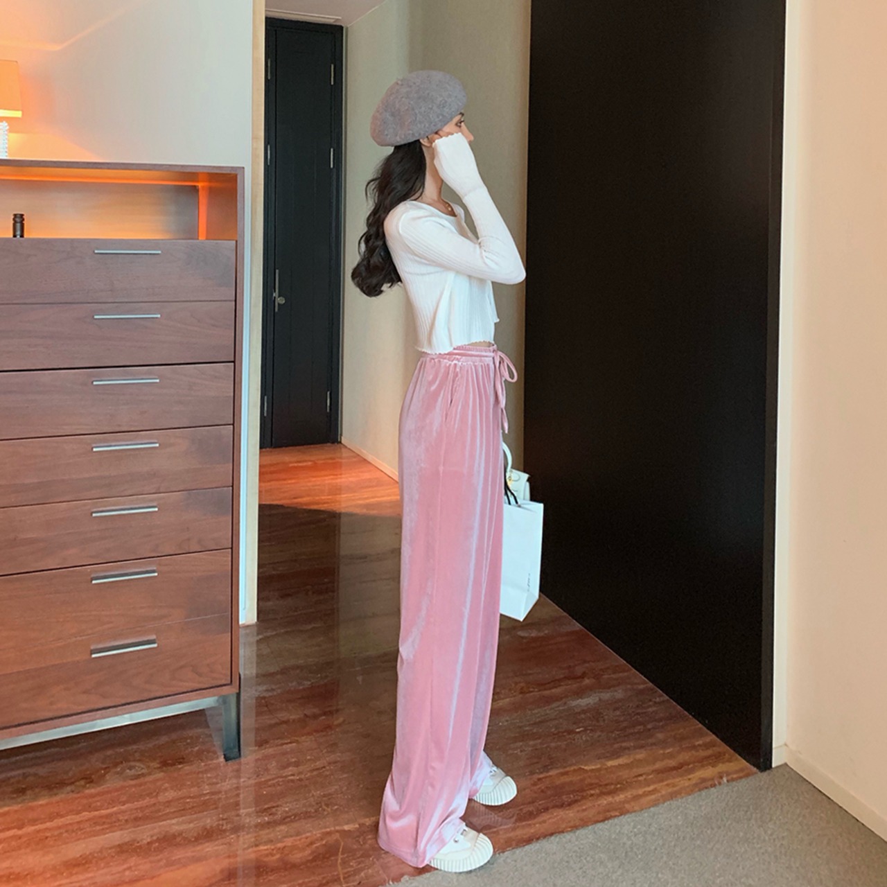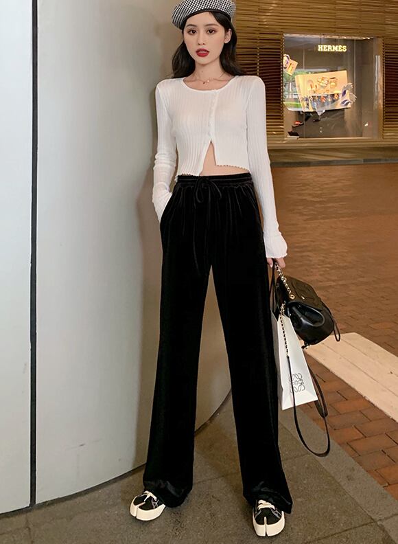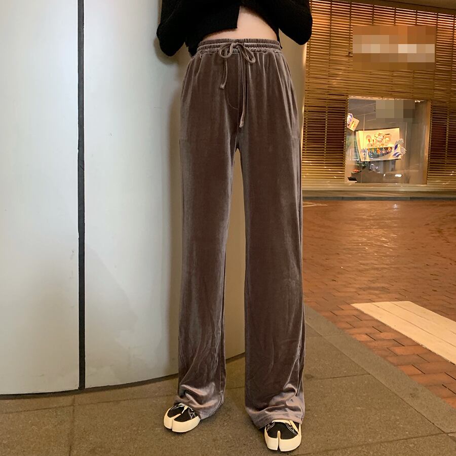 全4色 ベルベット 光沢 パンツ ワイドパンツ ゆったり カジュアル 秋 冬 リボン ハイウエスト ポケット ロング丈