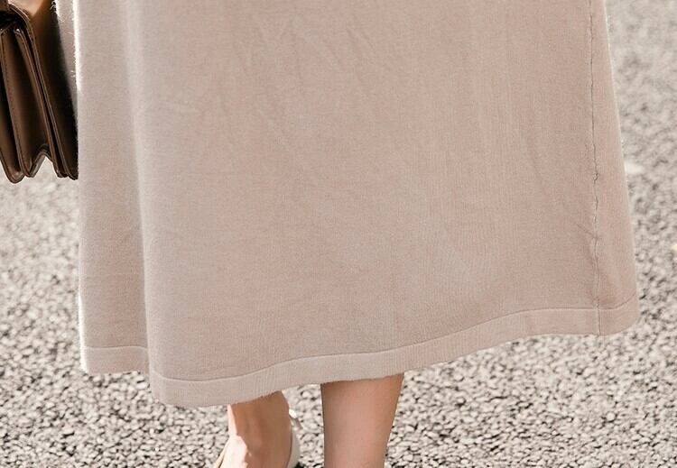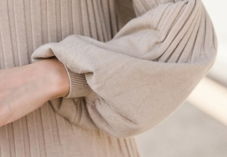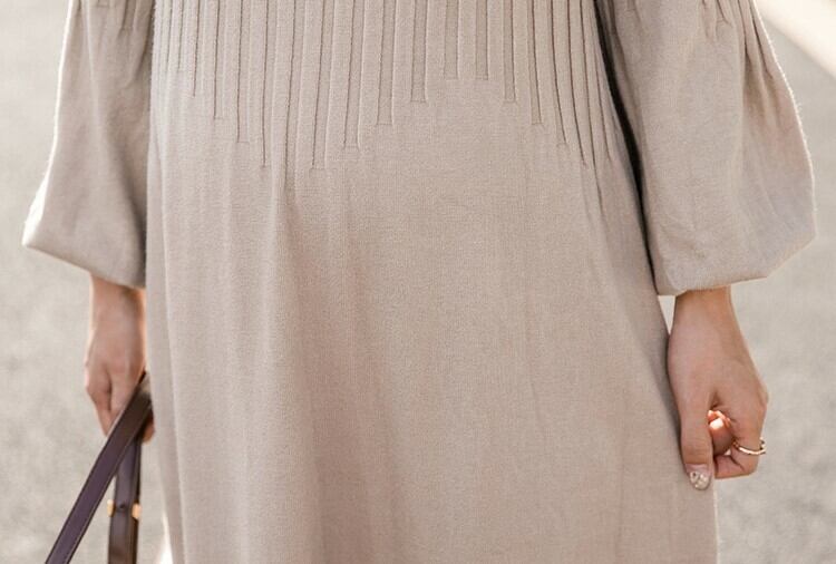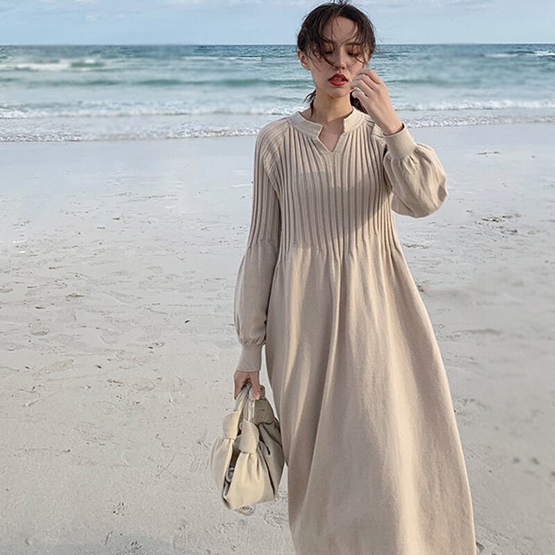 全2色 リブニットワンピース ドレス ロング丈 Vネック ラグランスリーブ パフスリーブ 長袖 秋 冬 ベージュ ブルー ブラック ブラウン 大人カジュアル 休日 韓国 オルチャン