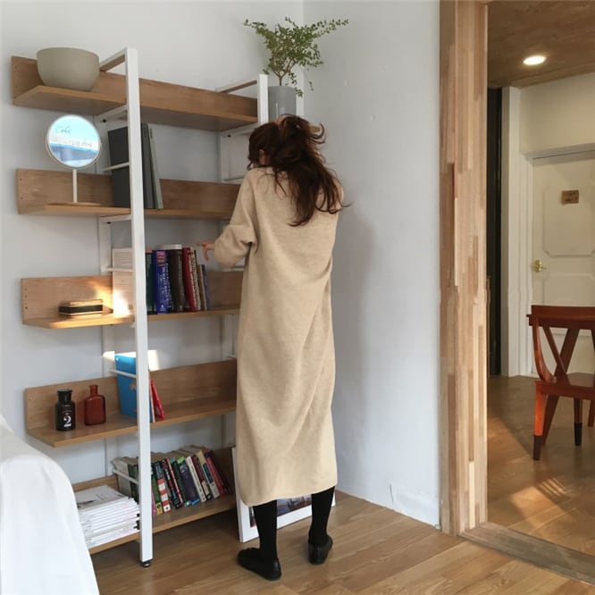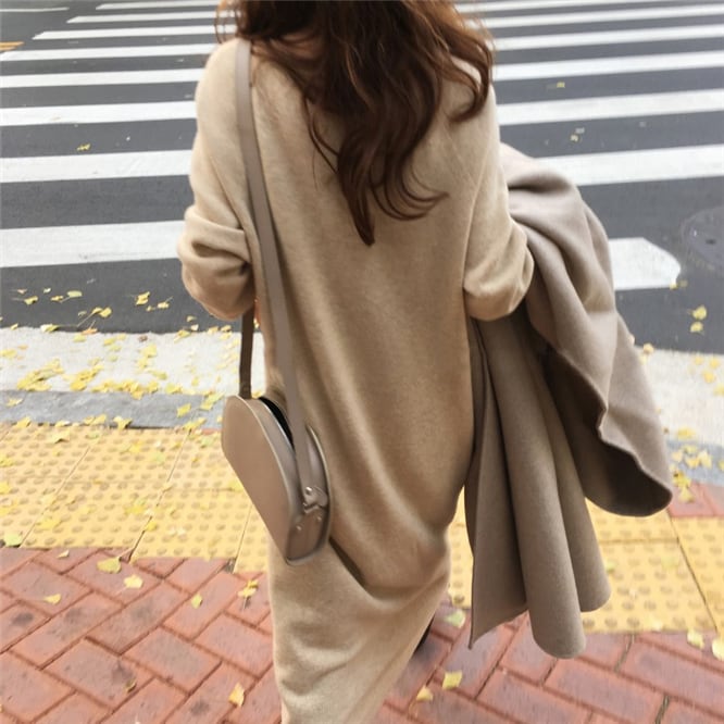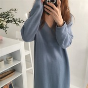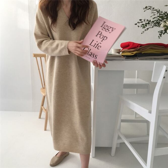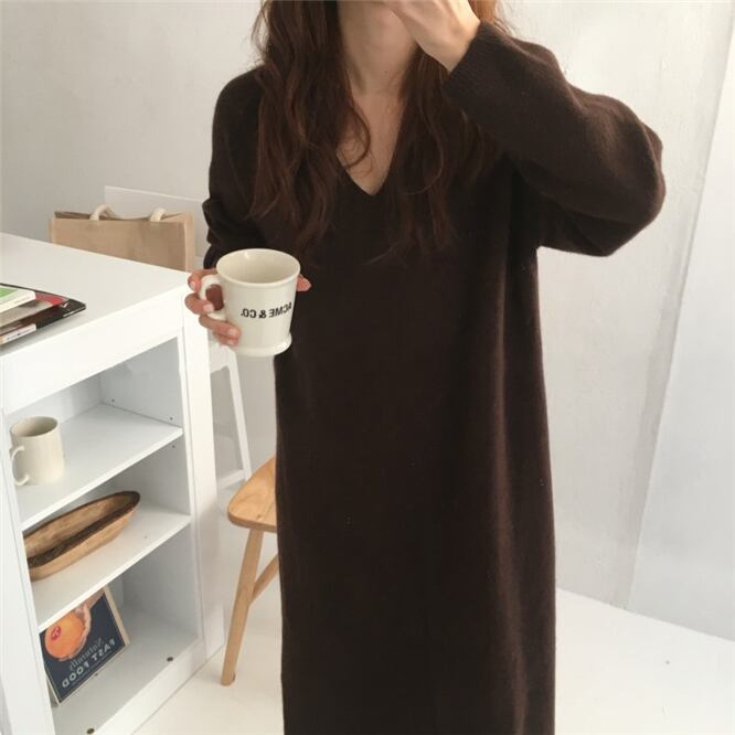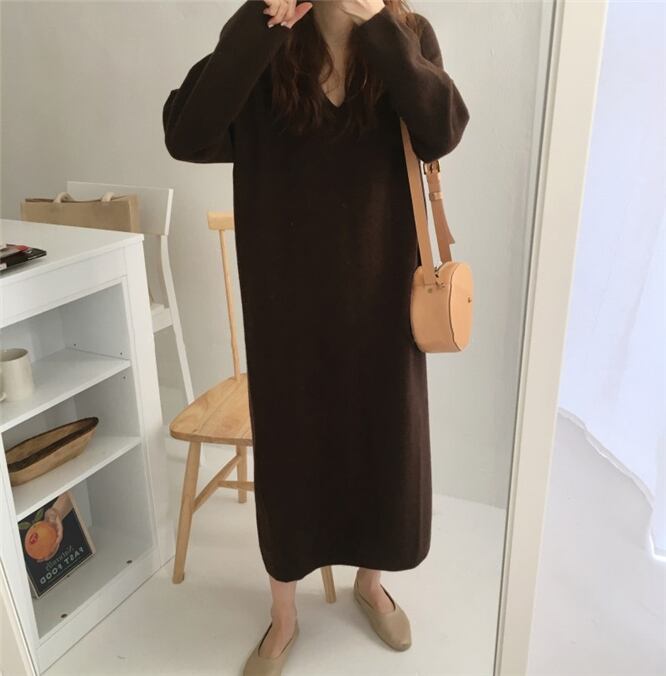 全4色 ニットワンピース ドレス Vネック 長袖 シンプル ベーシック ロング丈 ミモレ丈 ブルー ベージュ ブラック ブラウン ラグランスリーブ 大人カジュアル 休日 韓国 オルチャン