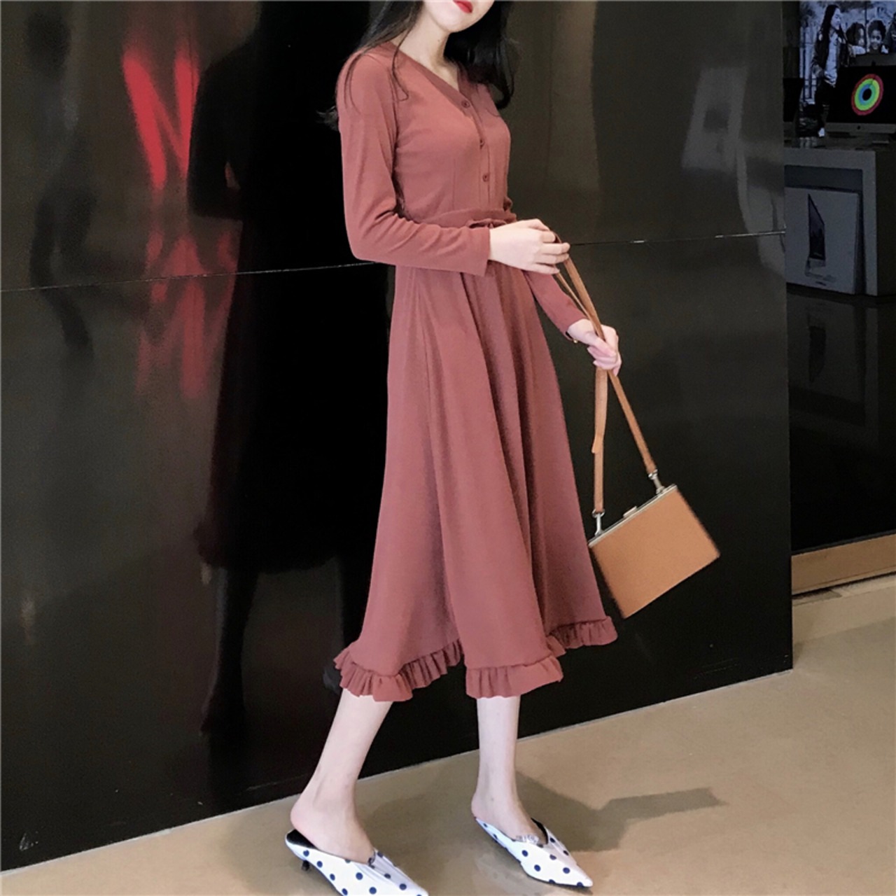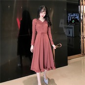 全2色 ロングワンピース Vネック フレア フロントボタン ウエストマーク 長袖 ブラック ピンク エレガント ドレス 上品 デート 秋 冬 韓国 オルチャン