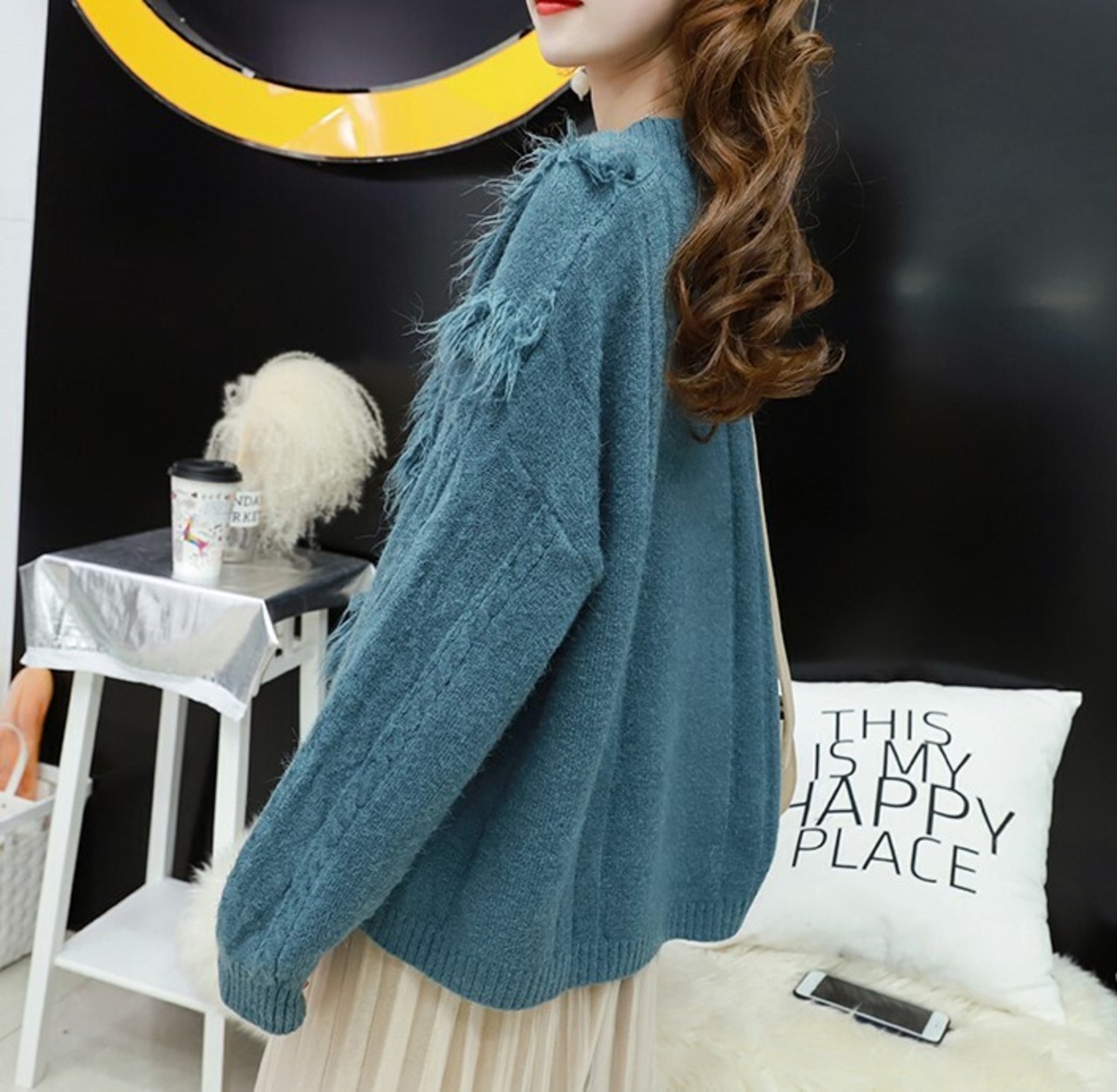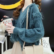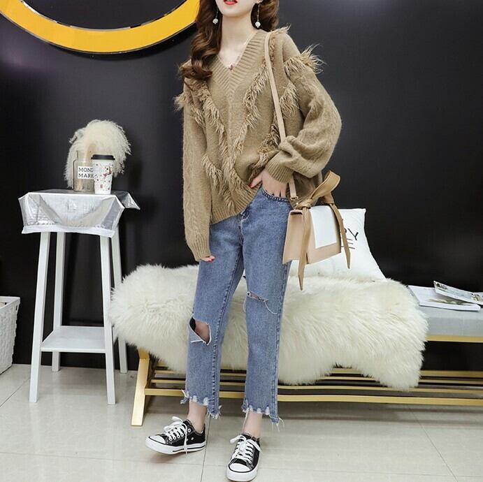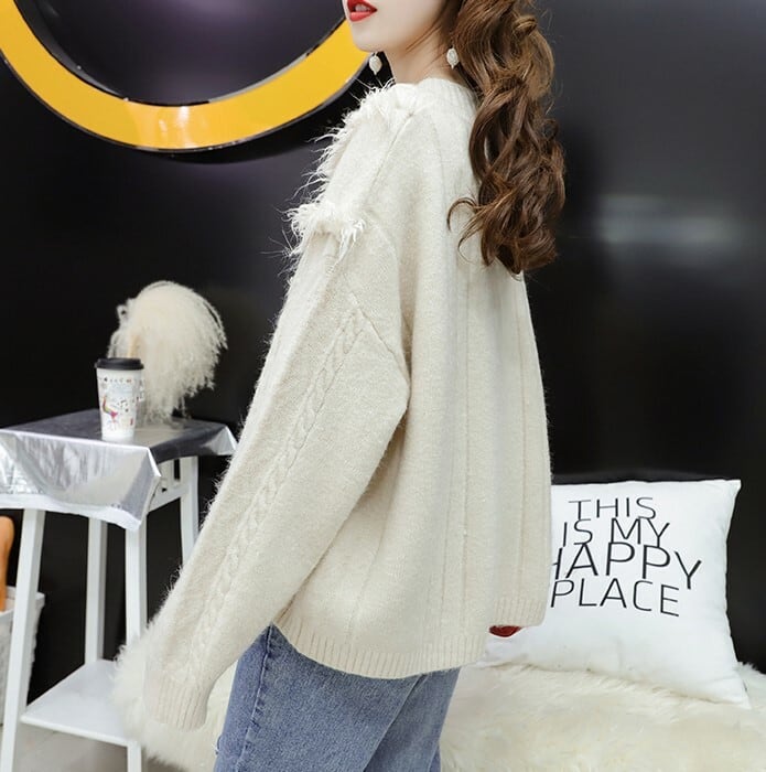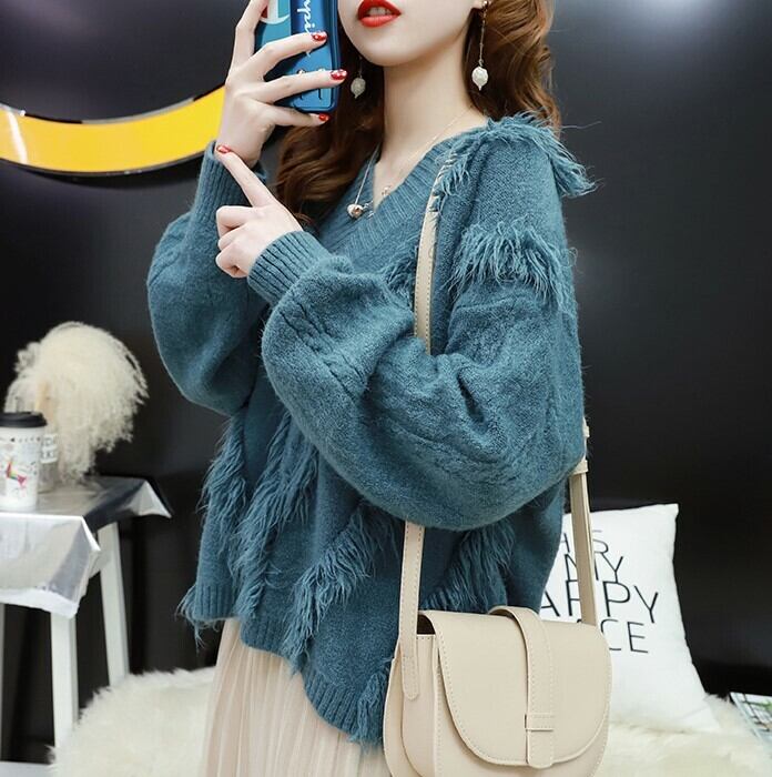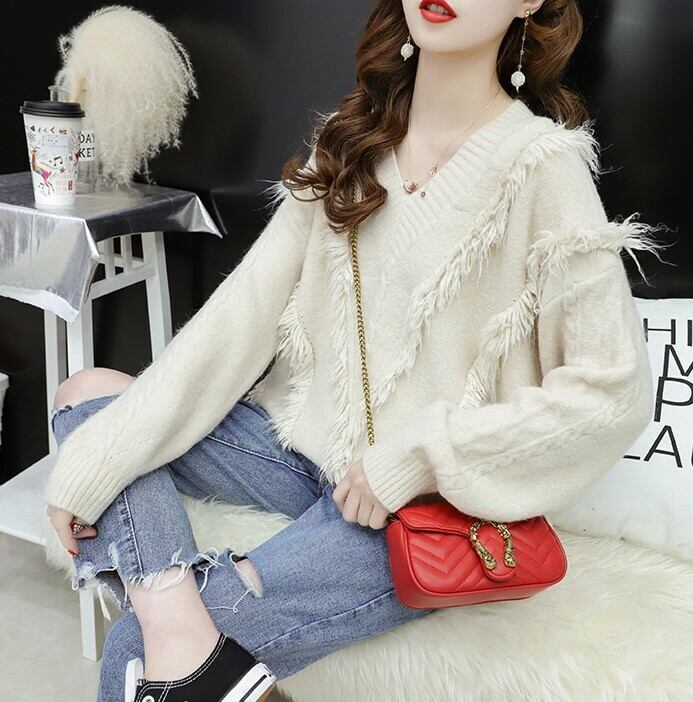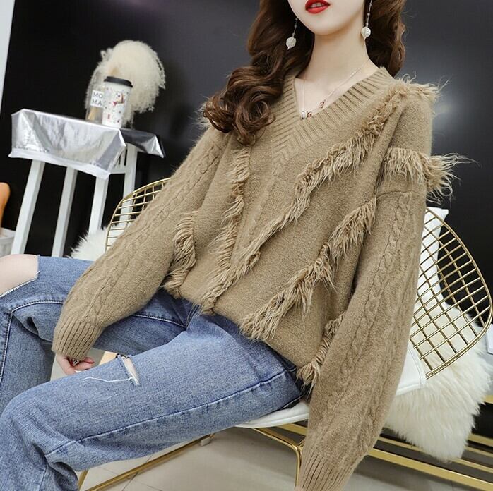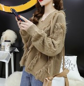 フリンジをあしらったボリューミーなVネックニット♪