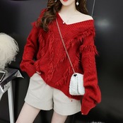 全4色 フリンジセーター ニット Vネック オフショルダー ドロップショルダー 長袖 トップス レッド ホワイト ブルー ベージュ 大人カジュアル ゆったり 秋 冬 韓国 オルチャン